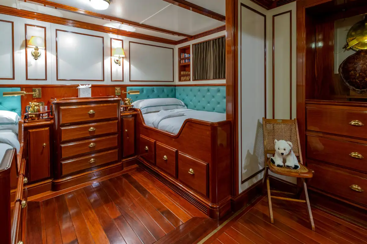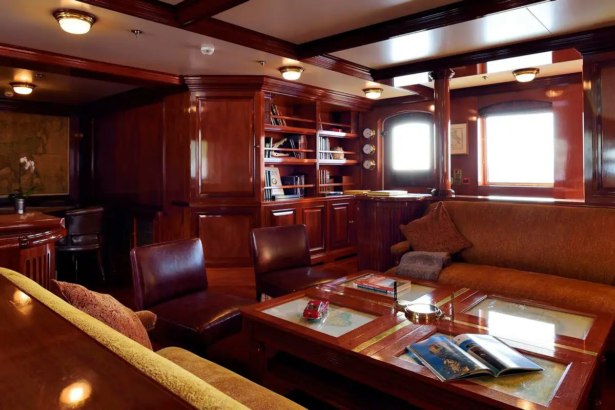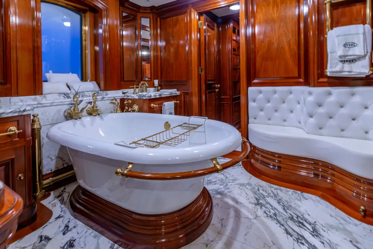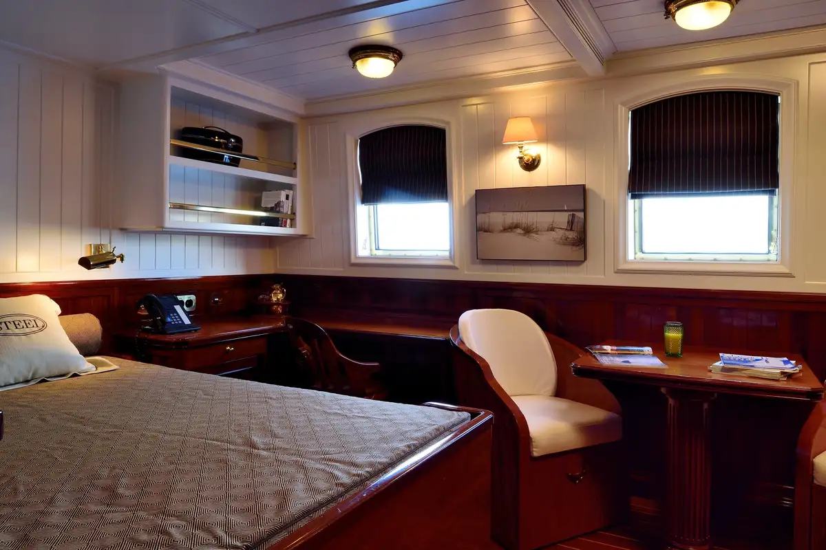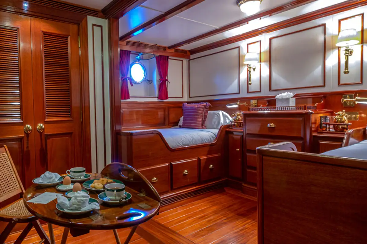 Back on board, head to the foredeck where an informal seating area provides a welcome retreat and a perfect place to enjoy sunset cocktails. Stepping inside to STEEL’s accommodation to freshen up you will find her harmonious and supremely classic interior warm and welcoming. With plentiful reception areas decorated with intricate wood panelling and lavish antique furnishings, they have the feel of a gentlemen’s club. Her accommodation, meanwhile, will ensconce you in luxury. Seven beautifully designed cabins consist of a master suite, a VIP suite and four twin cabins with Pullman berths. She also accommodates 12 crew, ensuring the ultimate charter experience and spectacular service at all times.