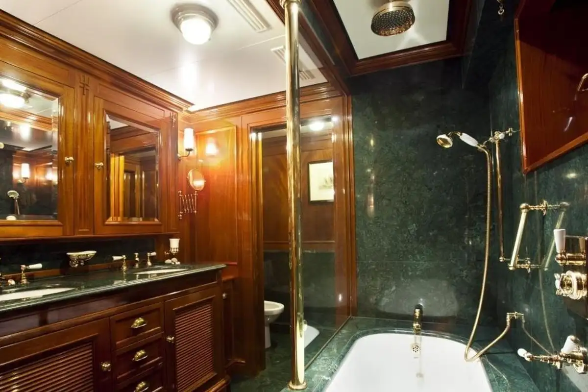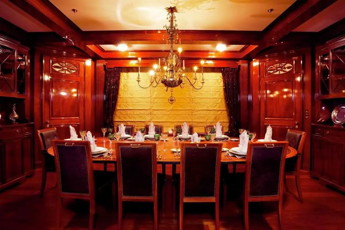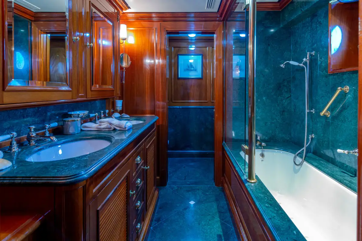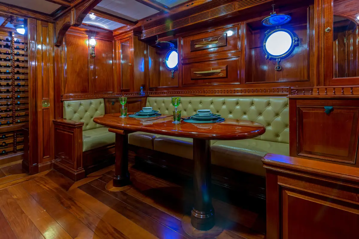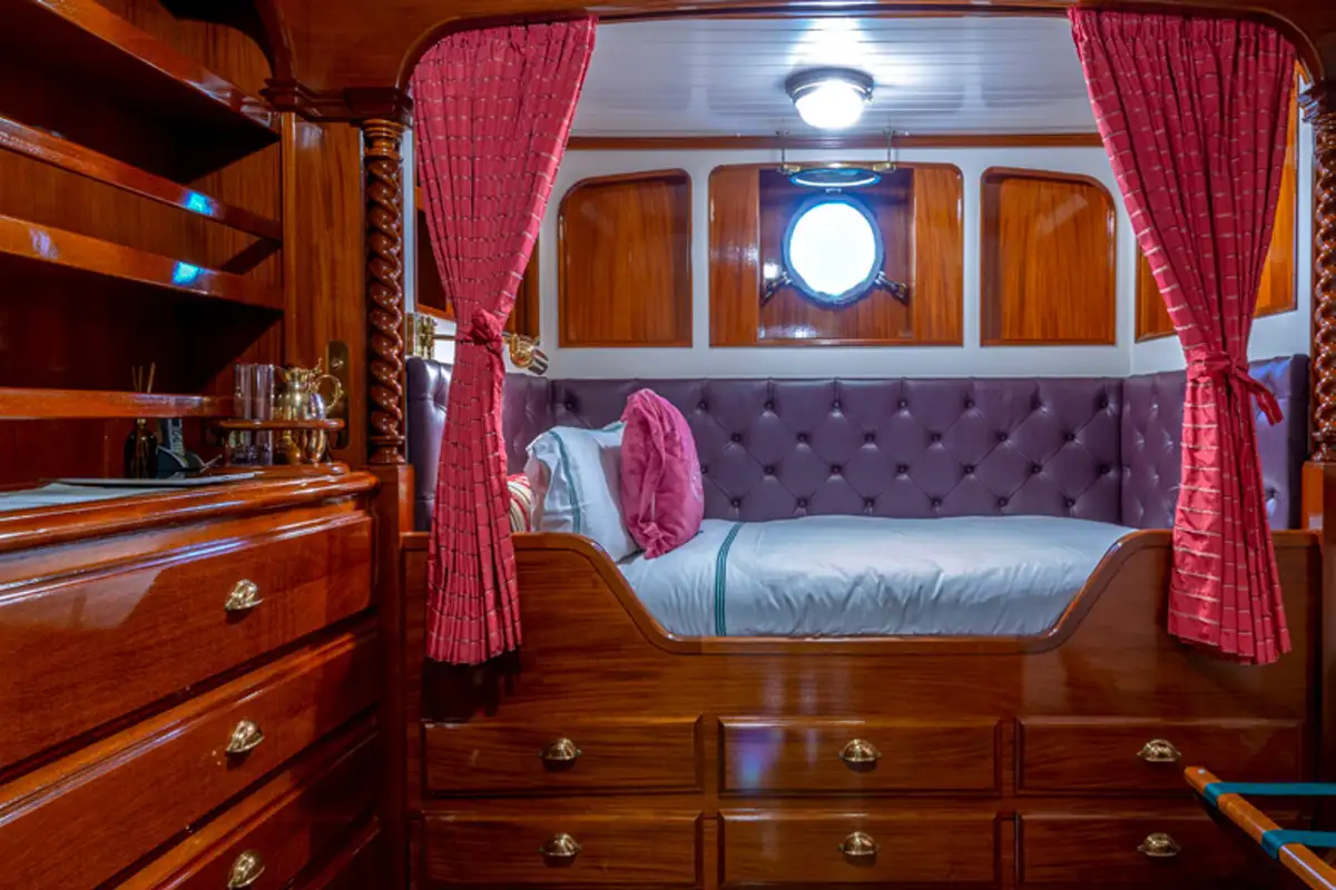 Back on board, head to the foredeck where an informal seating area provides a welcome retreat and a perfect place to enjoy sunset cocktails. Stepping inside to STEEL’s accommodation to freshen up you will find her harmonious and supremely classic interior warm and welcoming. With plentiful reception areas decorated with intricate wood panelling and lavish antique furnishings, they have the feel of a gentlemen’s club. Her accommodation, meanwhile, will ensconce you in luxury. Seven beautifully designed cabins consist of a master suite, a VIP suite and four twin cabins with Pullman berths. She also accommodates 12 crew, ensuring the ultimate charter experience and spectacular service at all times.