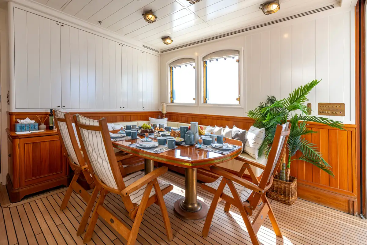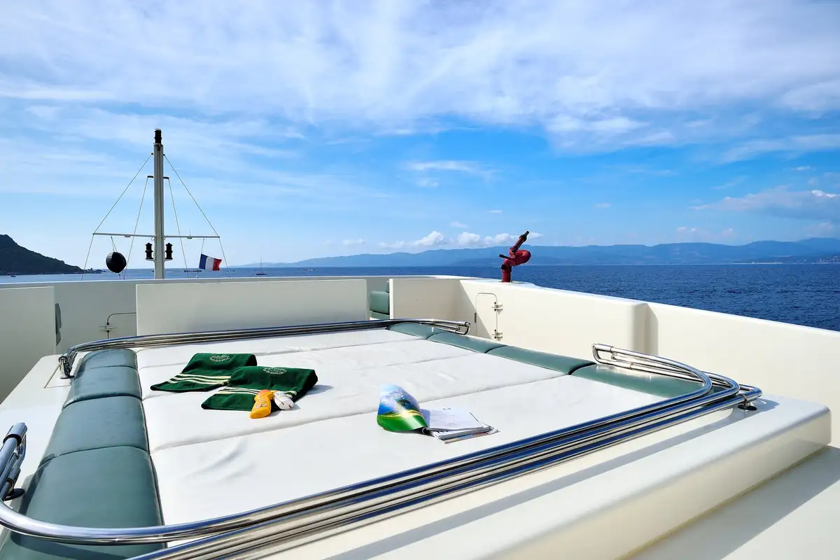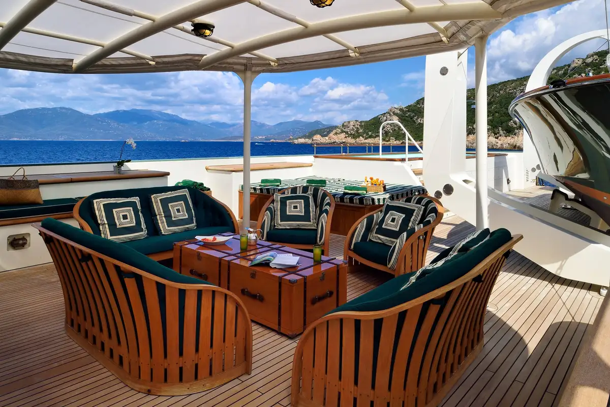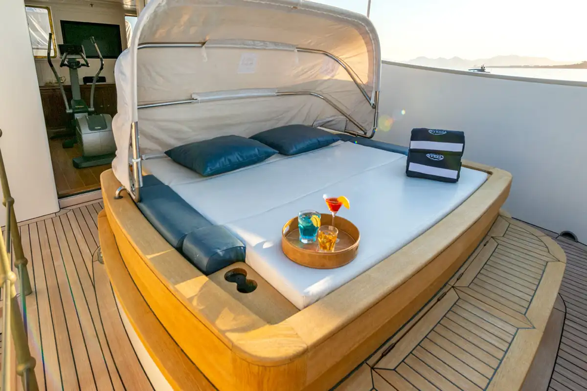 Come the afternoon, the main deck is the place to head for further relaxation. A large exterior lounge area and dining for up to 10 guests is sheltered from the elements and decorated in a traditional nautical style. While away a few hours here reading a book or simply catching up with fellow guests, until the hot sun begins to cool and you can enjoy the watertoys on offer. Her toybox carries both jetskis and towable toys, as well paddleboards and kayaks, allowing you to access secluded coves and explore the local coastline. All of her toys can also be accessed with great ease from an inflatable Aquaglide pontoon.