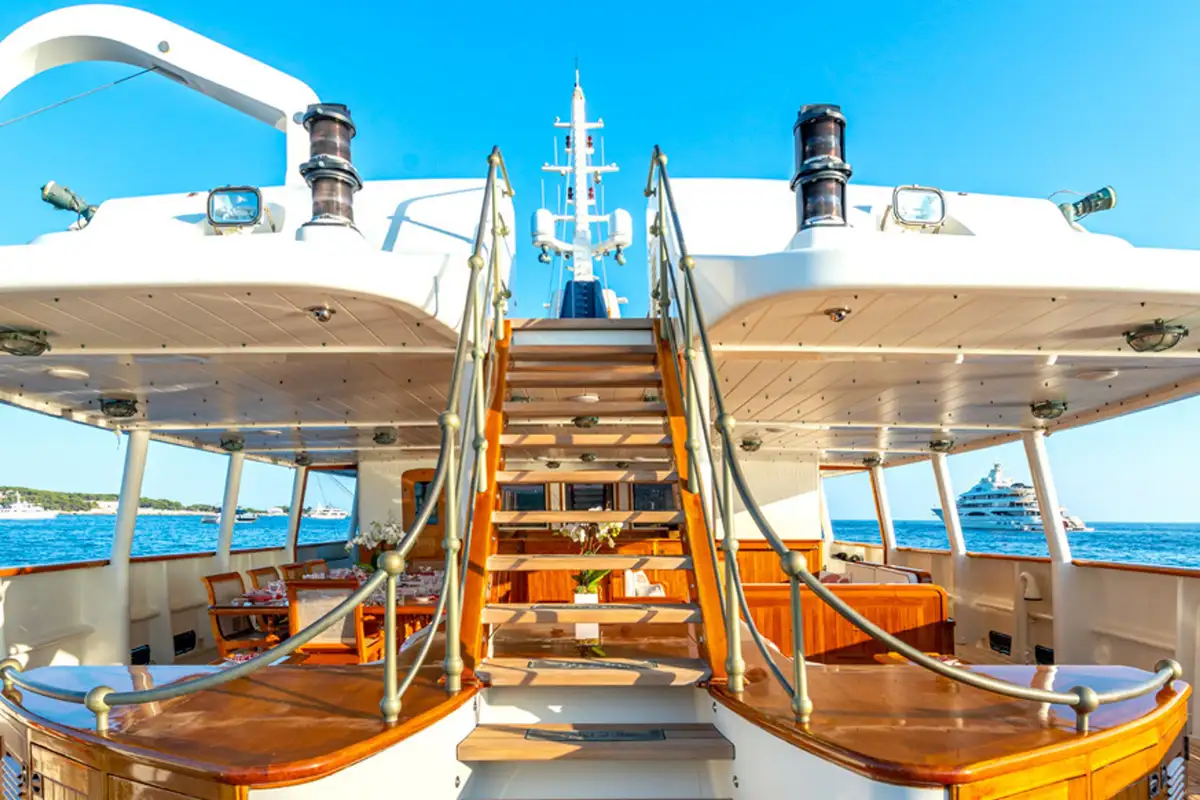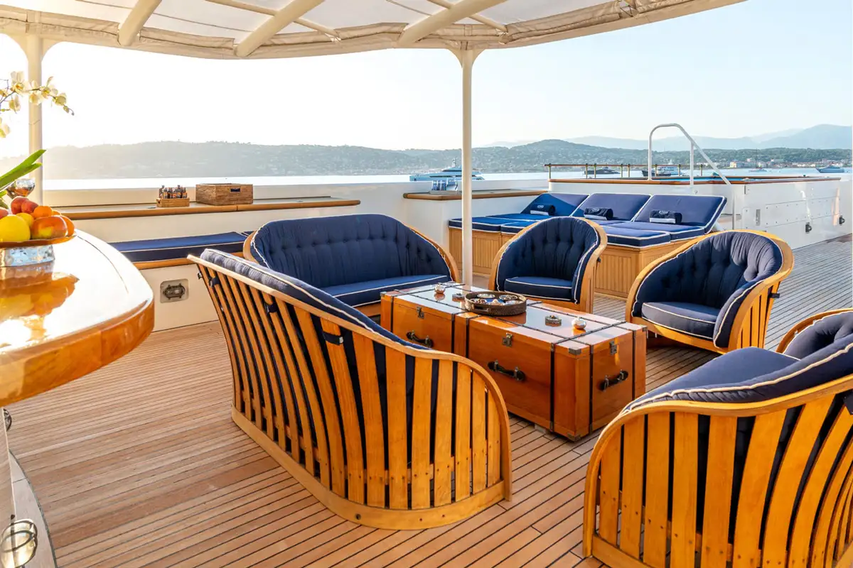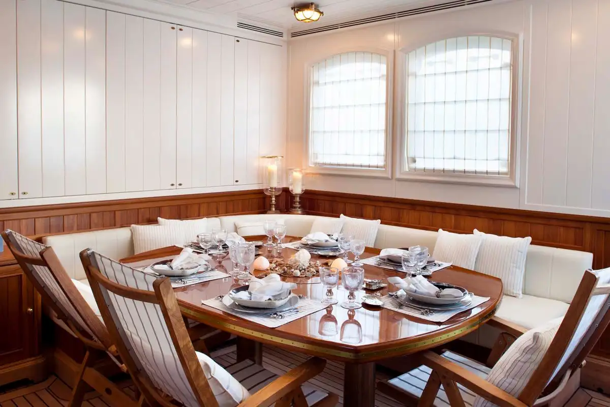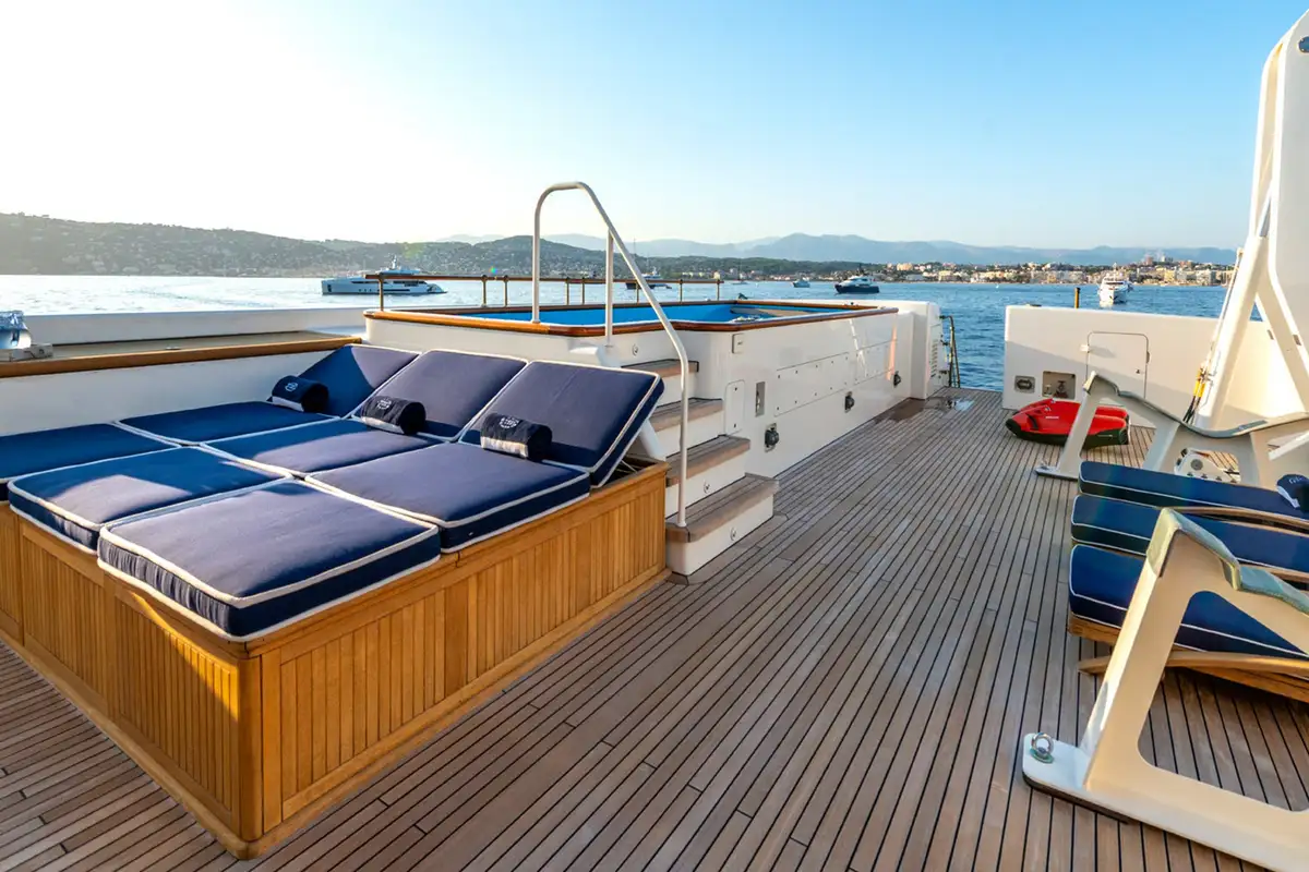 Come the afternoon, the main deck is the place to head for further relaxation. A large exterior lounge area and dining for up to 10 guests is sheltered from the elements and decorated in a traditional nautical style. While away a few hours here reading a book or simply catching up with fellow guests, until the hot sun begins to cool and you can enjoy the watertoys on offer. Her toybox carries both jetskis and towable toys, as well paddleboards and kayaks, allowing you to access secluded coves and explore the local coastline. All of her toys can also be accessed with great ease from an inflatable Aquaglide pontoon.