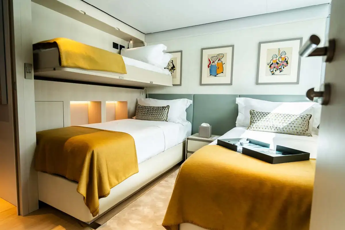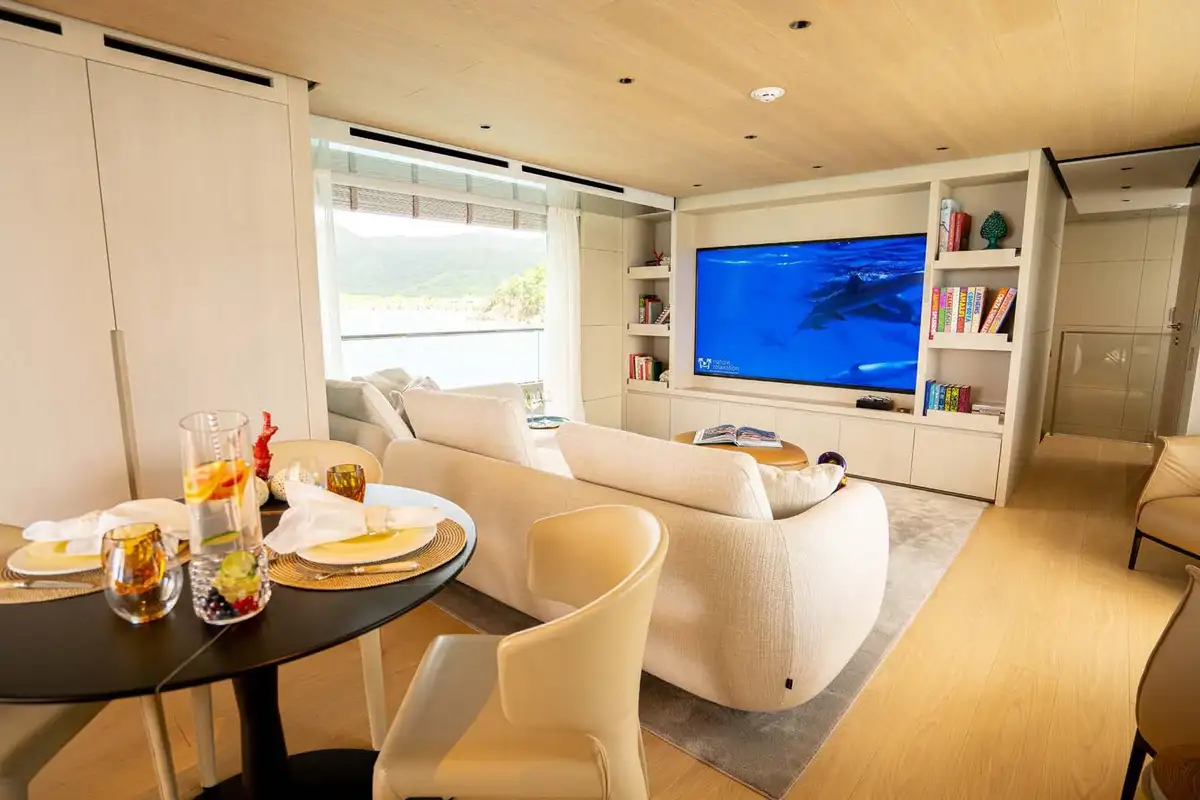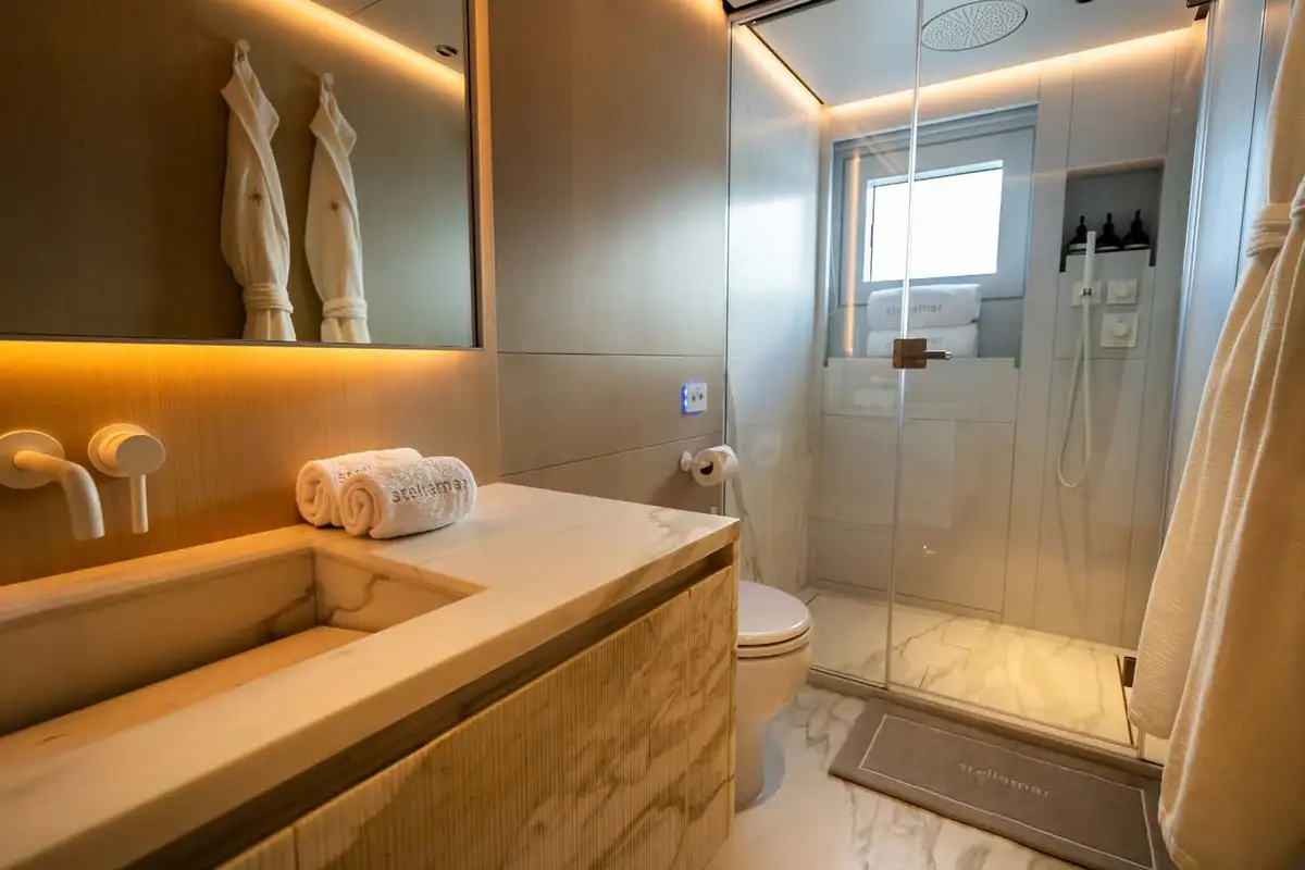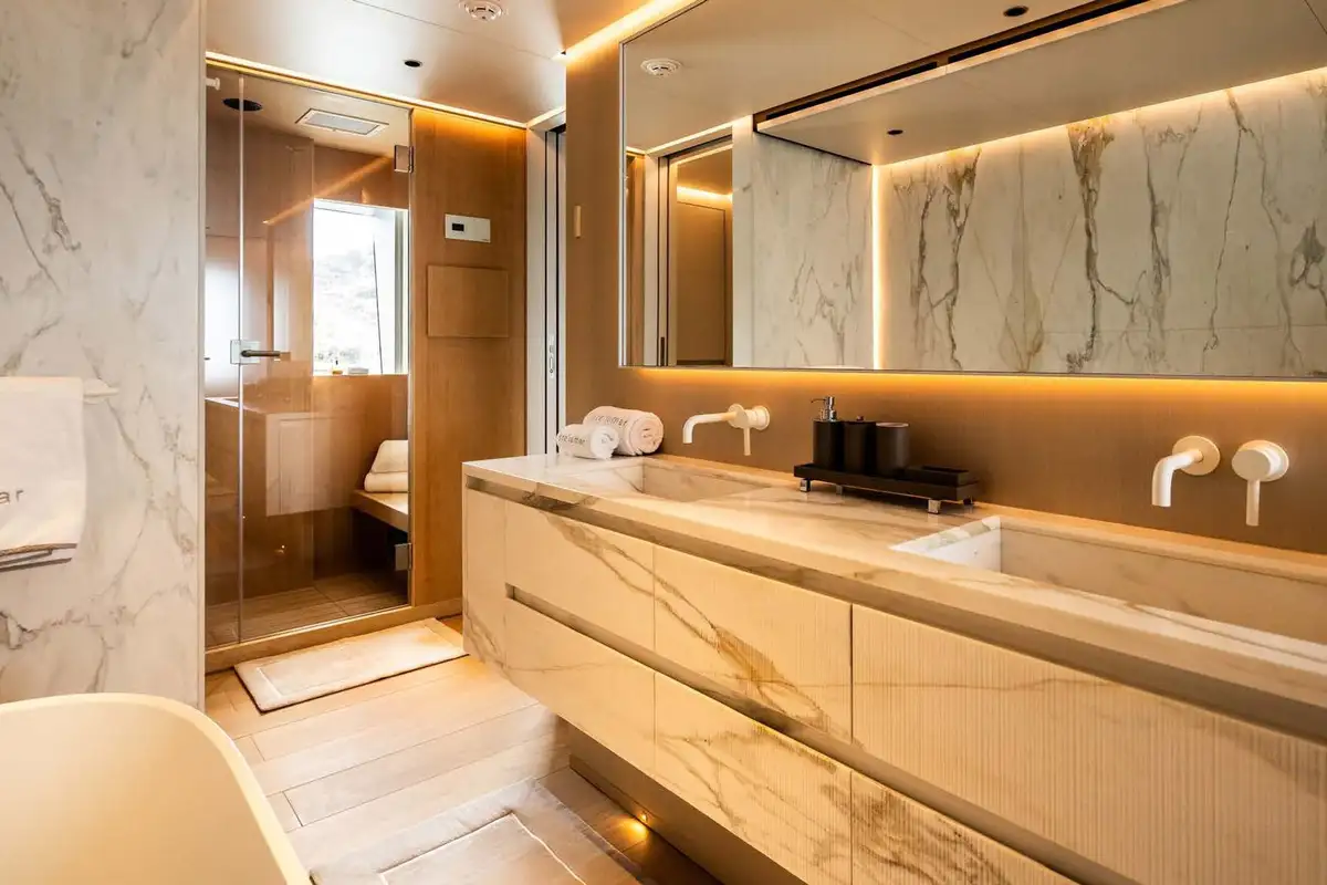 The exterior and interior design seamlessly blend traditional yacht aesthetics with cutting-edge solutions, offering optimal comfort and safety, with limitless cruising capabilities to the world’s most secluded destinations. With an emphasis on outdoor spaces, STELLAMAR's spacious lounging and dining areas on all decks invite you to bask in the sun and sea breeze, with the sundeck jacuzzi providing an excellent vantage point for spectacular views while at anchor. Even when relaxing in the interior spaces, the vast windows in the main and upper salons ensure a constant connection to the natural environment. Up to twelve guests are accommodated in five modern ensuite cabins with vast windows for optimal natural light. The four guest cabins are located on the lower deck, while the master stateroom on the main deck forward offers a private haven and includes a walk-in wardrobe and private study. The master ensuite features his and hers sinks, separate heads, a full-length bath, shower, and a sauna. The experienced crew of seven enjoys comfortable quarters on the lower deck, ensuring seamless service throughout the voyage.