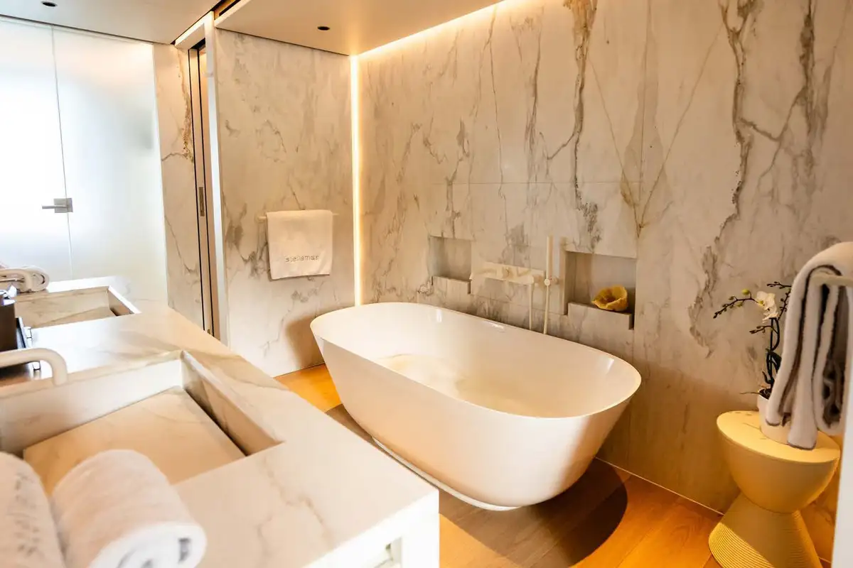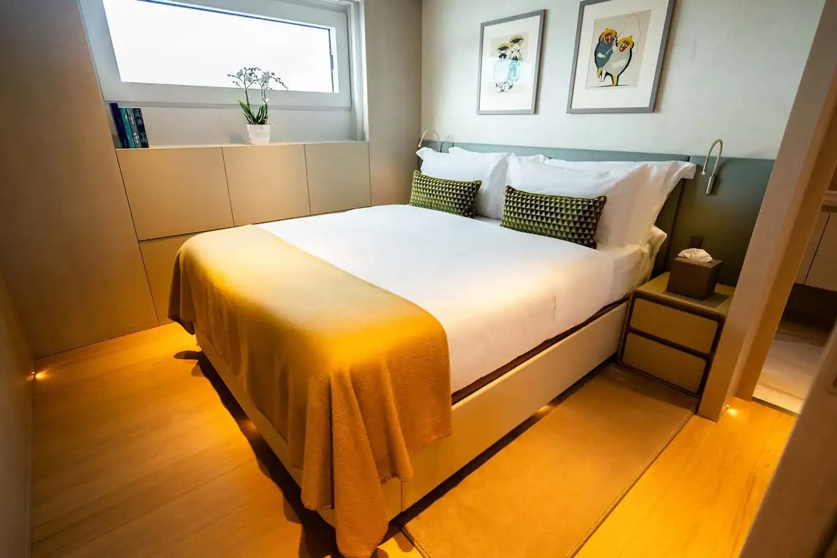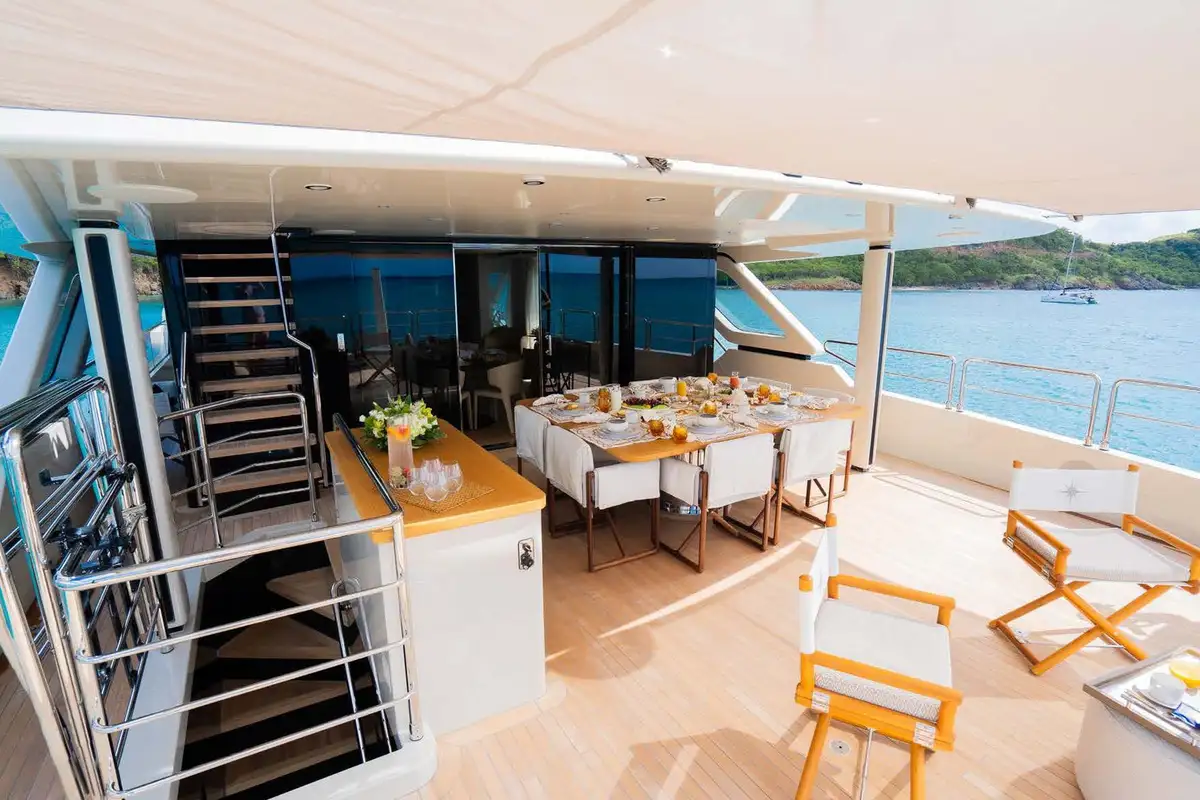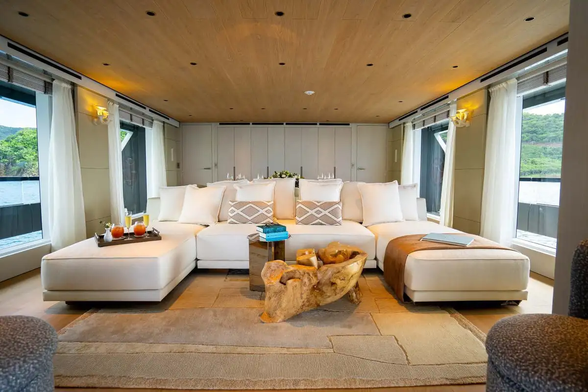The exterior and interior design seamlessly blend traditional yacht aesthetics with cutting-edge solutions, offering optimal comfort and safety, with limitless cruising capabilities to the world’s most secluded destinations. With an emphasis on outdoor spaces, STELLAMAR's spacious lounging and dining areas on all decks invite you to bask in the sun and sea breeze, with the sundeck jacuzzi providing an excellent vantage point for spectacular views while at anchor. Even when relaxing in the interior spaces, the vast windows in the main and upper salons ensure a constant connection to the natural environment. Up to twelve guests are accommodated in five modern ensuite cabins with vast windows for optimal natural light. The four guest cabins are located on the lower deck, while the master stateroom on the main deck forward offers a private haven and includes a walk-in wardrobe and private study. The master ensuite features his and hers sinks, separate heads, a full-length bath, shower, and a sauna. The experienced crew of seven enjoys comfortable quarters on the lower deck, ensuring seamless service throughout the voyage.