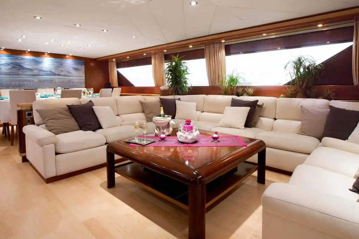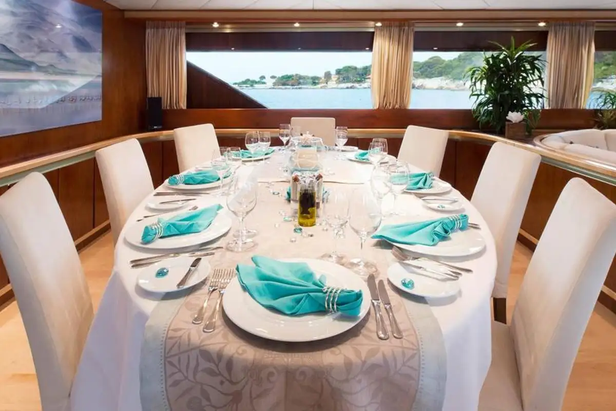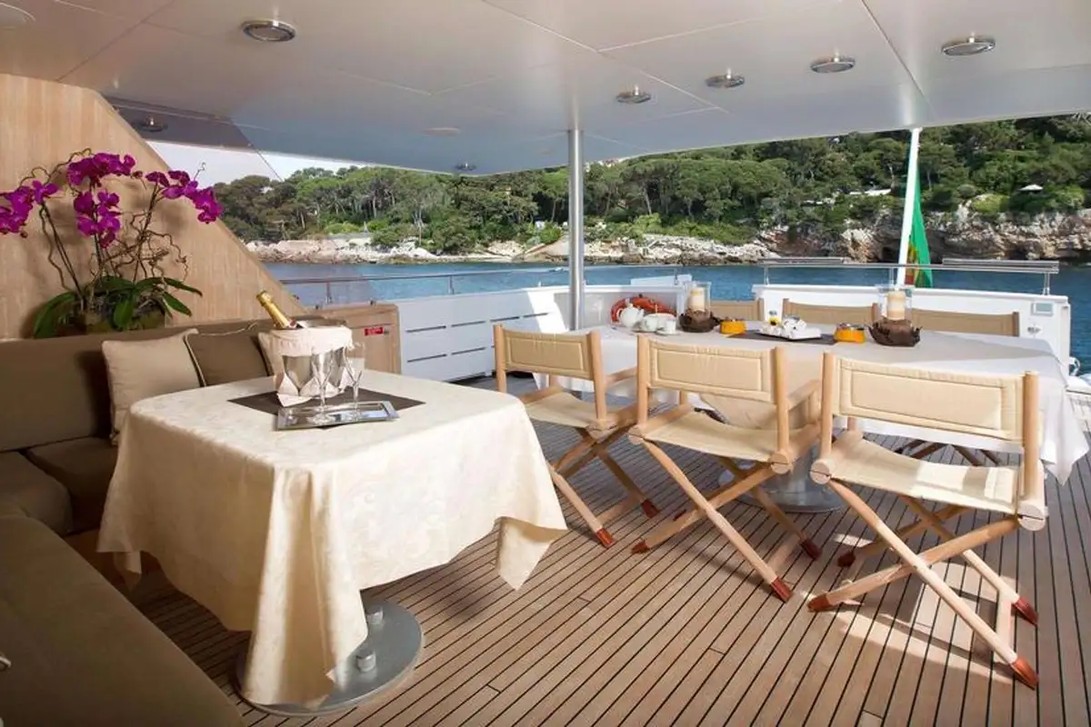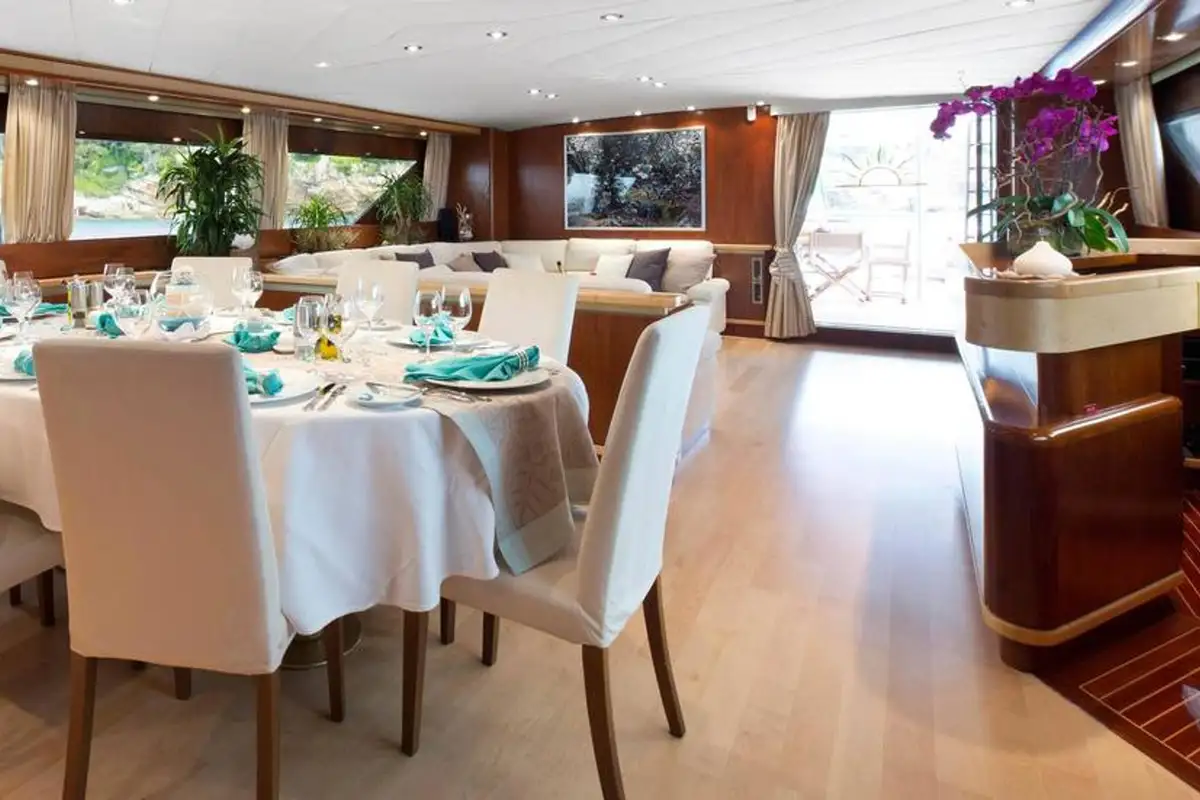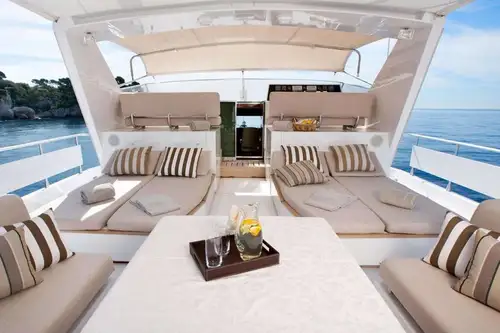 The main lounge is a relaxing space. With a wet bar area between the formal dining area and the lounge space, cocktail refills are never far away. The U-shaped sofa creates a social space for pre- or post-dinner conversation. Exiting the main lounge into the cockpit, there is a sheltered al fresco formal dining area. There's a dinette on the sundeck, perfect for informal meals, snacks, or light lunches, and it's close to three large sunpads.