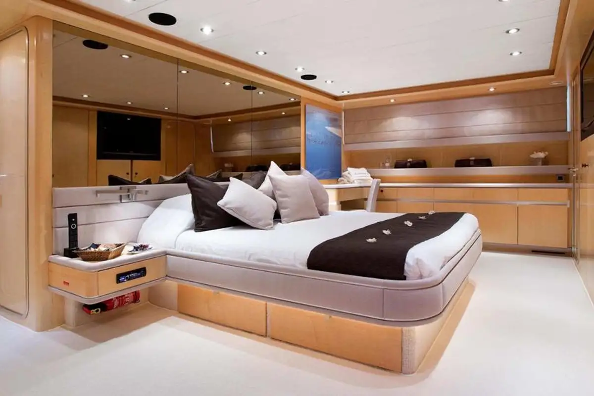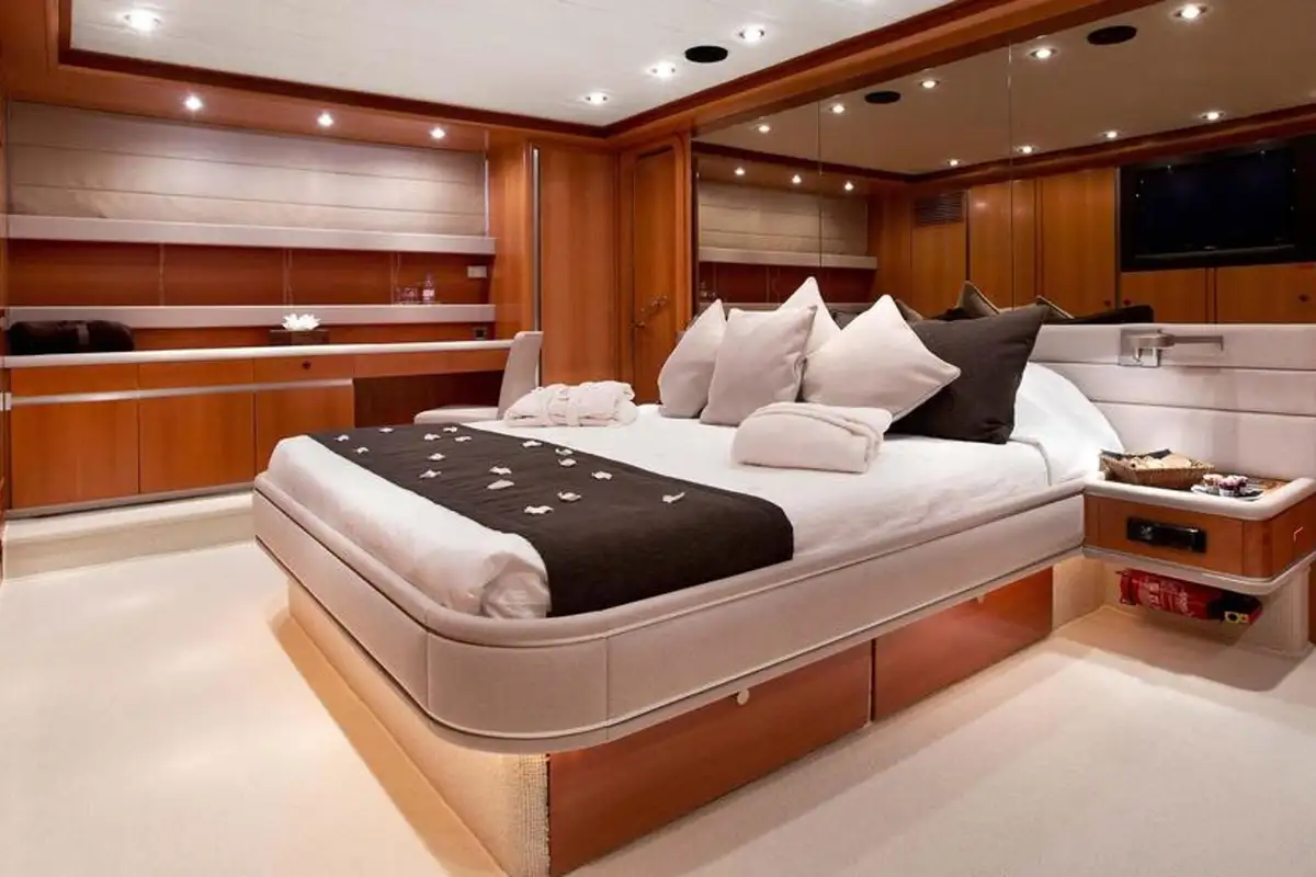 The charming accommodation is found on the lower deck. As the primary guest, you’ll enjoy the full-beam master suite accessed via the same private staircase as the double VIP suite just ahead. In your suite, you’ll discover a walk-in wardrobe, a writing desk, and an en suite bathroom. To the rear, via a separate staircase, there is a twin-berth suite and a double suite. Bringing the total to four suites and accommodation for eight guests to stay on board.