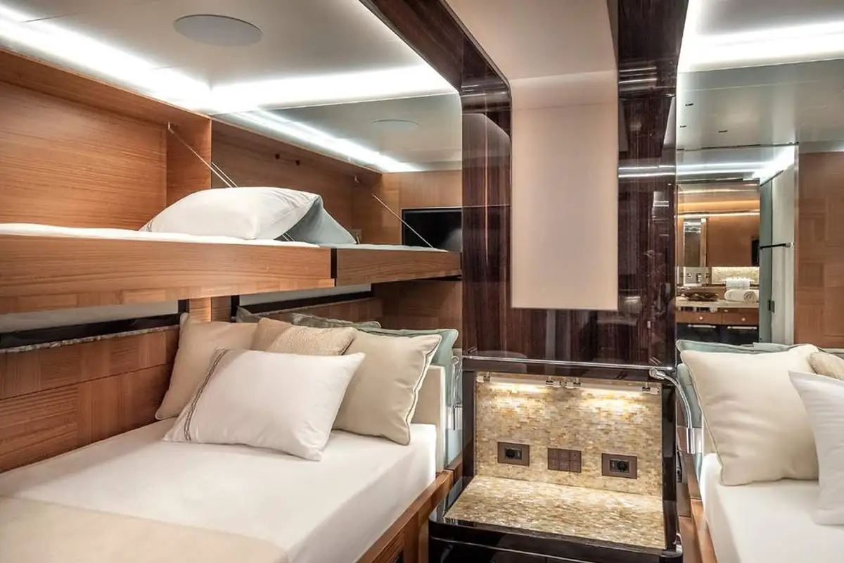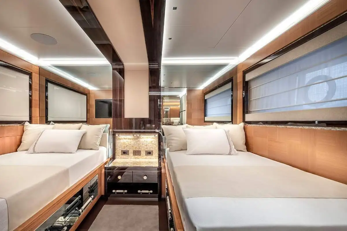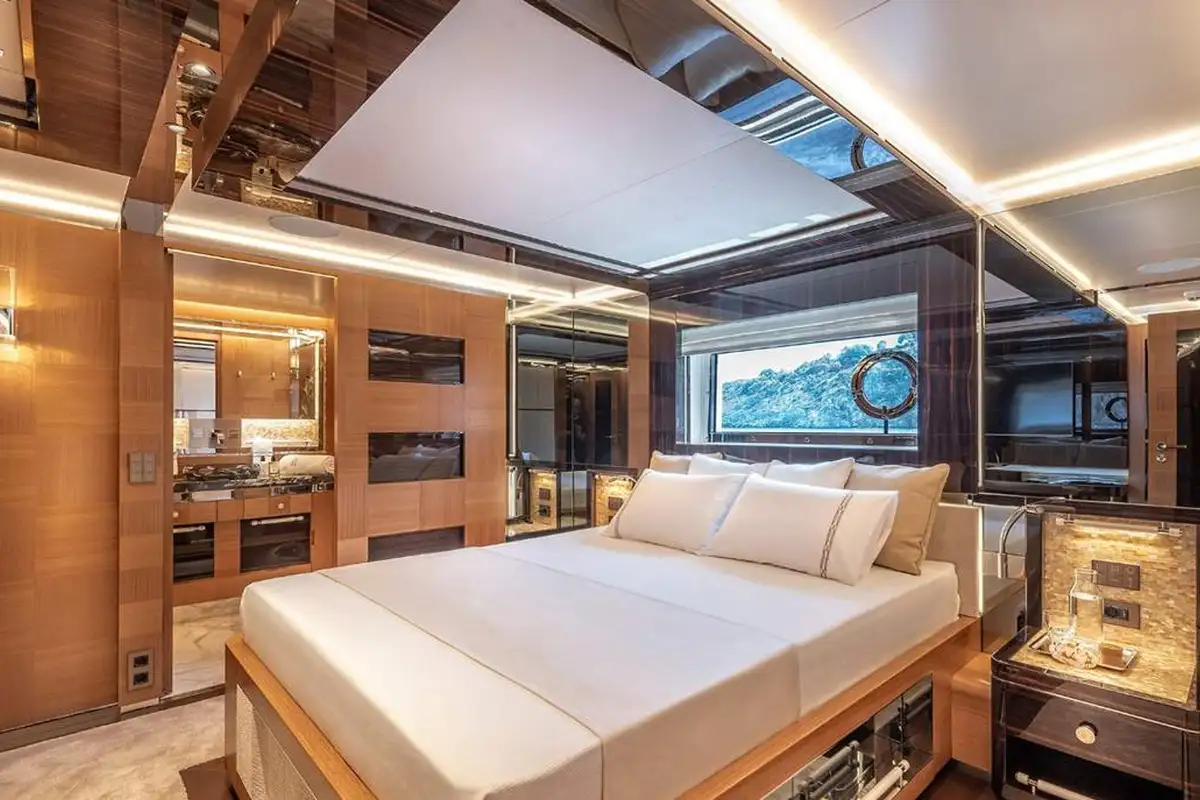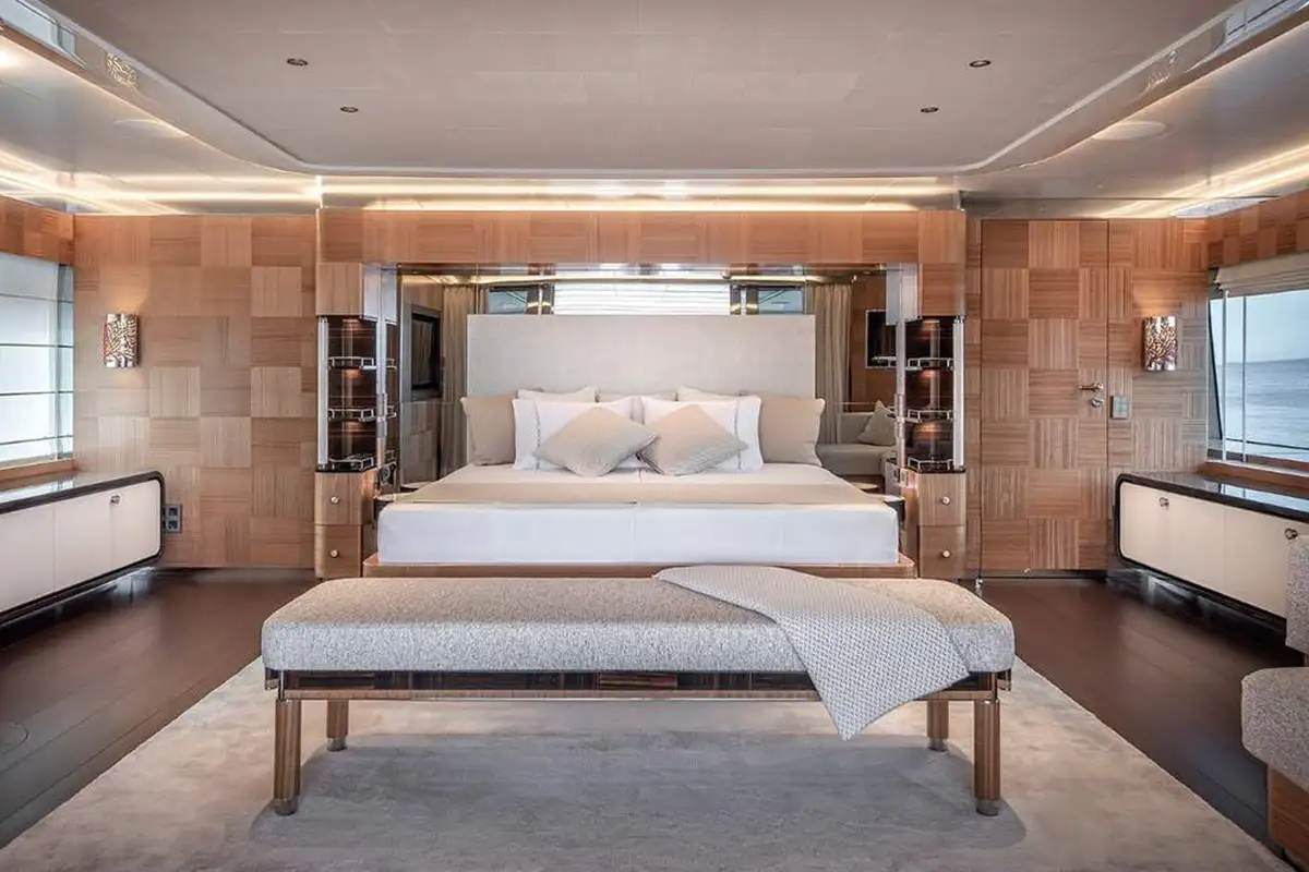 SUNRISE sleeps up to 12 guests across 5 cabins, featuring a master suit on the upper deck with not only private access but also a stunning panoramic view looking over the aft deck. Another special feature on SUNRISE is the not one, but two VIP cabins. The cabins are all appointed in a stunning ebony with bespoke detailing and woodwork throughout.