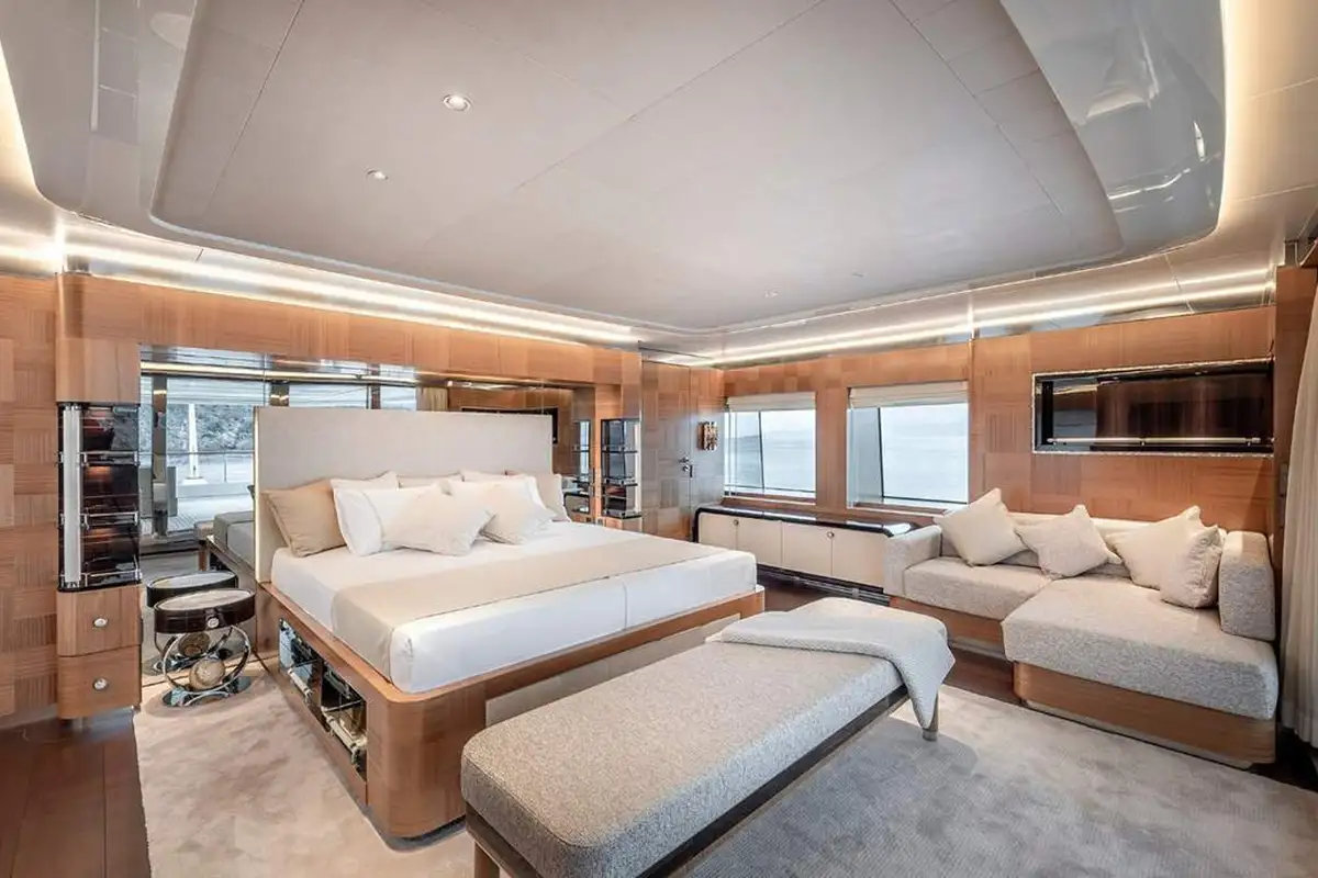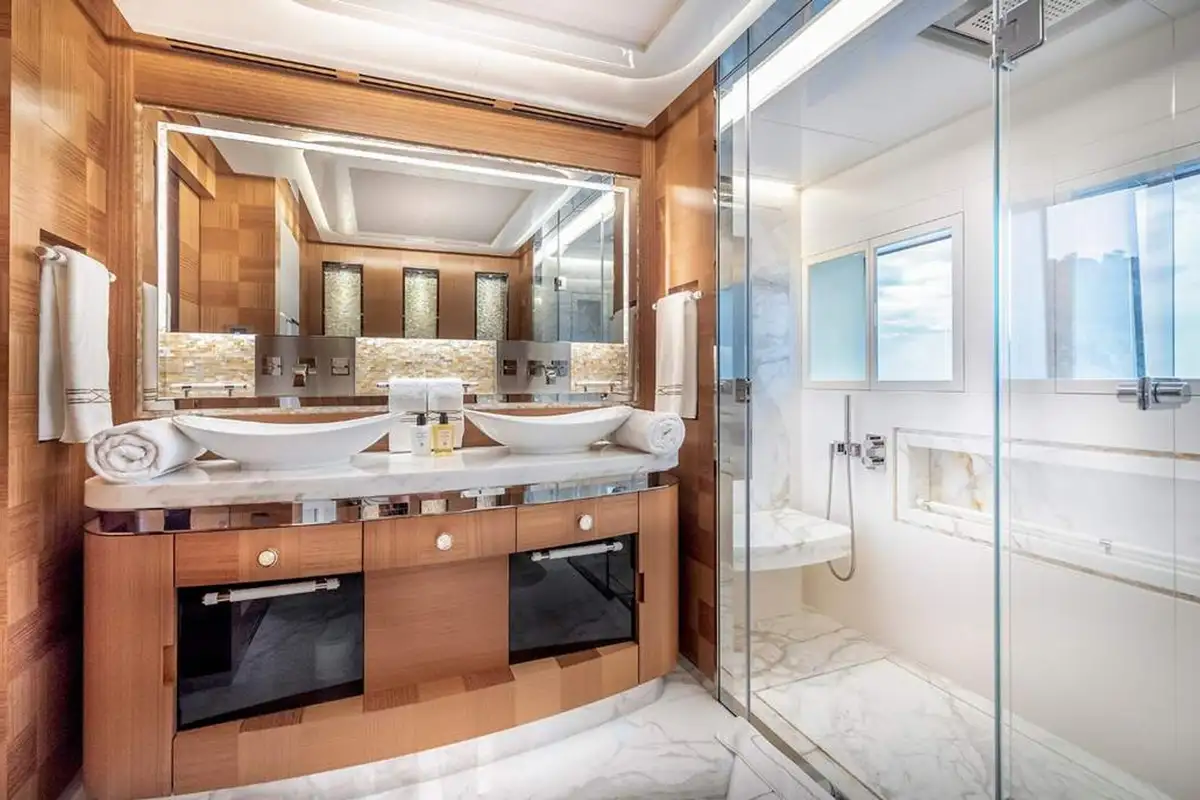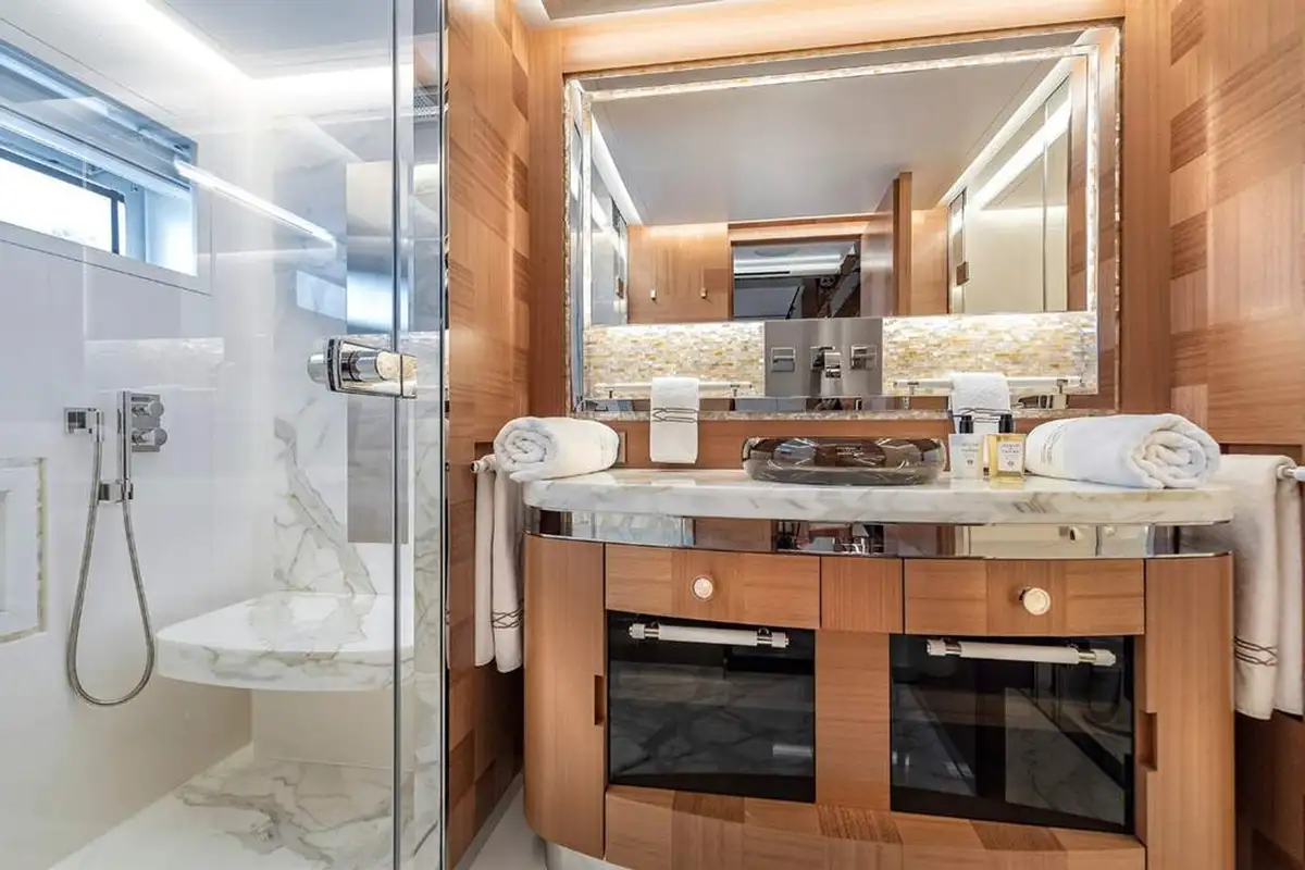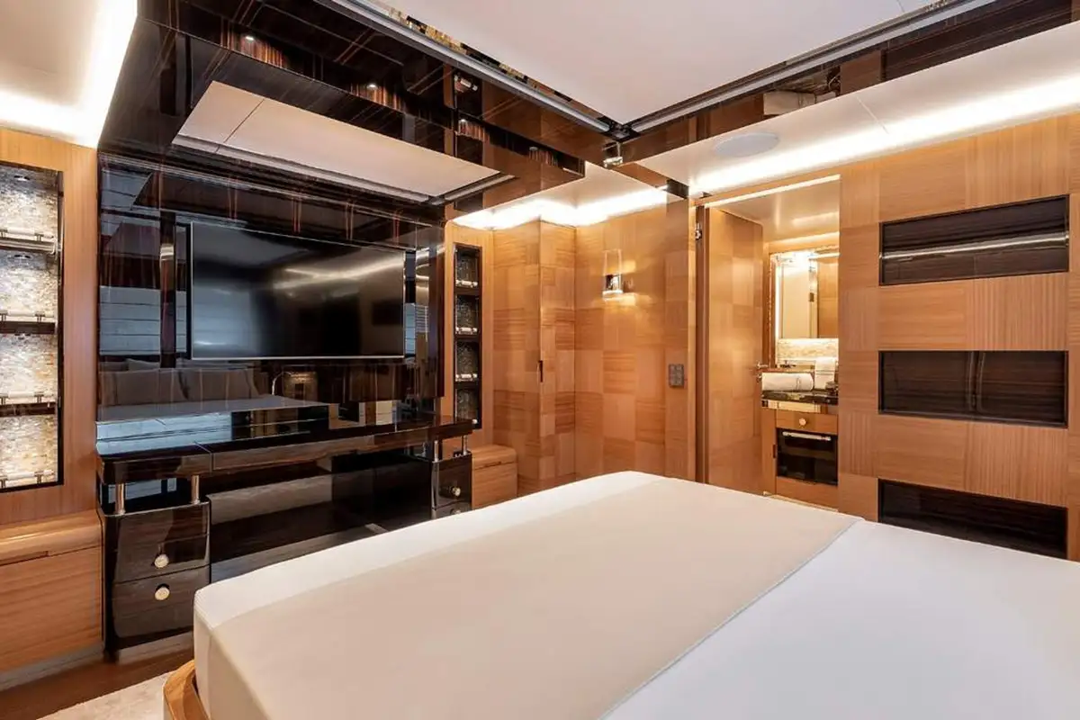 SUNRISE sleeps up to 12 guests across 5 cabins, featuring a master suit on the upper deck with not only private access but also a stunning panoramic view looking over the aft deck. Another special feature on SUNRISE is the not one, but two VIP cabins. The cabins are all appointed in a stunning ebony with bespoke detailing and woodwork throughout.
