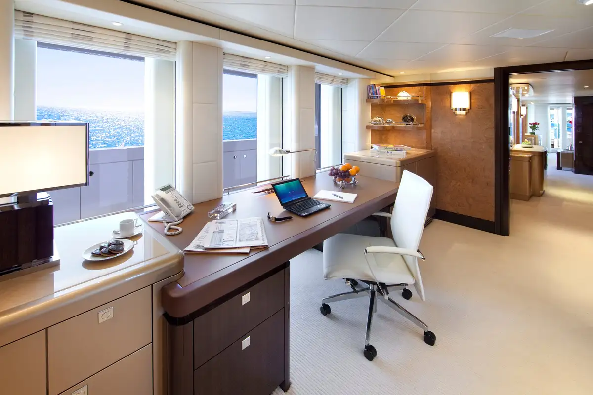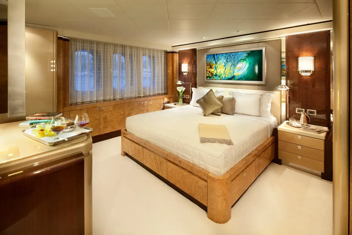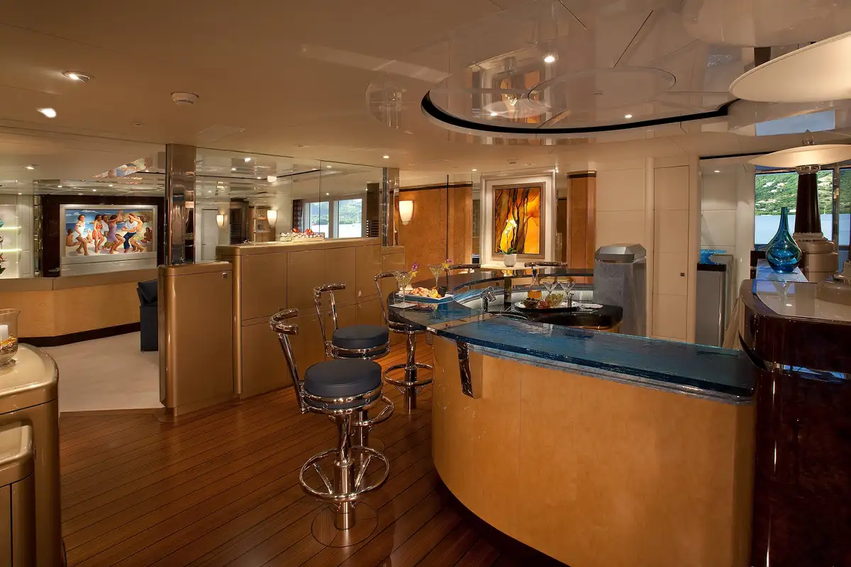 For privacy, the Portuguese bridge’s deck lounge features plush sofas and a triple sun pad, while the inner sanctuary of the lounge is hard to beat for a morning coffee, with music from the piano and uninterrupted seascape views. SYCARA V’s elegant, modern decor is bright and tasteful, with her zero speed stabilisers ensuring comfort at anchor.