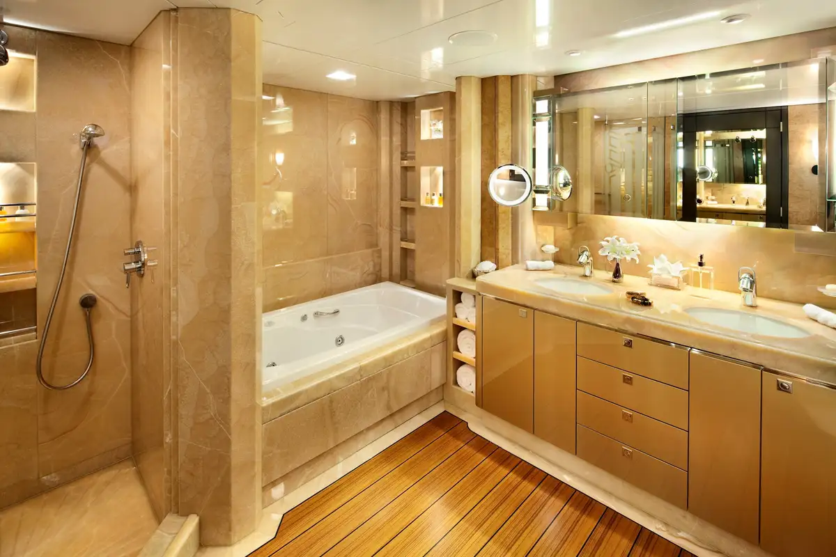 As day turns into evening, head to your cabin to change. The master suite is like a deluxe penthouse, spanning the upper deck’s aft section with impressive views through sliding glass doors, leading to the private deck with its table for 12. The his and hers onyx bathroom has a steam shower and jacuzzi, and there is a study and adjacent single cabin with pullman for staff or children. Guest accommodation on the lower deck includes four double cabins, two with pullman berths, and a single cabin with a pullman berth.