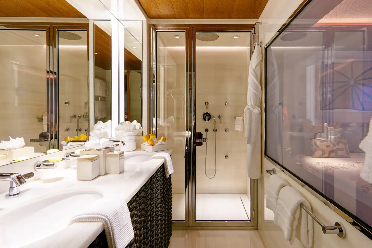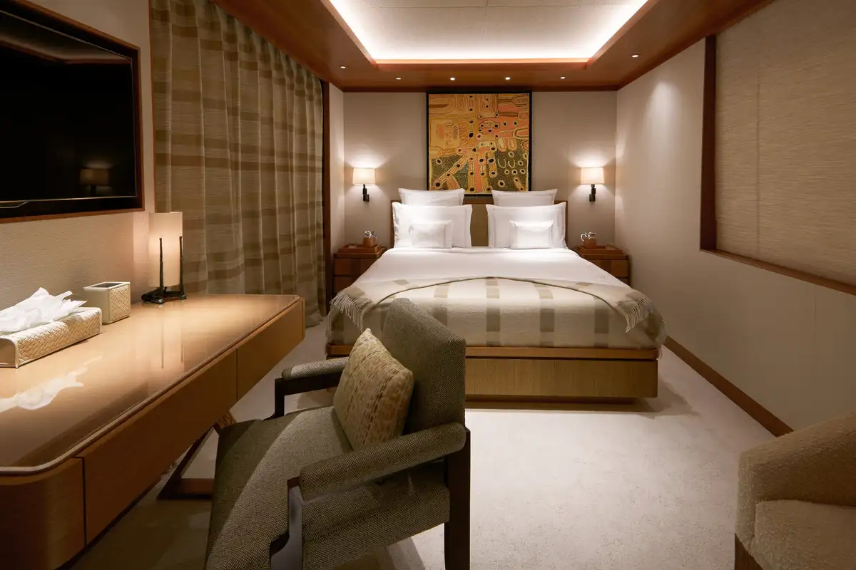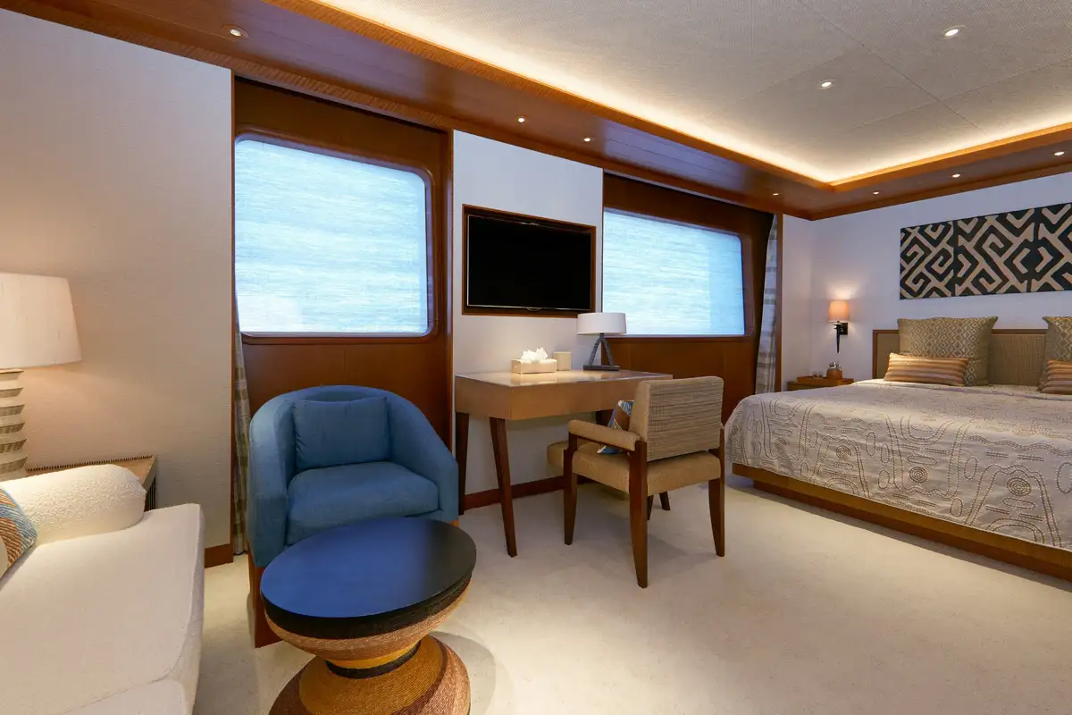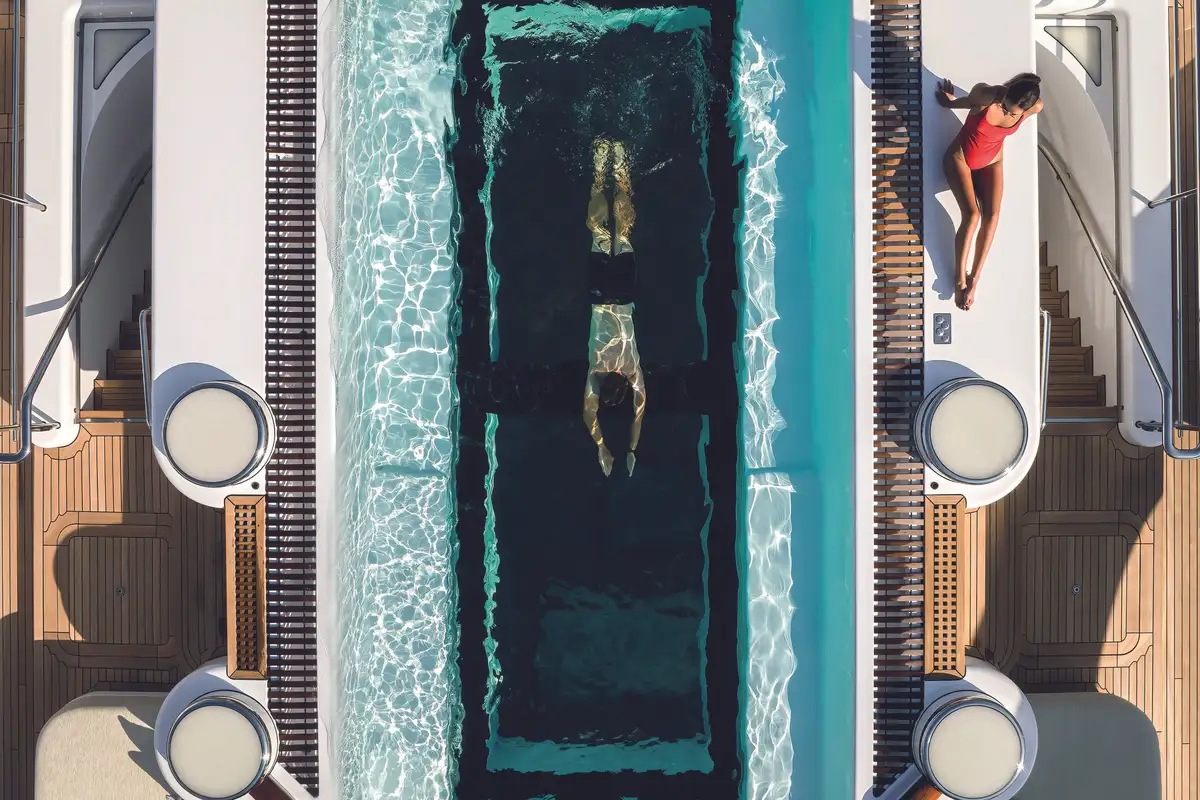 Catch the sunrise from the comfort of the sun deck lounge, before taking a refreshing dip either in the six metre glass-bottomed pool, or in the ocean via the swim platform. Take breakfast on the bridge deck, where an outdoor lounge area and large dining table provide ample seating and a great place to plan your day.