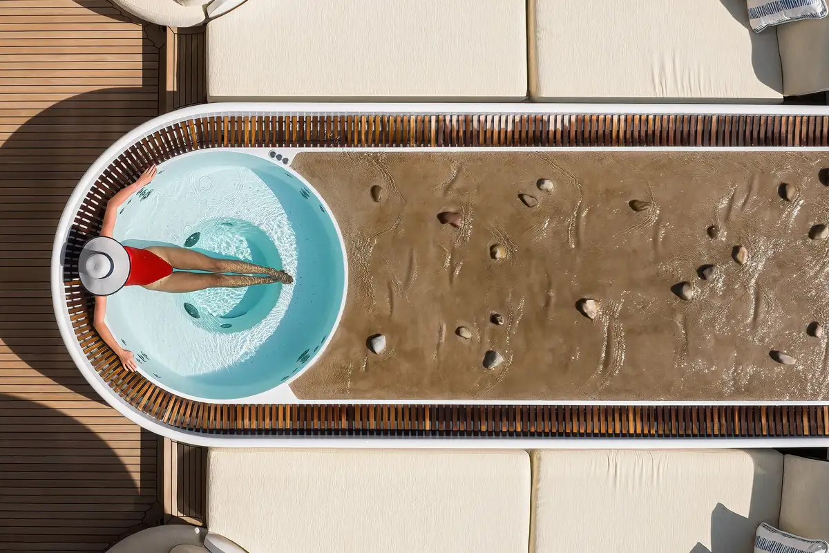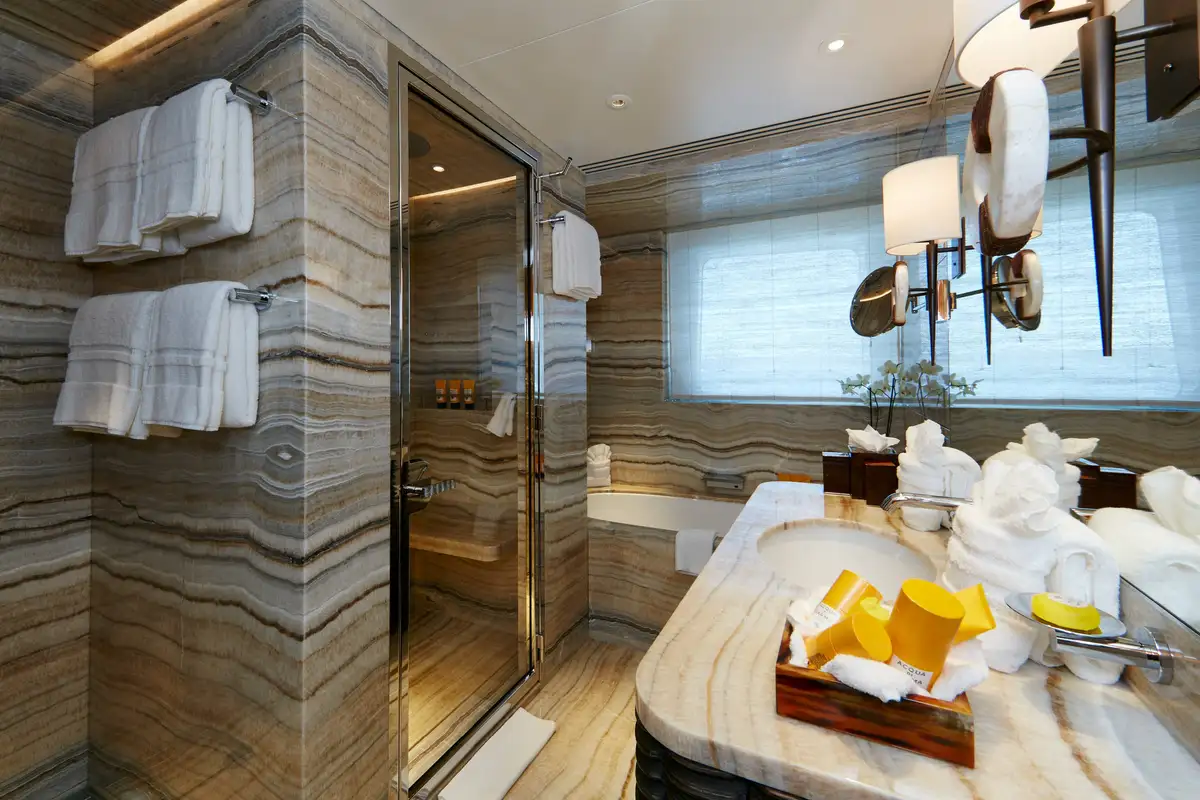Lunch is served at the Teppanyaki bar on the sun deck, after which it’s time to try SYMPHONY’s numerous watertoys. Spend the afternoon discovering the coastline aboard her jetsurfs and jetskis or messing about with her numerous towable toys. SYMPHONY’s 30-strong crew will be on hand to help you master the skills required.