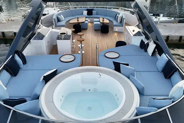 During the day, the foredeck features an inviting forward-facing al fresco lounge with sunpads – ideal for unhurried mornings or sunset aperitifs – while the cockpit provides a sociable dining space with views that stretch to the horizon. On the sun deck, a centreline jacuzzi is flanked by generous sunpads, a wet bar, and a semi-circular seating area, making it a favourite spot for informal meals, morning coffee or cocktails under the stars.