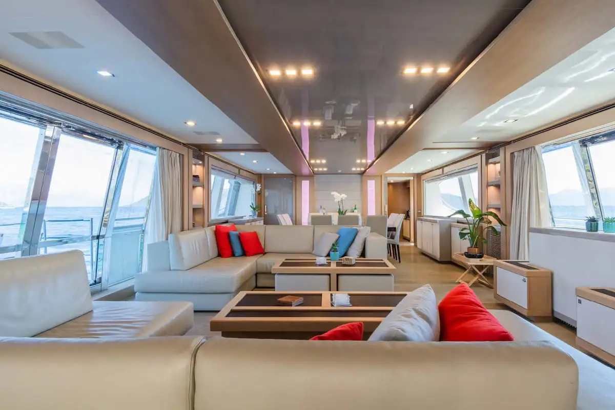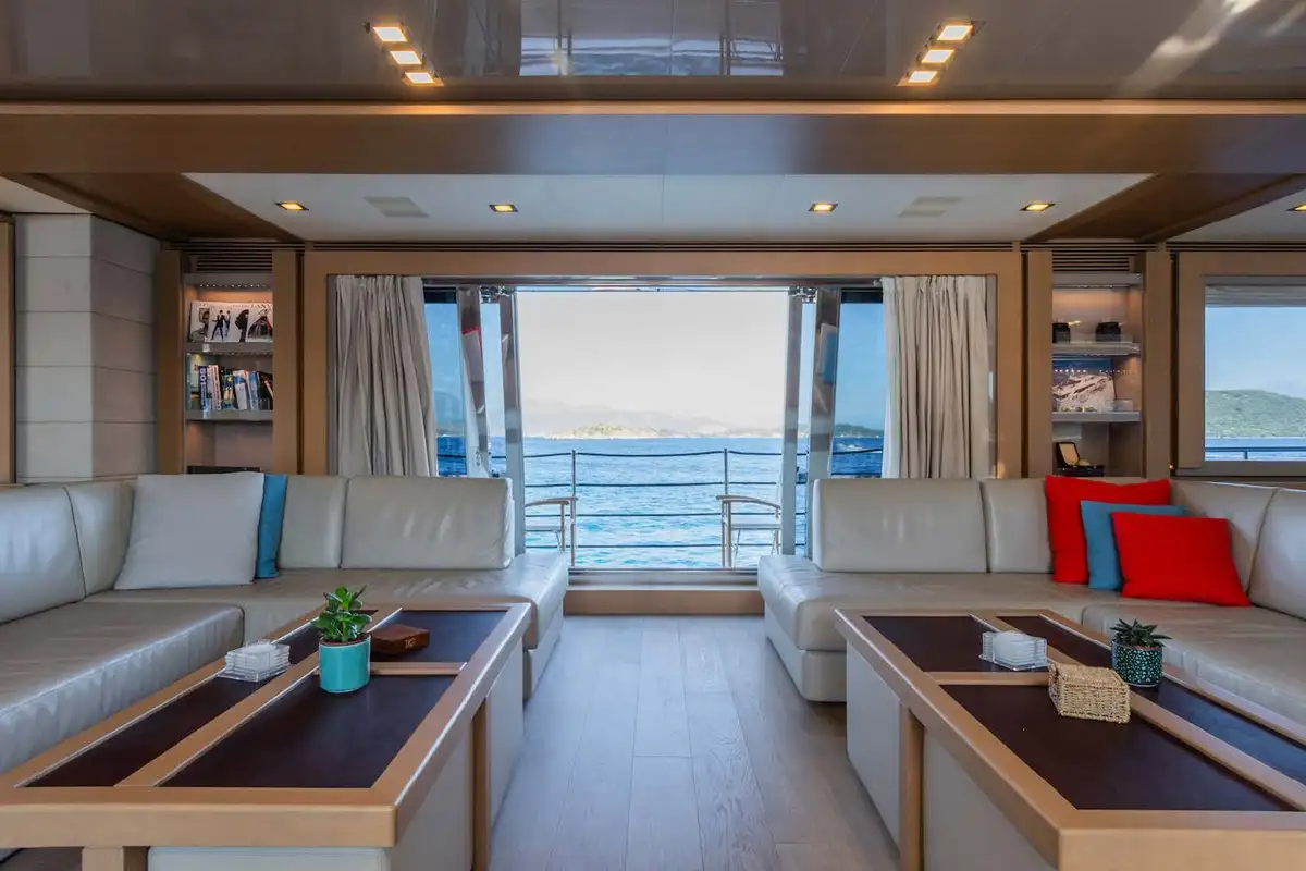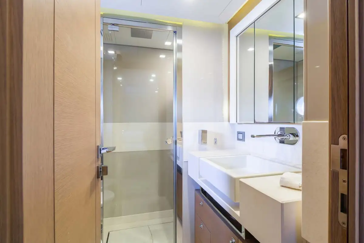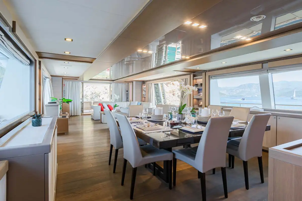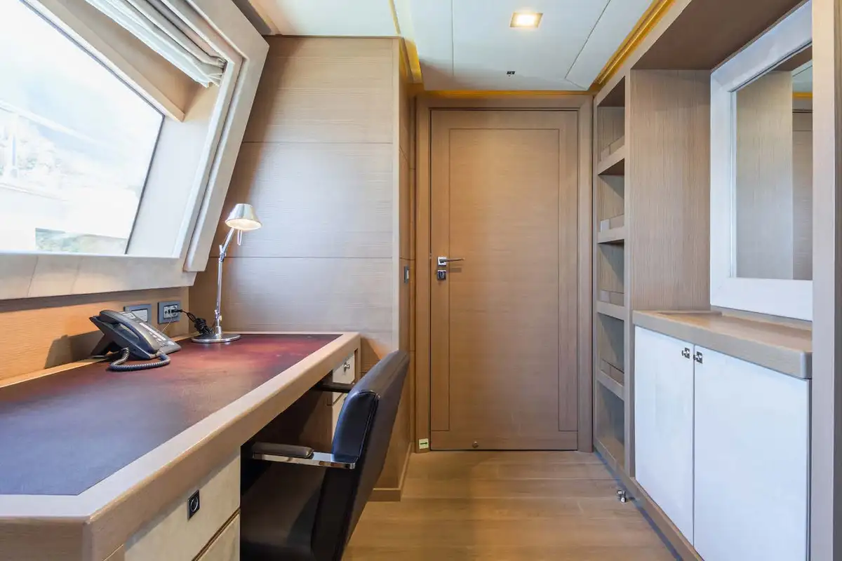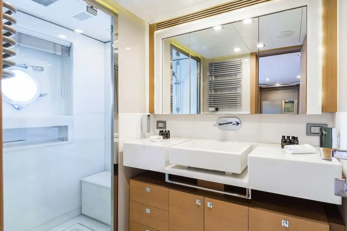 The luxurious master suite is on the main deck, and accessed via a private office. In this sumptuous secluded space, you have the convenience of his and hers walk-in wardrobes, and a vast en suite bathroom – with spa bath and a monsoon shower. More guest suites are found on the lower deck. There’s a choice between two double VIP suites, and a double berth and twin-berth suites that offer additional pullman berths. Whichever suites your guests choose, they’ll have en suite facilities and lavish space to unwind and revitalize.