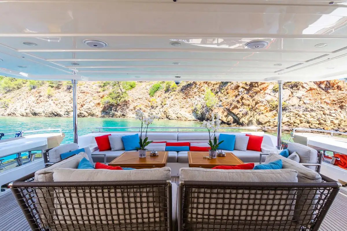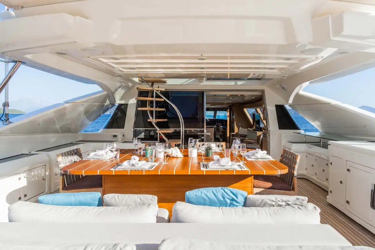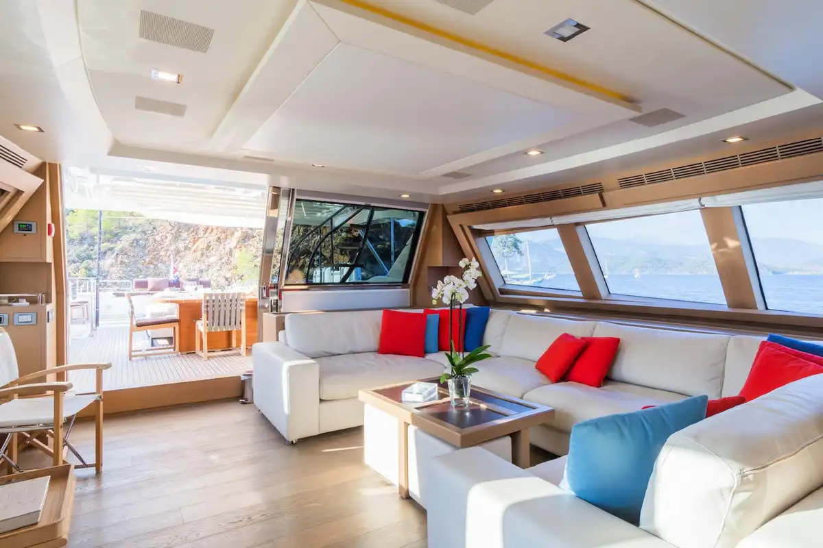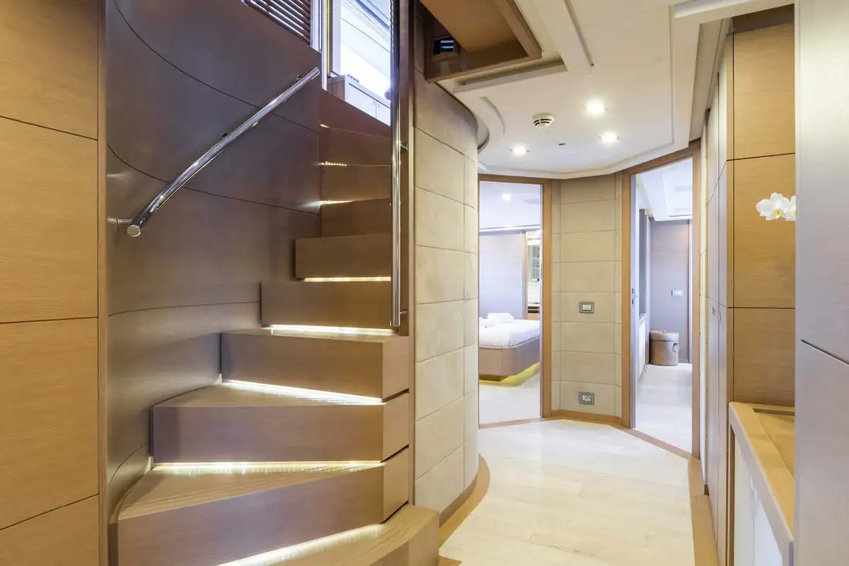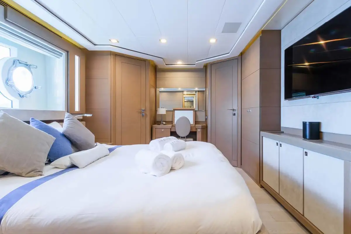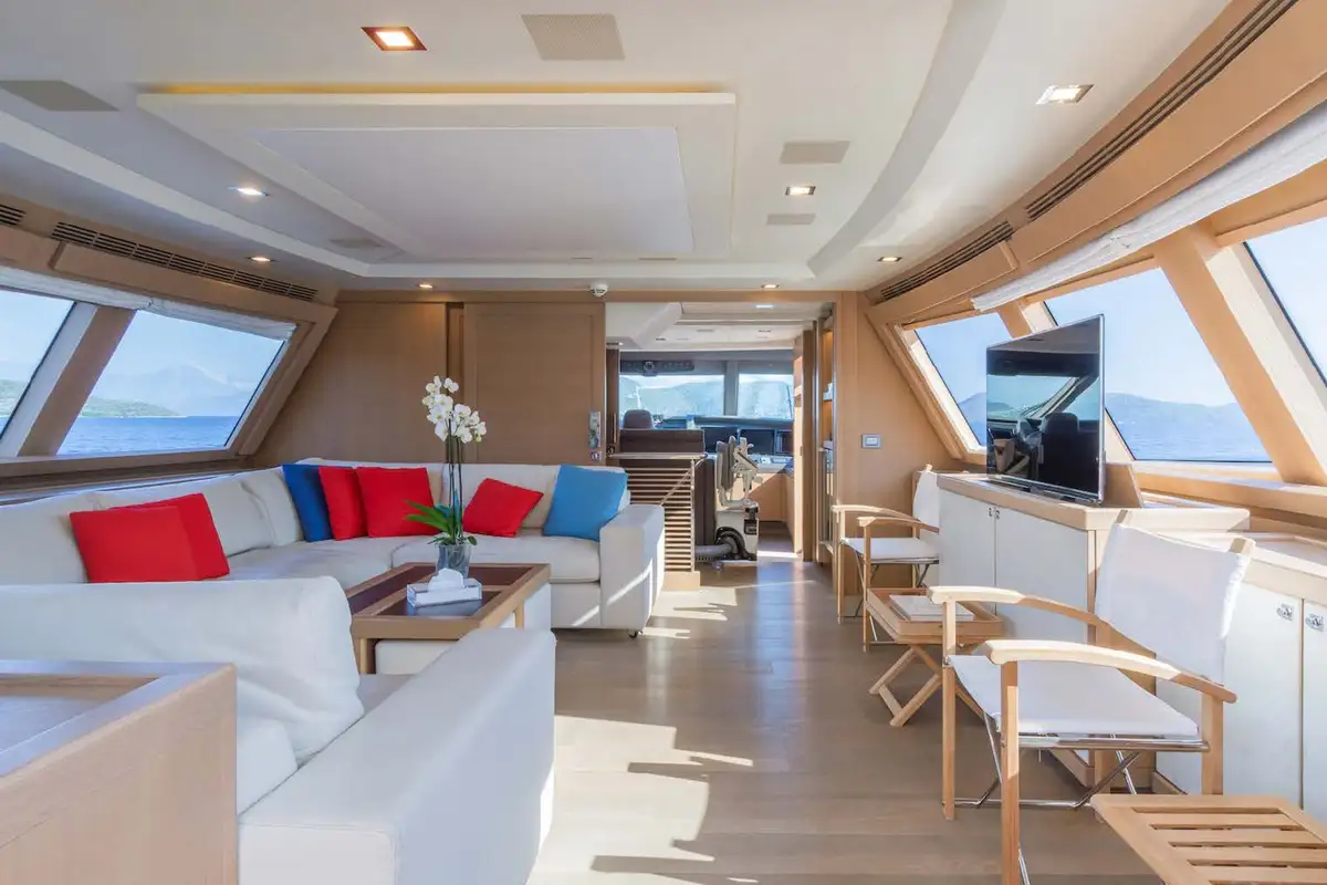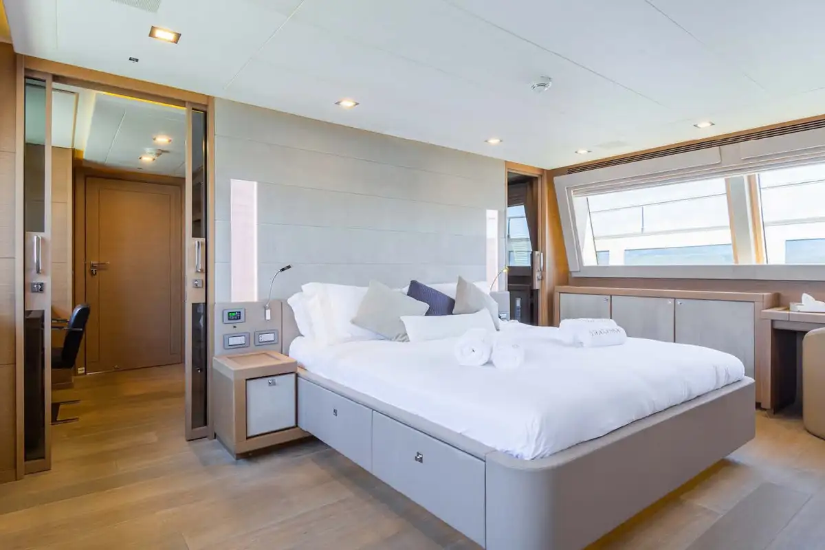 The luxurious master suite is on the main deck, and accessed via a private office. In this sumptuous secluded space, you have the convenience of his and hers walk-in wardrobes, and a vast en suite bathroom – with spa bath and a monsoon shower. More guest suites are found on the lower deck. There’s a choice between two double VIP suites, and a double berth and twin-berth suites that offer additional pullman berths. Whichever suites your guests choose, they’ll have en suite facilities and lavish space to unwind and revitalize.