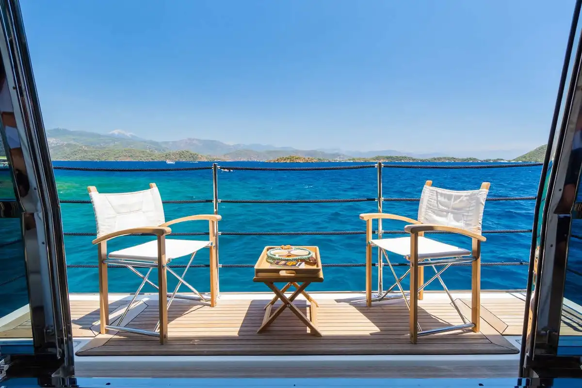Her generous upper aft deck is a stunning place to relax. The al fresco lounge area gives your party a space to congregate and enjoy each other’s company. The al fresco dining area, ahead of this, is perfect for informal dining –appetites can be whet while watching your food cook on the grill here. A few steps away is the delightful sky lounge, it gives you a beautiful airconditioned space to chill and de-stress. Less able guests can also enjoy their time onboard THALYSSA, she offers a stairlift from the saloon to the sky lounge.