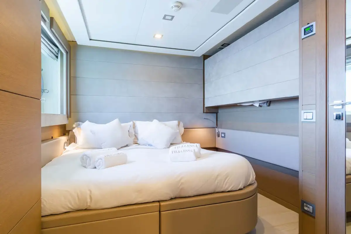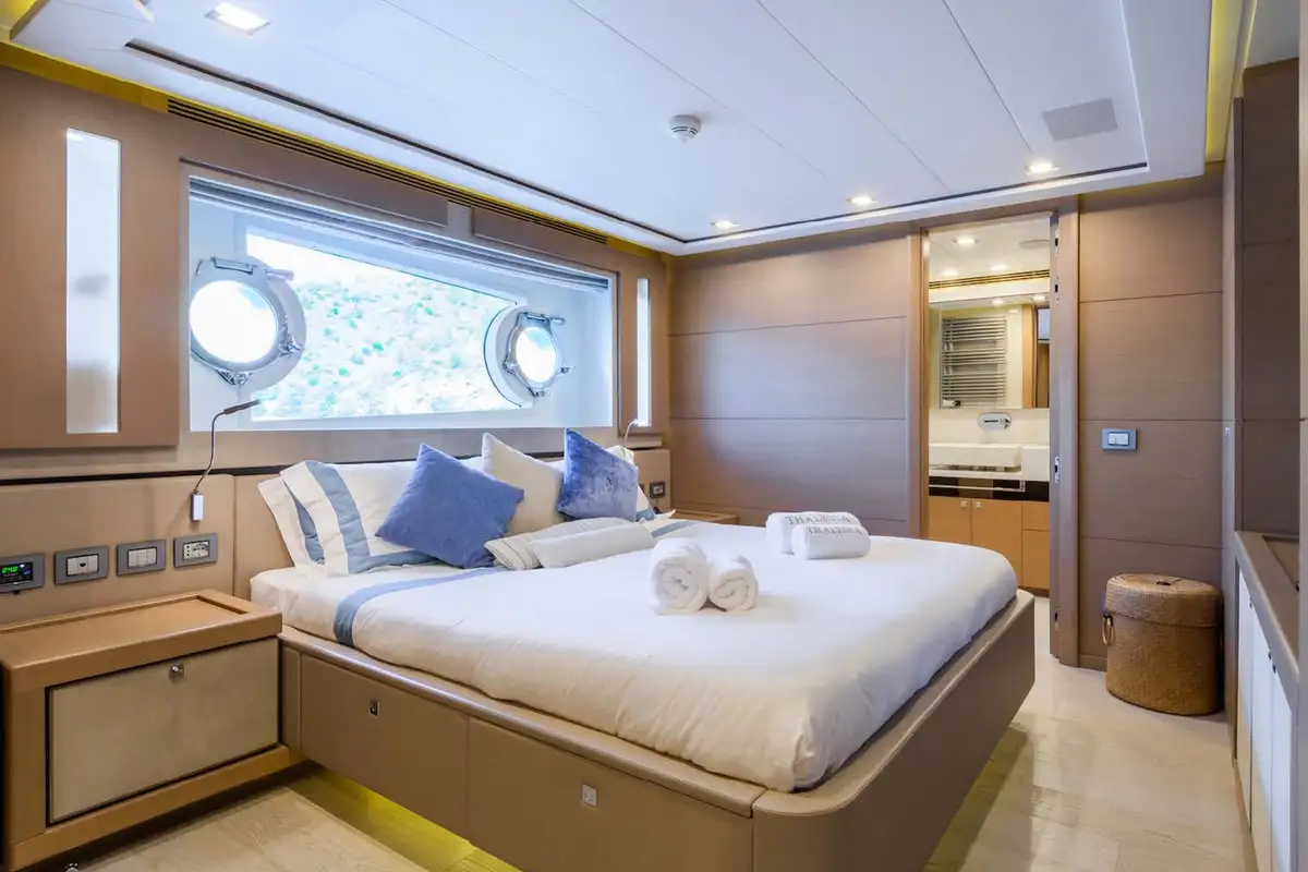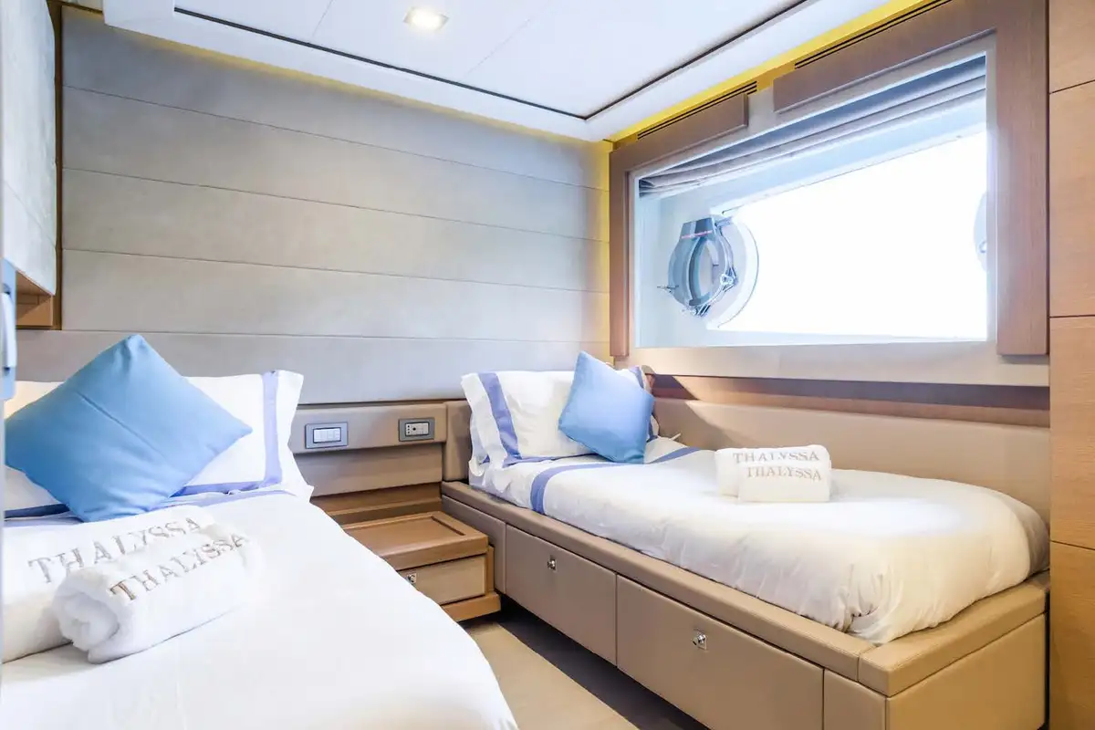 THALYSSA will impress you and your guests from the moment you board this stunning 37.8m (124ft) yacht. Her cleanly styled contemporary interior set the stage for birthdays, banquets and the best times. The main saloon is light and bright and picture windows provide stunning vistas. Fold-down balconies on each side extend the space – perfect for savouring a coffee, digestif or cigar. You’ll experience gourmet delights from the galley in the formal dining area just forward of the lounge.