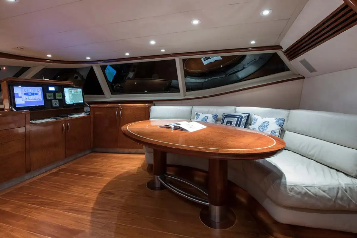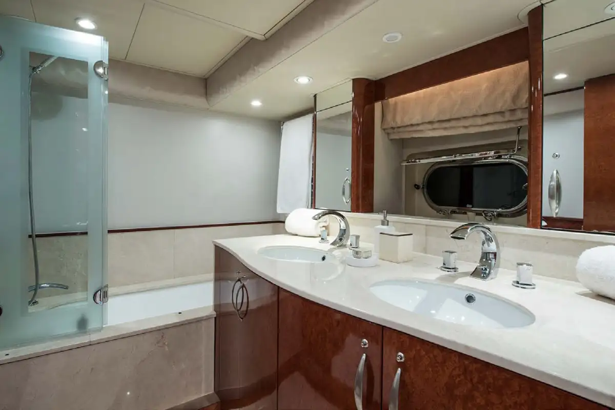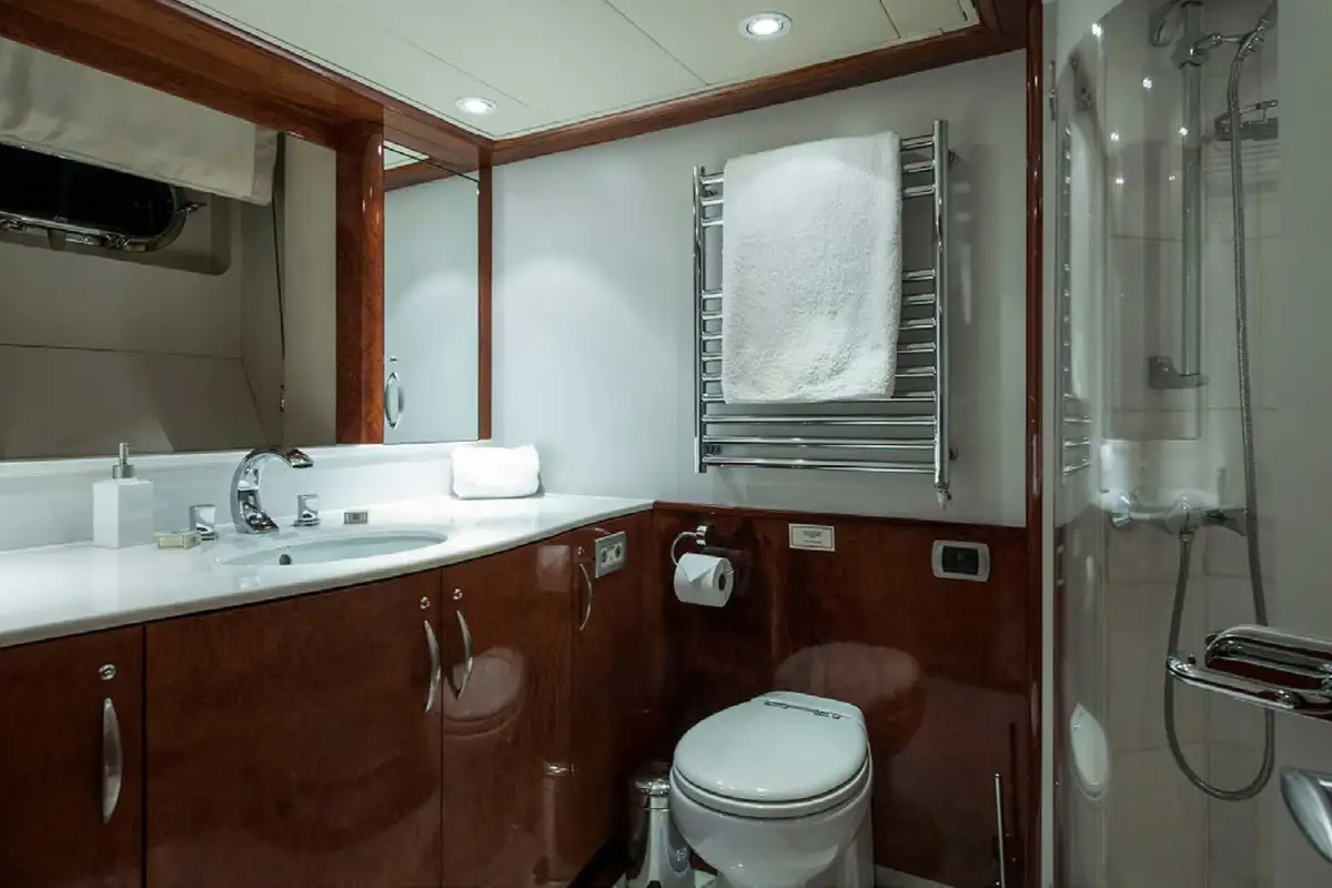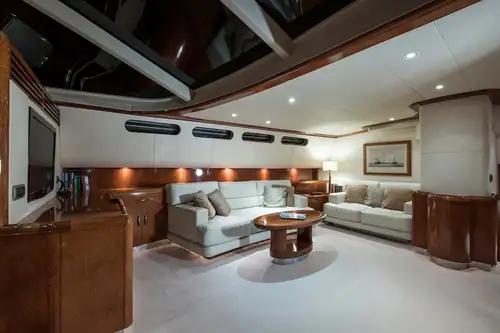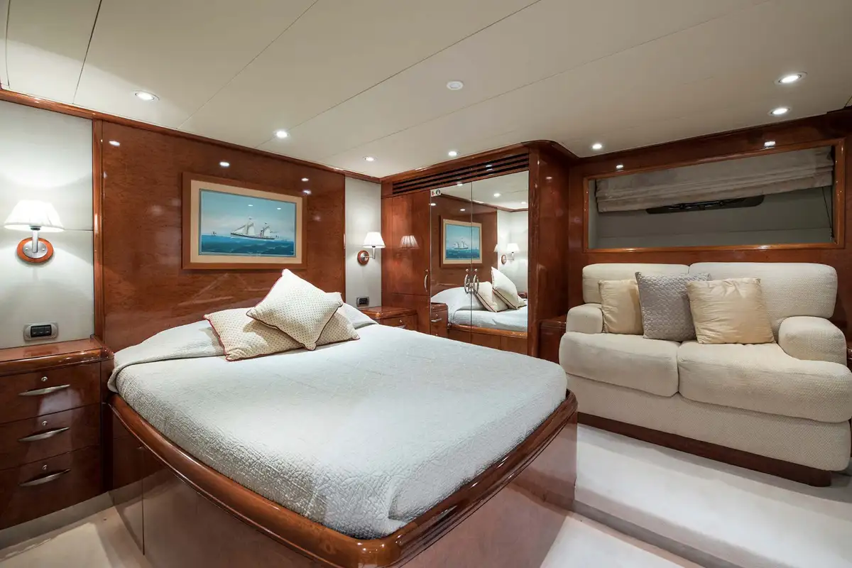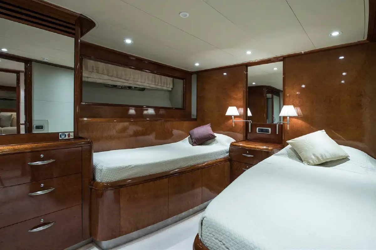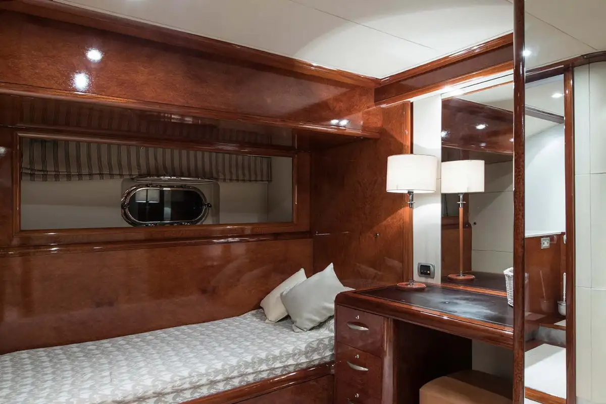 THANDEKA’s accommodation is located on the lower deck and includes a full-beam master suite to the rear. This elegant space features a central berth facing a large-screen TV and a writing desk. There is also sofa seating and an en suite bathroom with his and hers sinks. Further guest suites comprise a second double suite and two twin-berth cabins, one of which has a single bed with a pullman berth in a bunk configuration, making THANDEKA well-suited to families and groups.