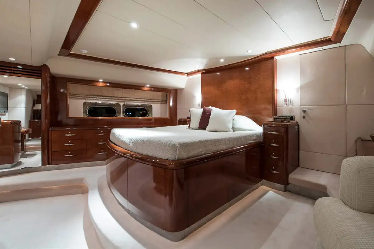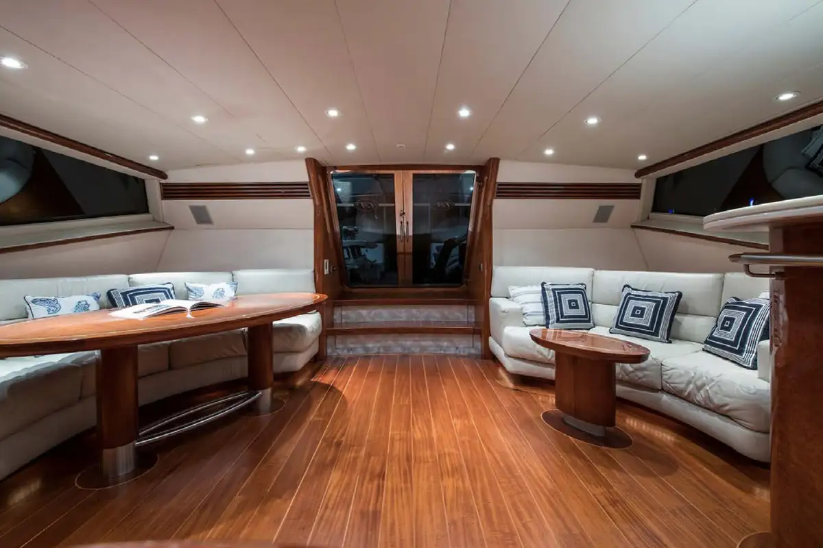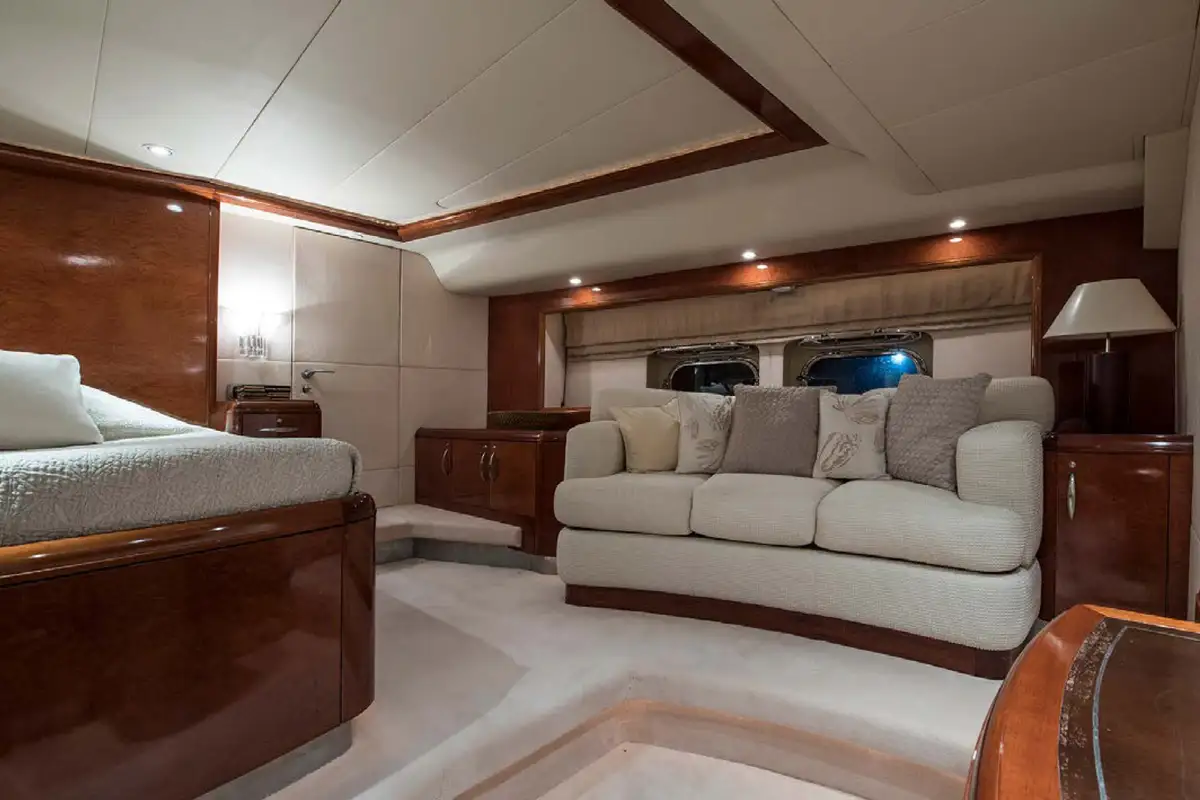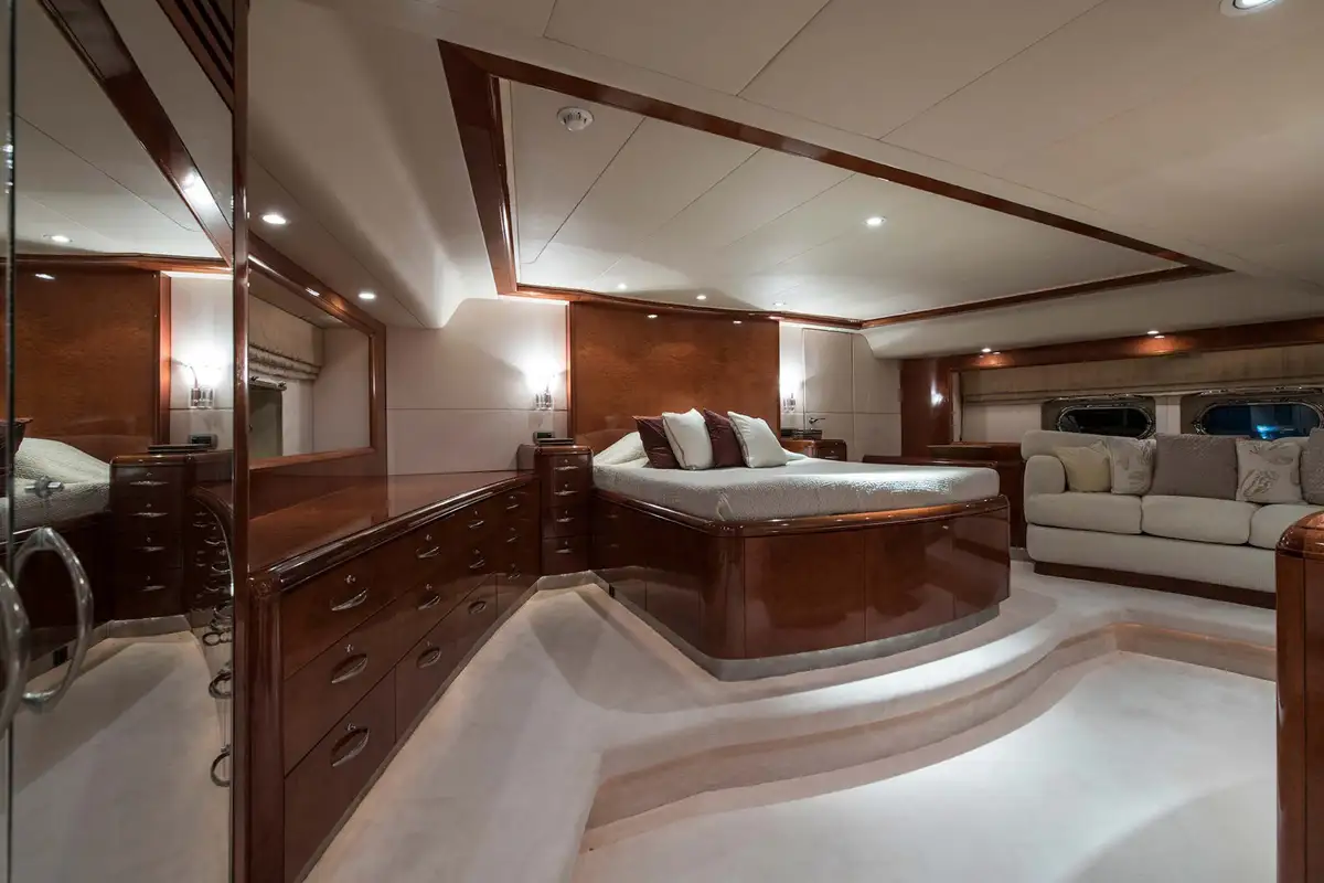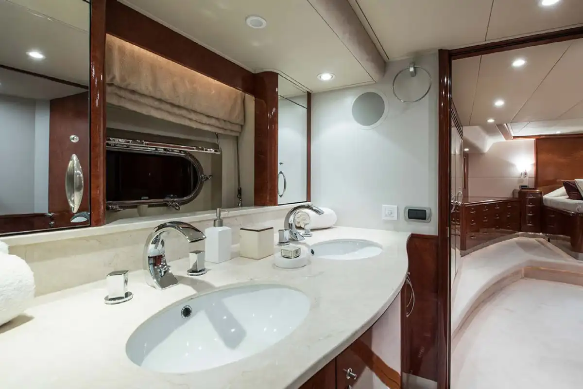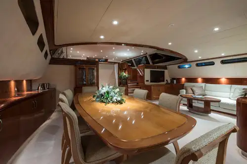 From the guest cockpit, double doors lead to the raised deck lounge, where dinette seating, to starboard, takes full advantage of the sweeping views. A central staircase leads down to the lower lounge, which features a formal dining area to starboard and a relaxed sofa seating area to port – ideal for unwinding after a day’s sailing or watersports.