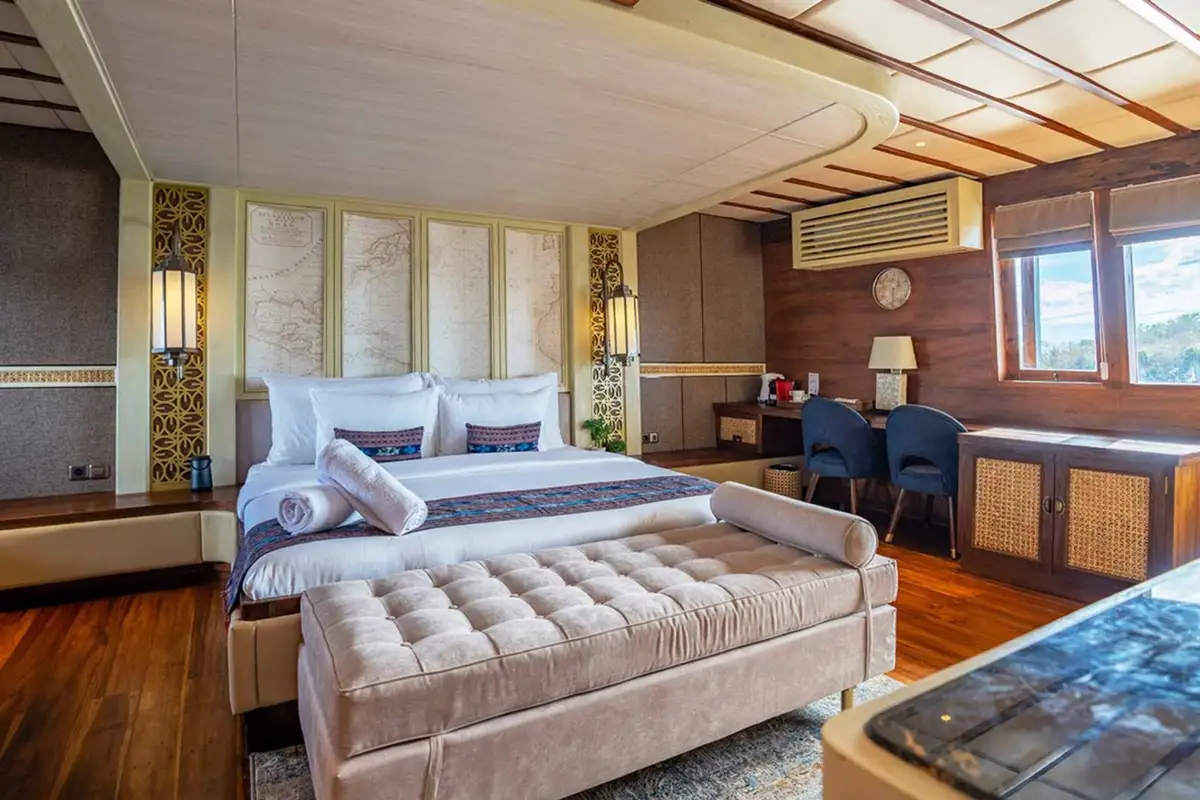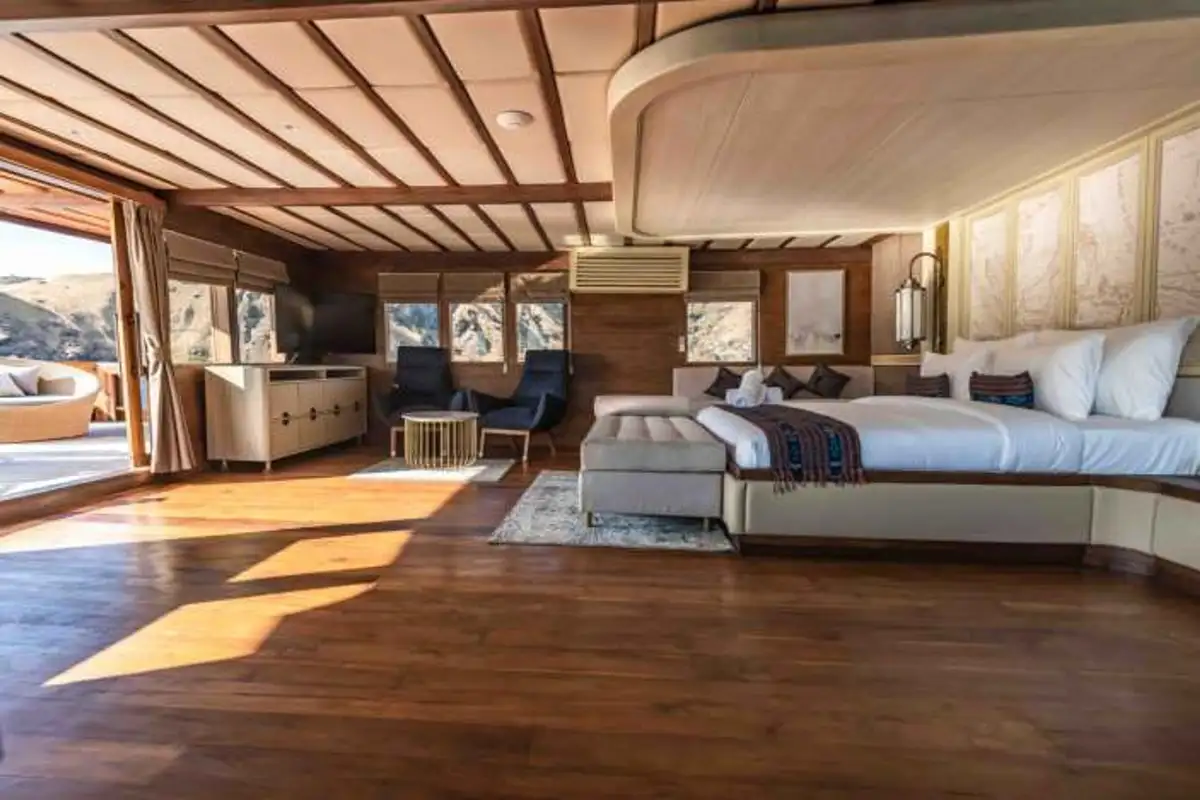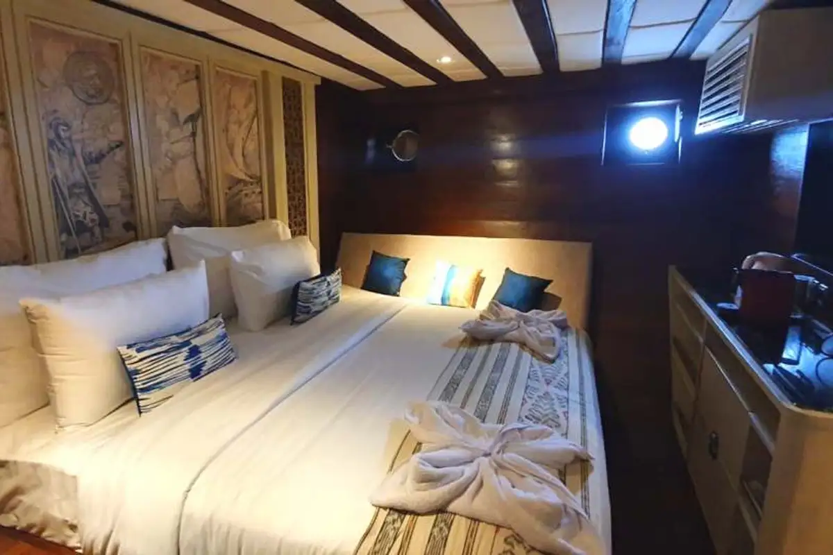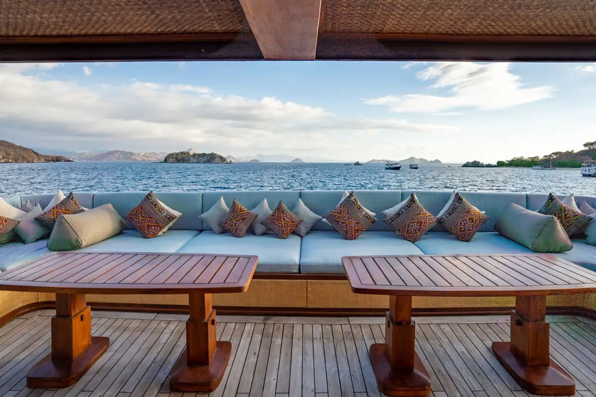 The master suite is a spectacular full-beam cabin that occupies most of the upper deck, with 270-degree panoramic views and its own private outside terrace. There are five other double cabins including a VIP suite and one twin-bed cabin, all furnished to five-star standard in contemporary-classic Indonesian style. Each cabin has its own lounge area and a private en suite bathroom with a jet shower.