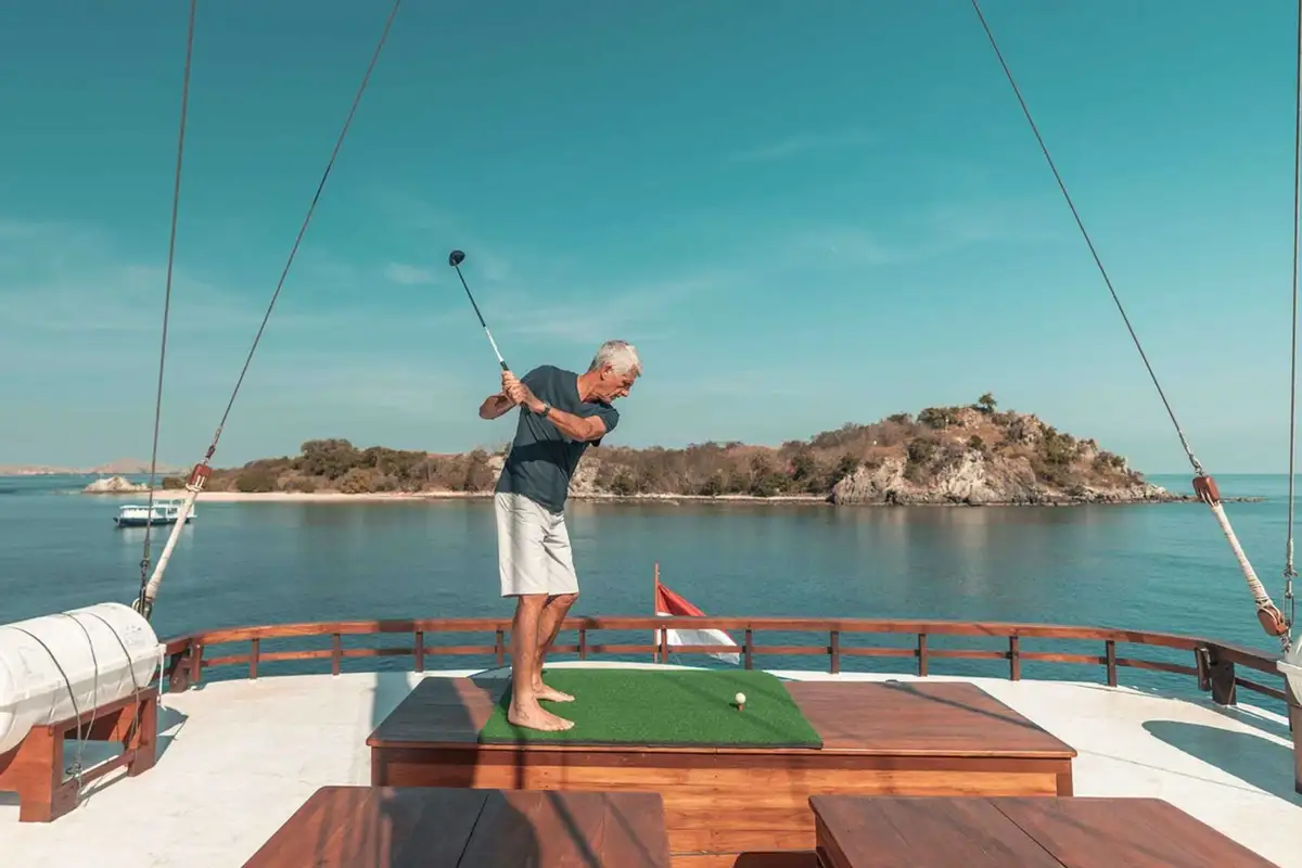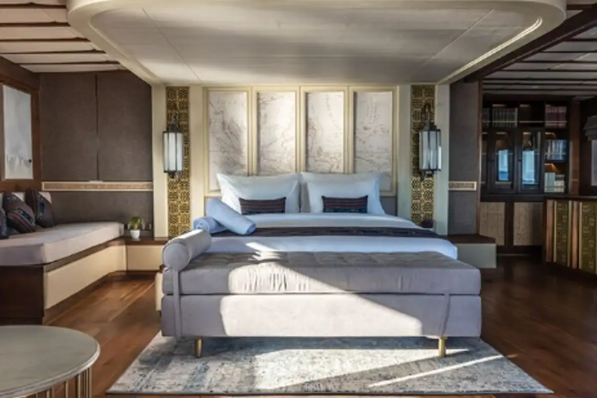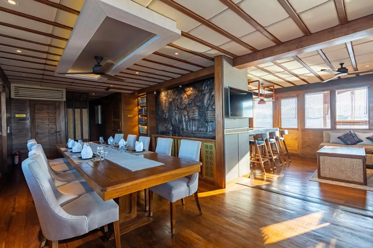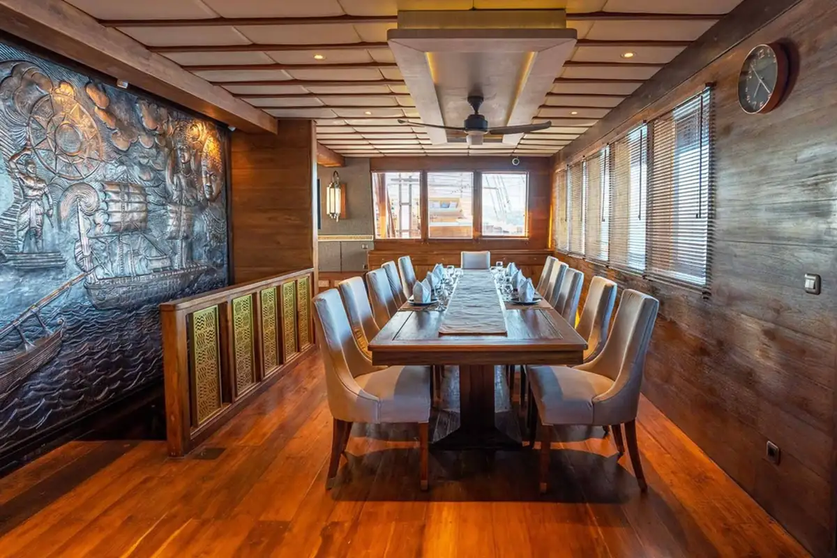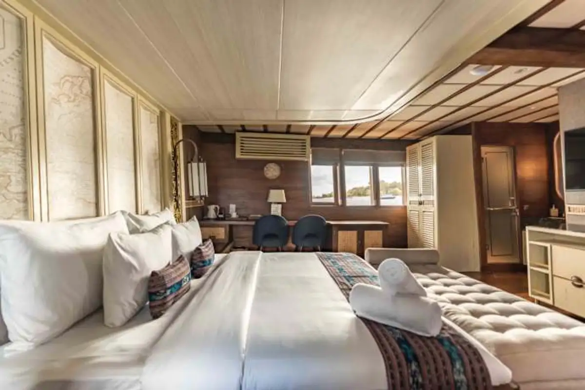 The master suite is a spectacular full-beam cabin that occupies most of the upper deck, with 270-degree panoramic views and its own private outside terrace. There are five other double cabins including a VIP suite and one twin-bed cabin, all furnished to five-star standard in contemporary-classic Indonesian style. Each cabin has its own lounge area and a private en suite bathroom with a jet shower.