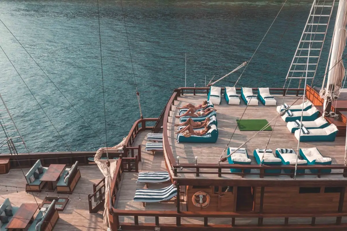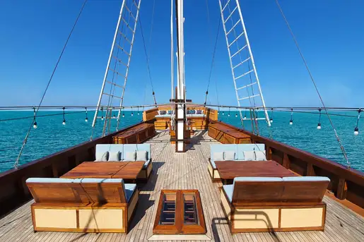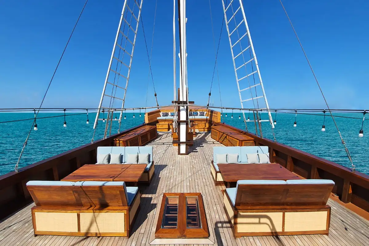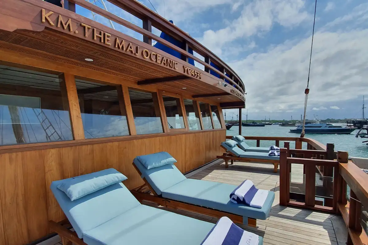 Launched in 2020, THE MAJ OCEANIC is the largest and most luxurious of these graceful, classic sailing vessels, created in a unique collaboration between traditional master shipwrights and high-end hotel designers. Specifically conceived for charter cruising in Indonesian waters and purpose-built to host 12 guests on board in seven cabins, she offers a superb standard of accommodation and a huge amount of living space with high-spec air conditioning and wi-fi throughout.