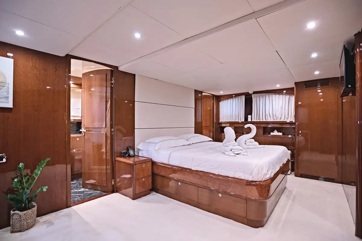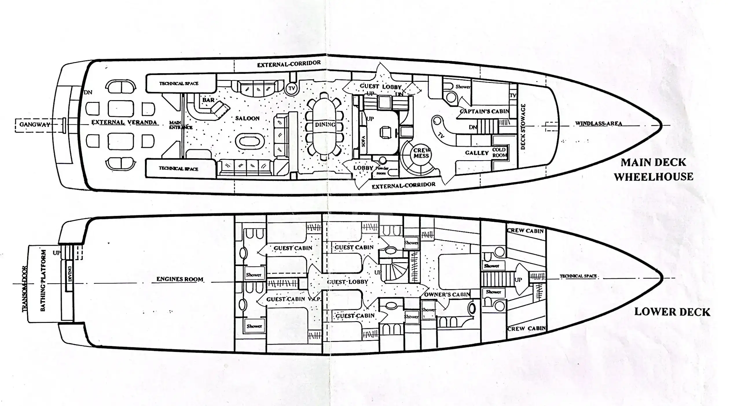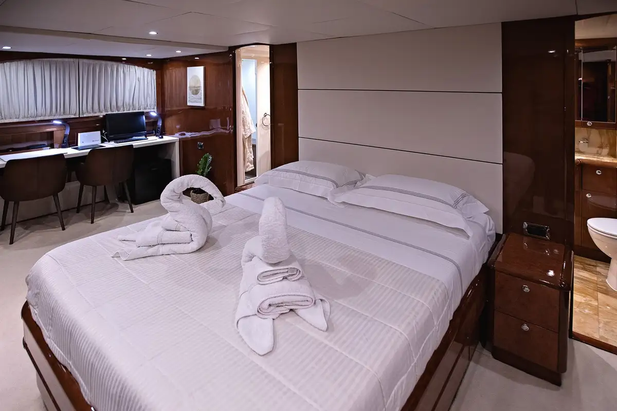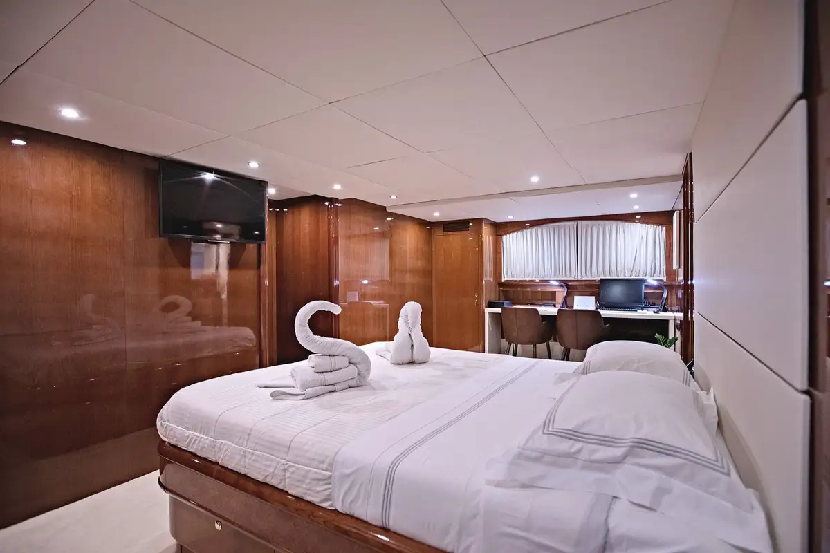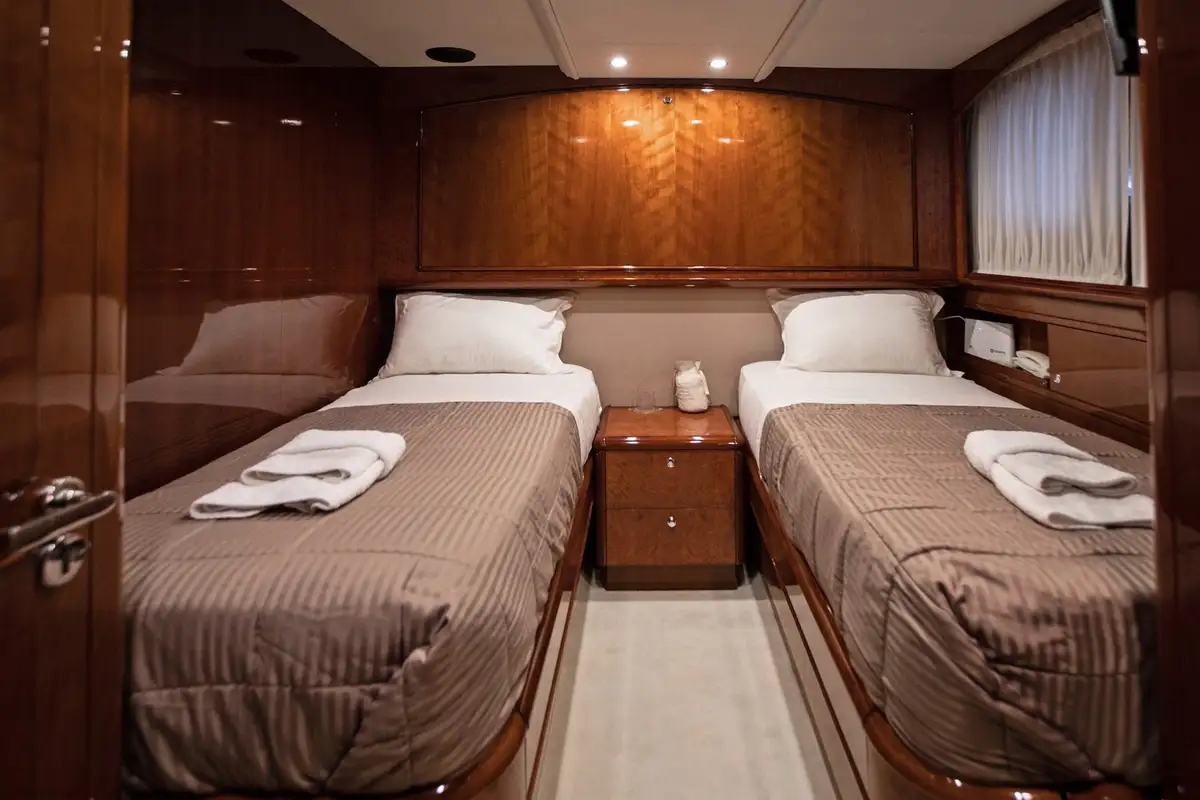 THEION accommodates up to 10 guests in flexible accommodation- master double cabin plus a further double plus two twins with pullmans. Both twin cabins convert to a double cabin, giving four doubles plus pullmans.