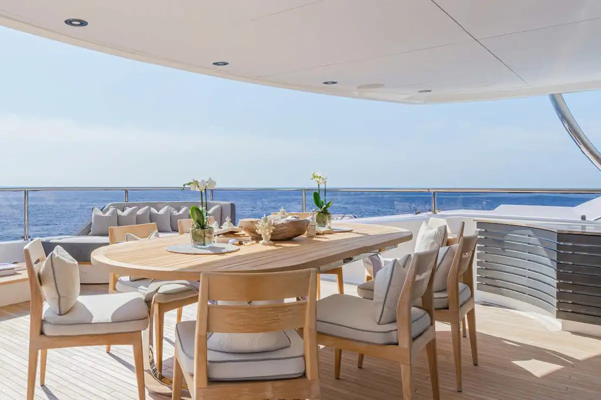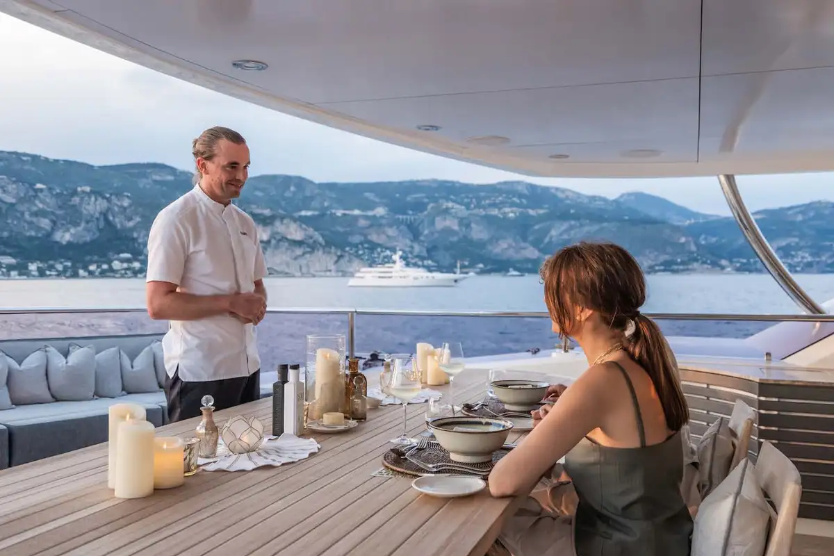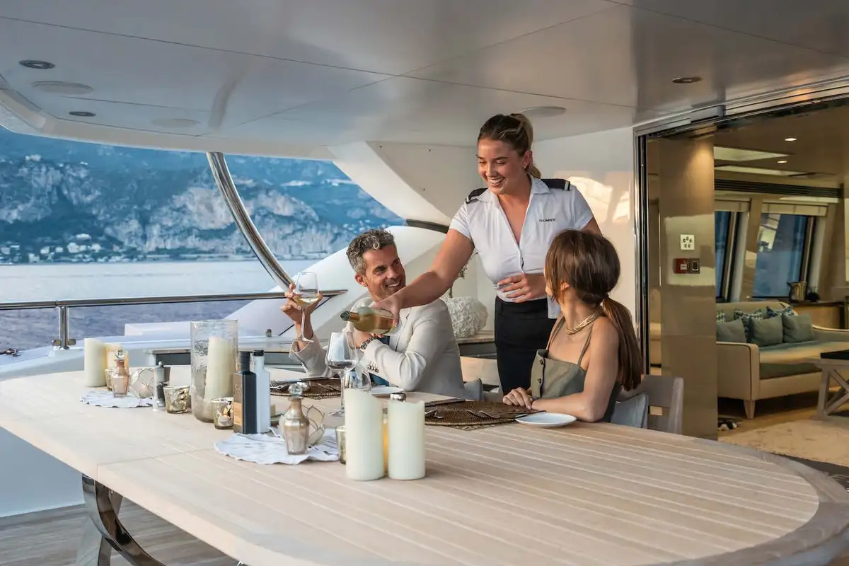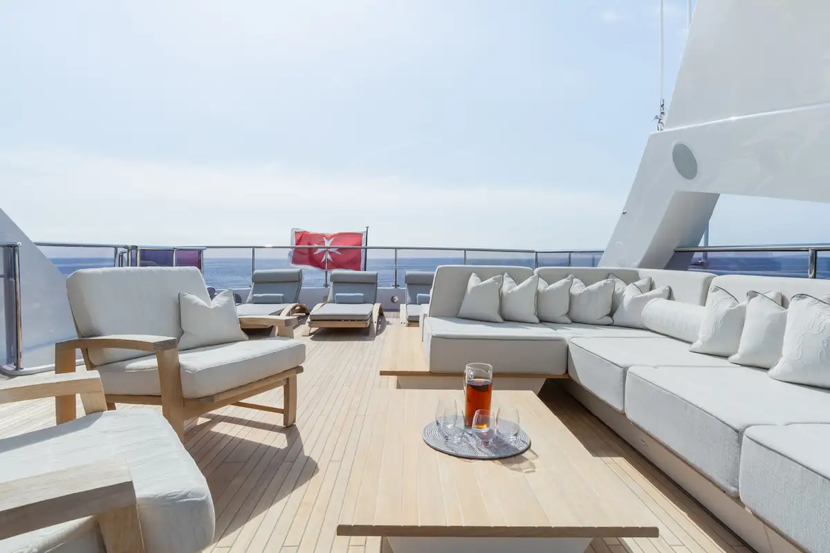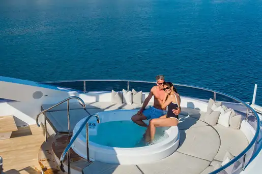 A relaxed lunch is served on the main deck aft, with a selection of delicious local produce creatively presented by the talented chef. Sun worshippers will want to make their way up to the sun deck, with its bubbling jacuzzi flanked by a vast bank of sun pads. The comfortable sofas, freestanding chairs and selection of sunloungers are the perfect place to relax and soak up some rays.