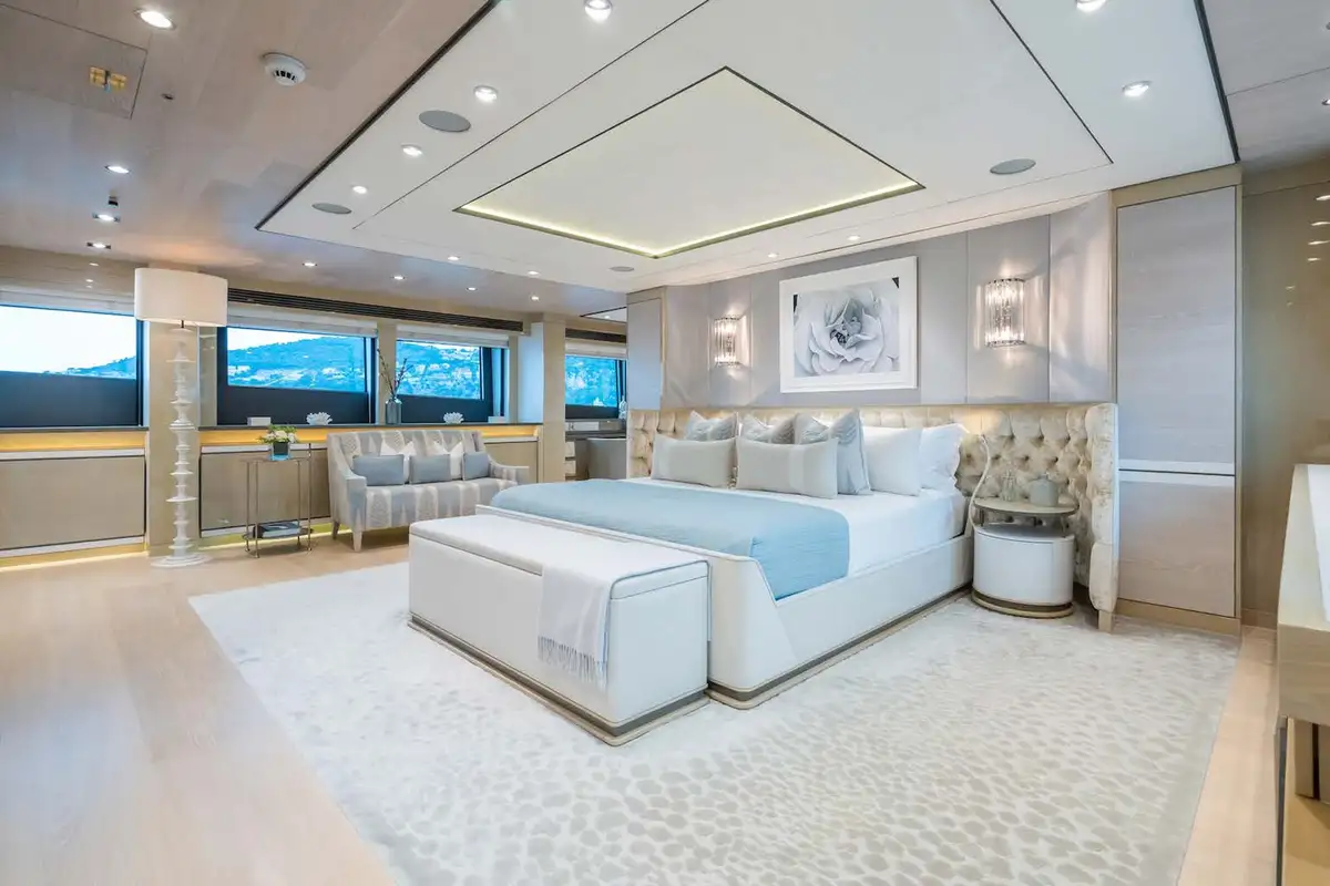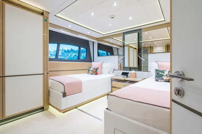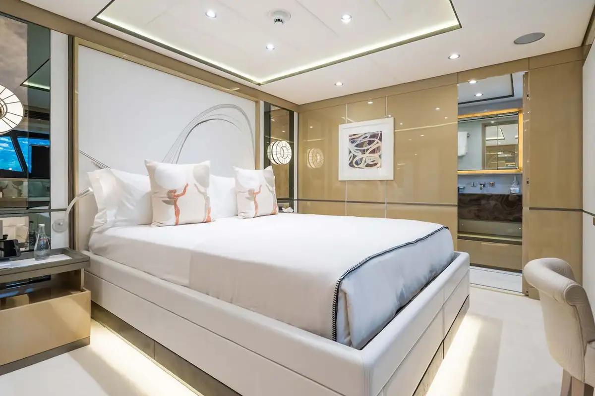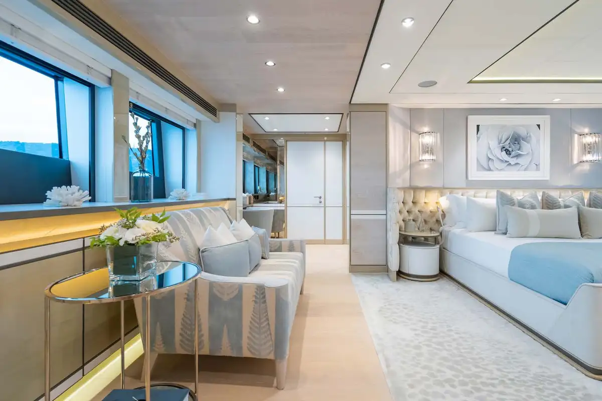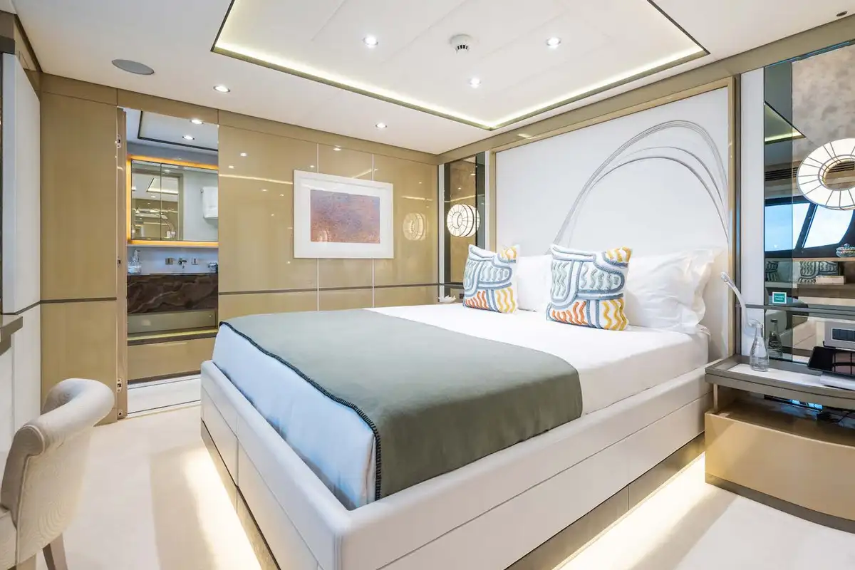 THUMPER’s master suite is a master class in understated luxury; with sumptuous fabrics and warm, muted tones, it is bathed in light from large windows on both sides. Two double cabins and two convertible twin cabins on the lower deck complete the accommodation for up to 10 on board.