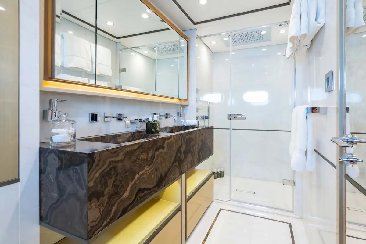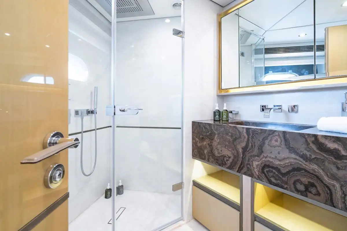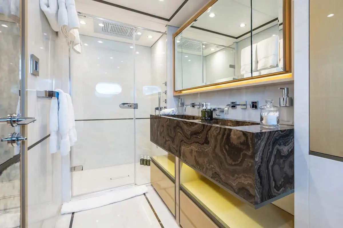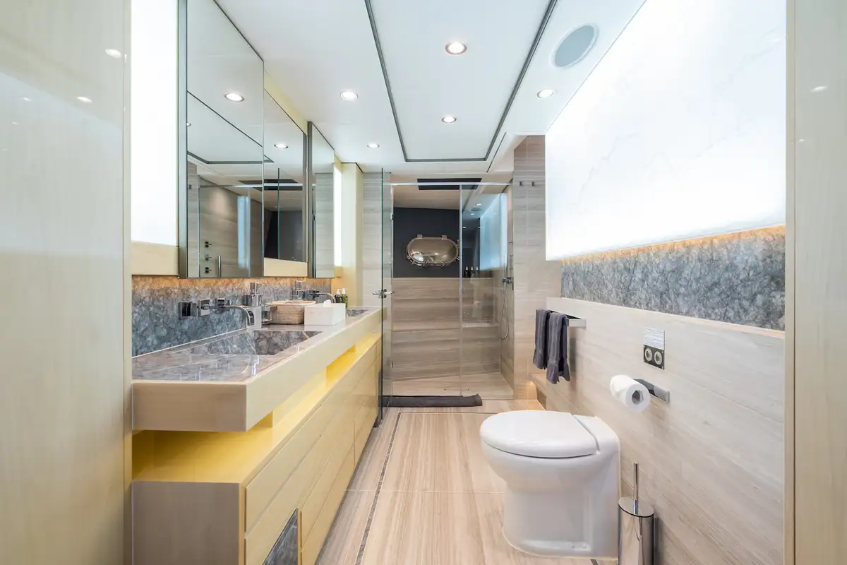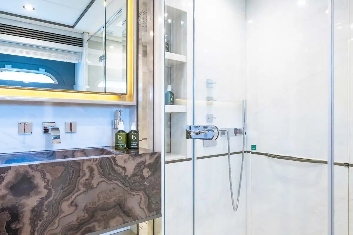 THUMPER’s master suite is a master class in understated luxury; with sumptuous fabrics and warm, muted tones, it is bathed in light from large windows on both sides. Two double cabins and two convertible twin cabins on the lower deck complete the accommodation for up to 10 on board.