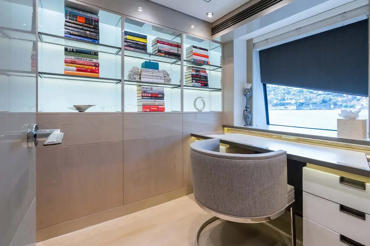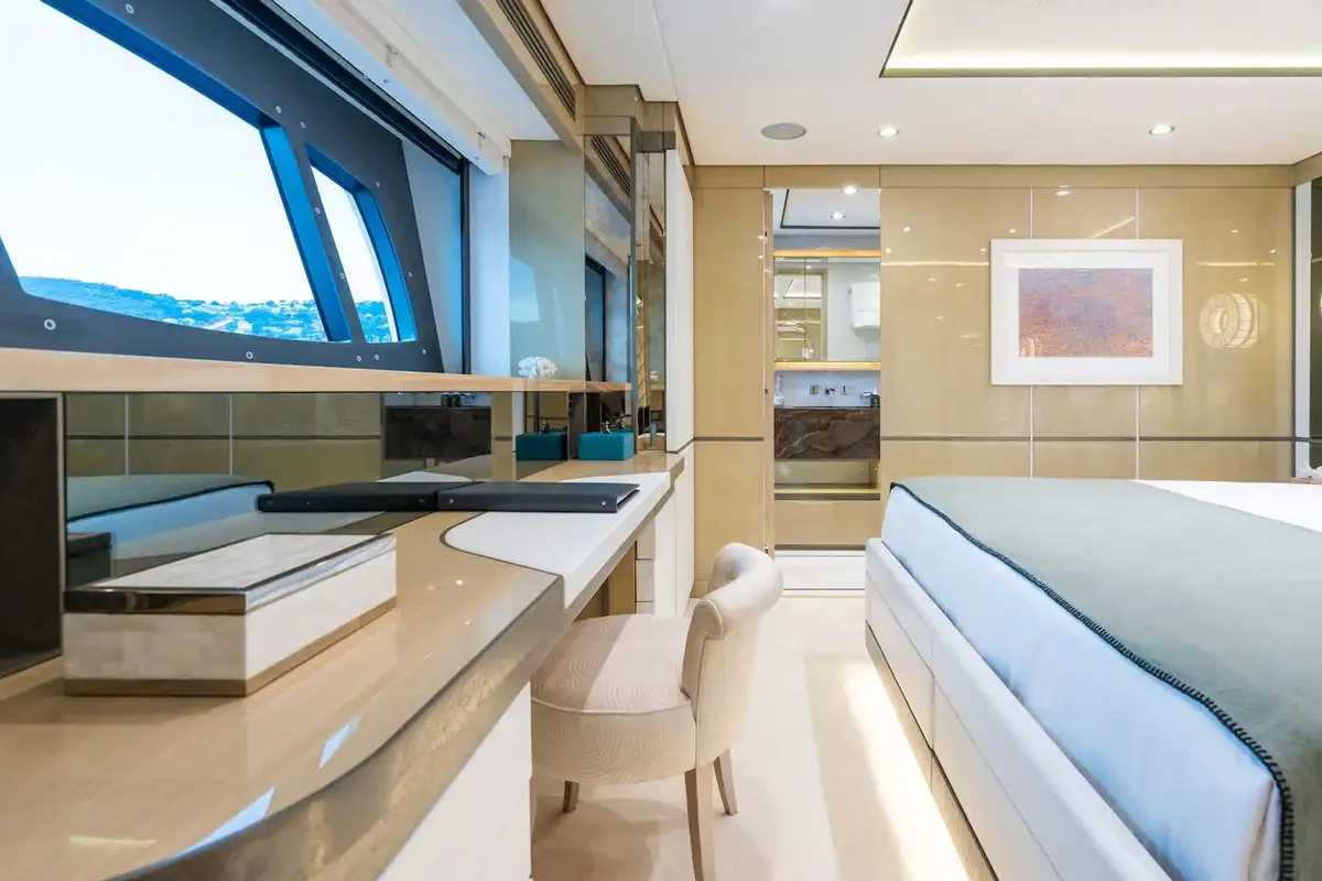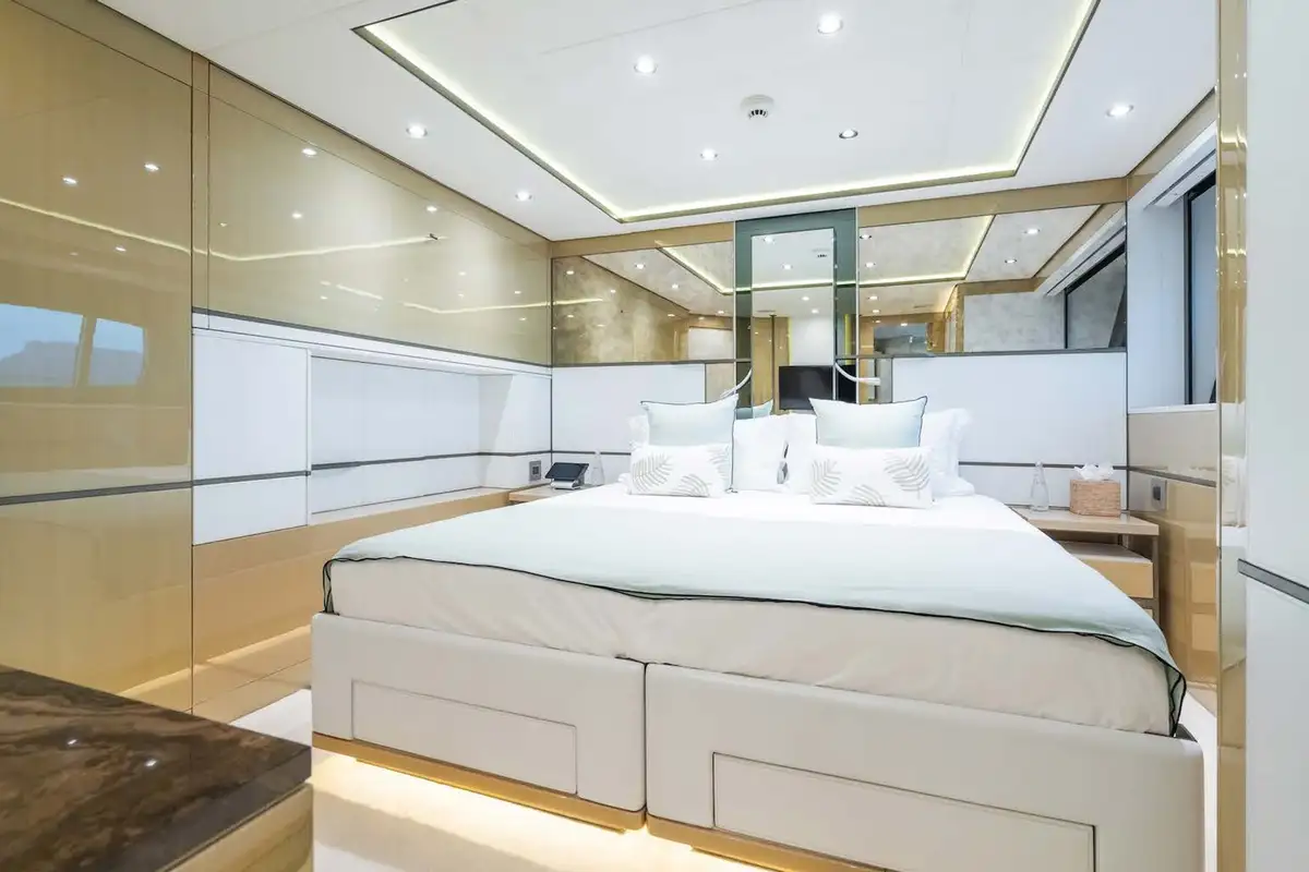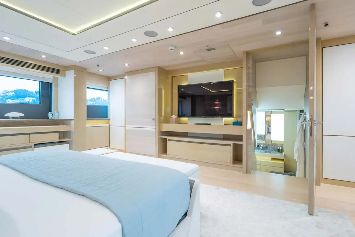 THUMPER’s master suite is a master class in understated luxury; with sumptuous fabrics and warm, muted tones, it is bathed in light from large windows on both sides. Two double cabins and two convertible twin cabins on the lower deck complete the accommodation for up to 10 on board.