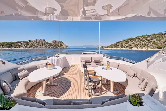 TIGRA’s exterior is designed for relaxed, open-air living. The spacious aft deck features an alfresco dining area ideal for long lunches or evening dinners beneath the stars. Her sun deck is a true highlight—equipped with a bar, dining table, sun loungers, and optional shading, it’s the perfect setting for socialising or simply watching the world drift by. Forward, a generous sunbathing area invites lazy afternoons under the Mediterranean sun.