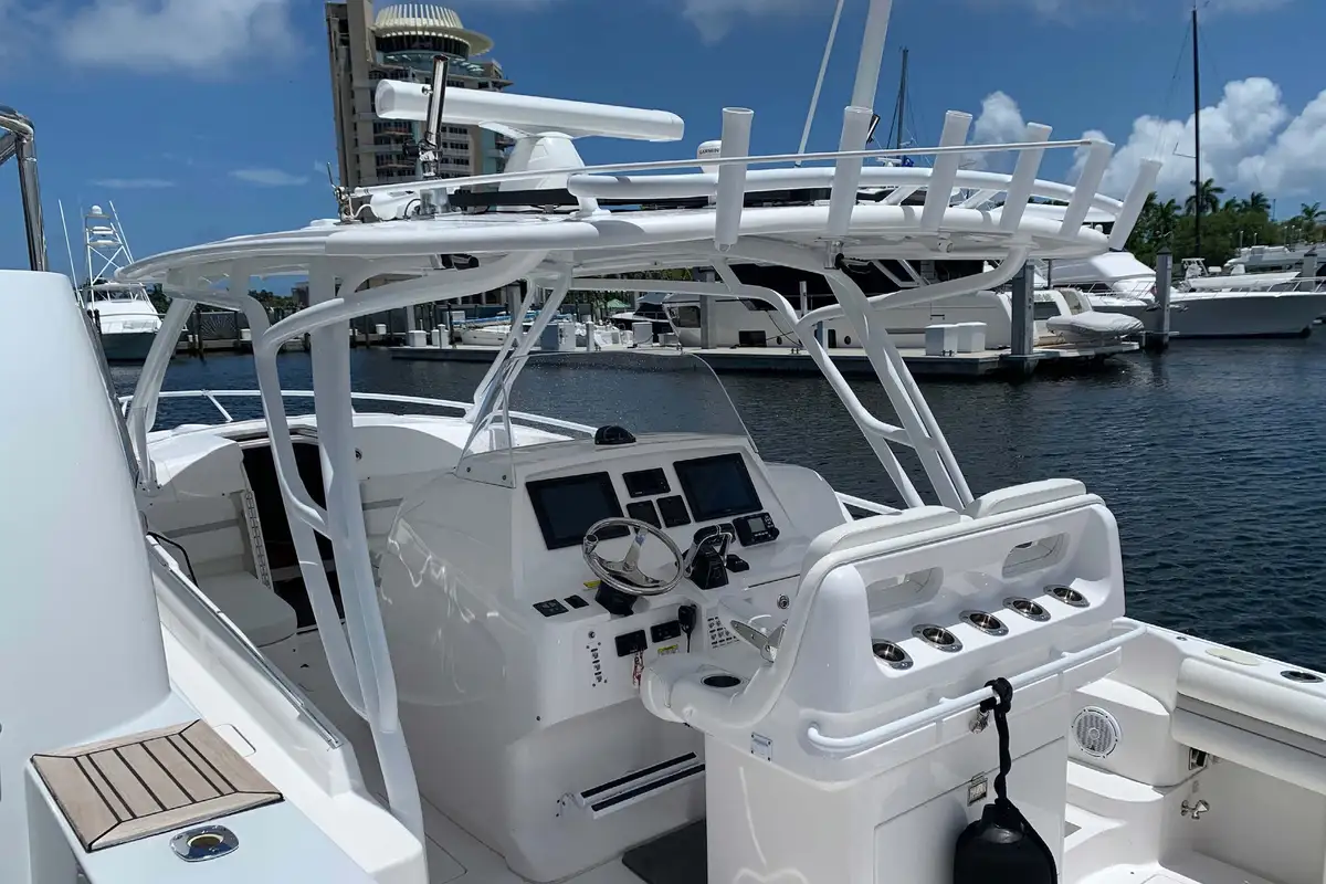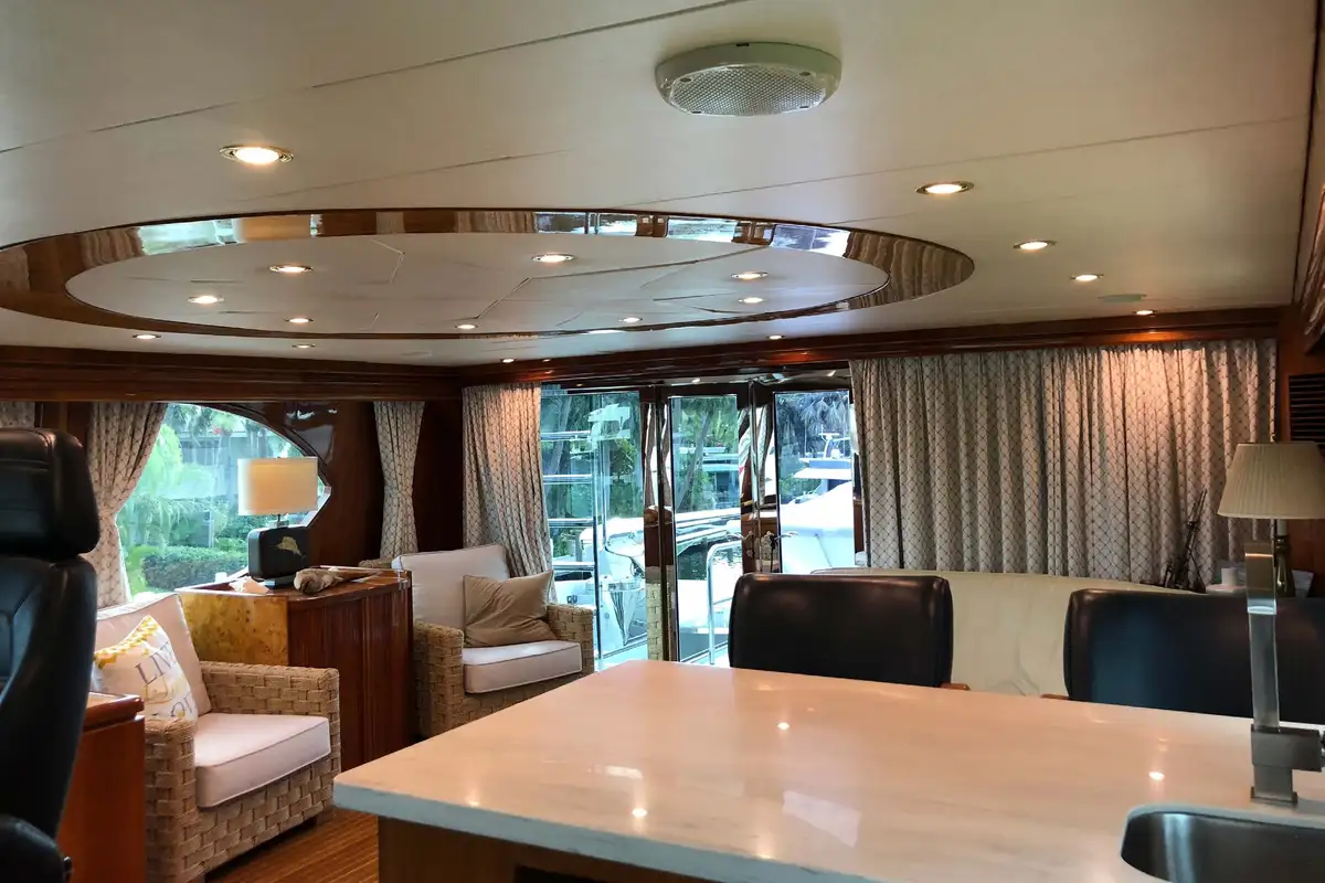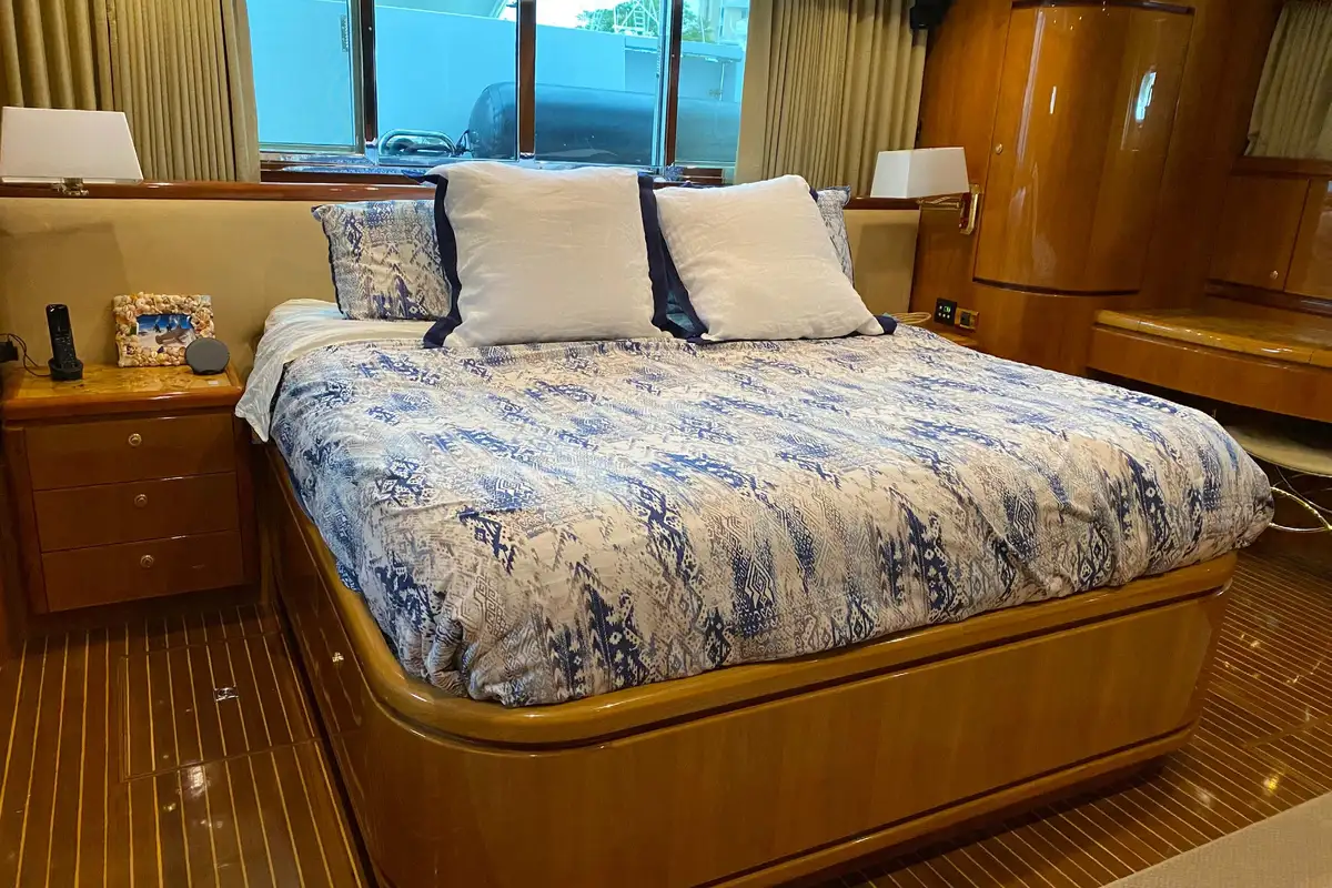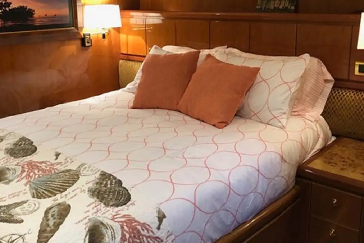 Tortuga's comfortable interior layout sleeps up to 7 guests in 3 staterooms, including a full beam King master suite with large windows that open and offer panoramic views for an open air experience , 1 queen cabin and 1 twin cabin that converts to a king. (with Pullman). All guest rooms have ensuite bathrooms/showers. A fresh interior refit includes a modernized interior, top of the line electronics and sumptuous seating throughout creates an elegant and comfortable atmosphere. The Sky Lounge features fully enclosed (and Air conditioned) helm station on flybridge. Also has comfortable seating for 8-10 with amazing 360 views while cruising. At the dock it creates another huge entertainment zone with additional TV/Stereo/BBQ Grill /Bar/ice maker. She tows a large 37' Intrepid perfect for cruising those scheduled areas! This is an 82 footer that lives like 100'+!