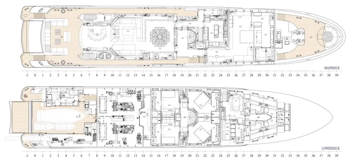 She consistently delights 12 guests, in a full beam main deck master with a private office and a his and hers bathroom with a glass bathtub as a design feature. The lower deck is home to two double cabins and two twin cabins and both twins have an additional berth to complete her adaptable family friendly accommodation.