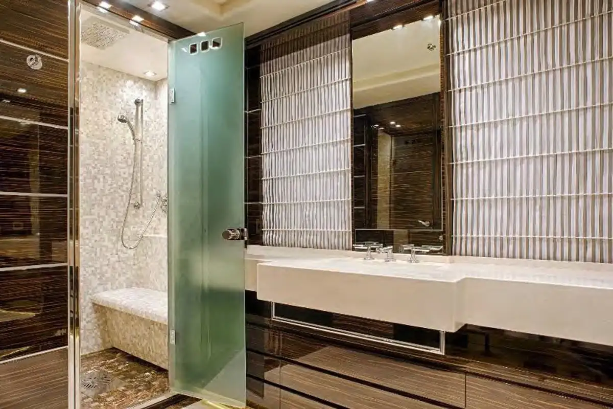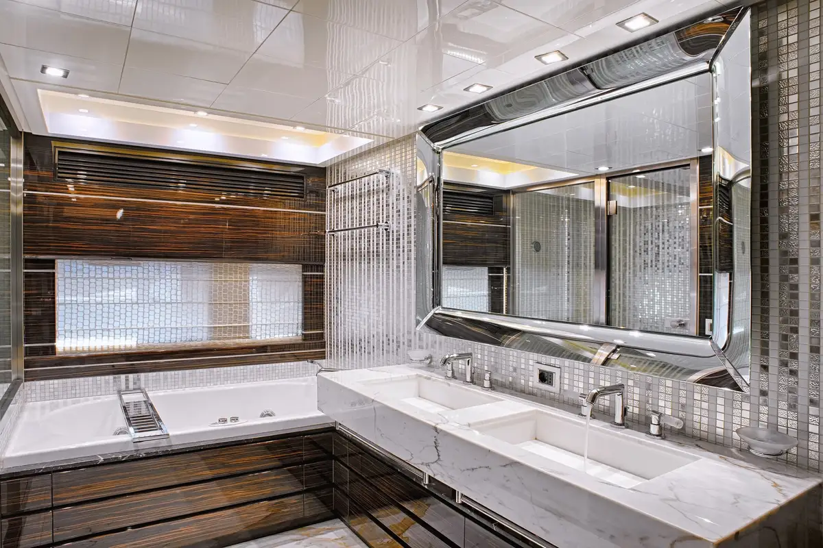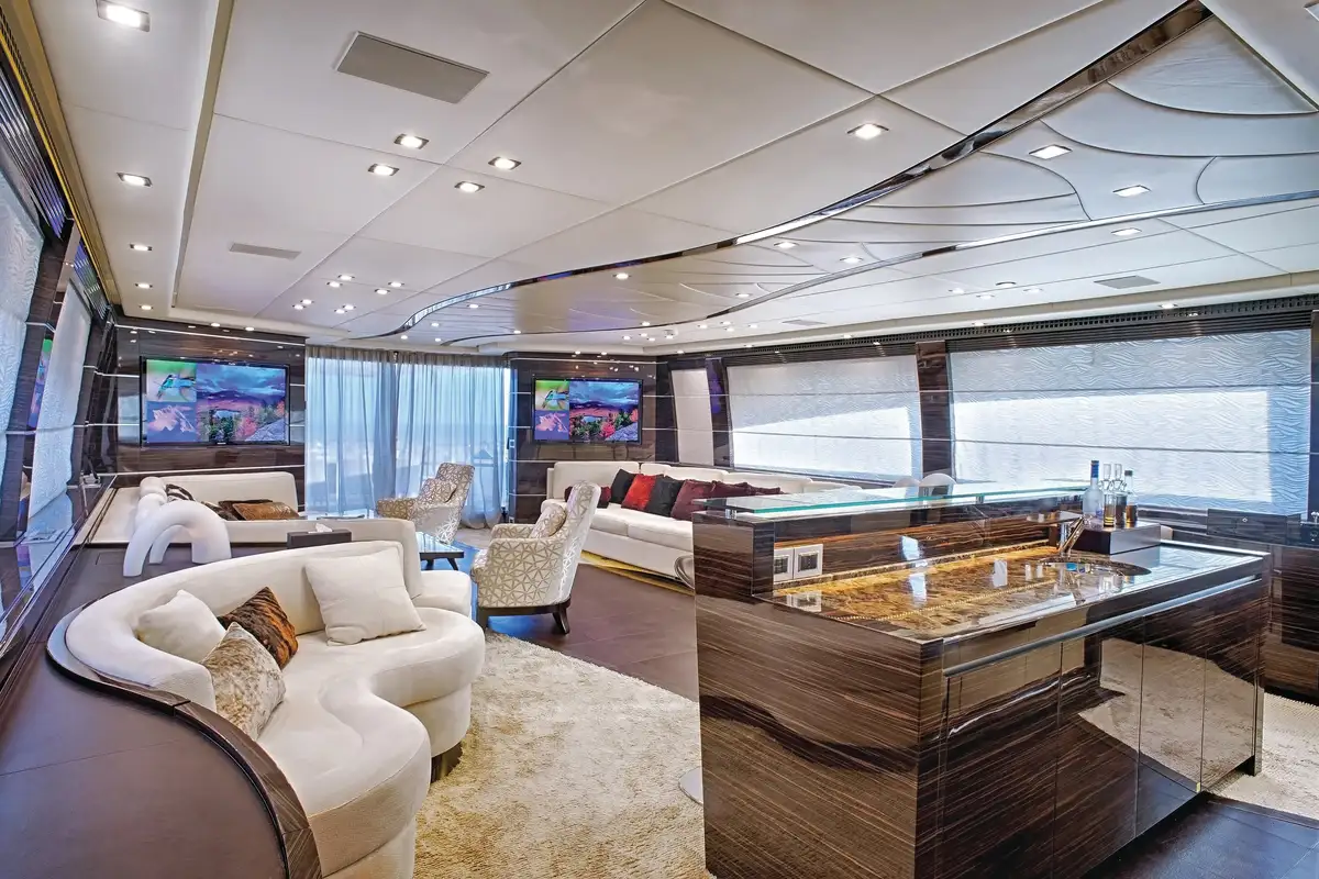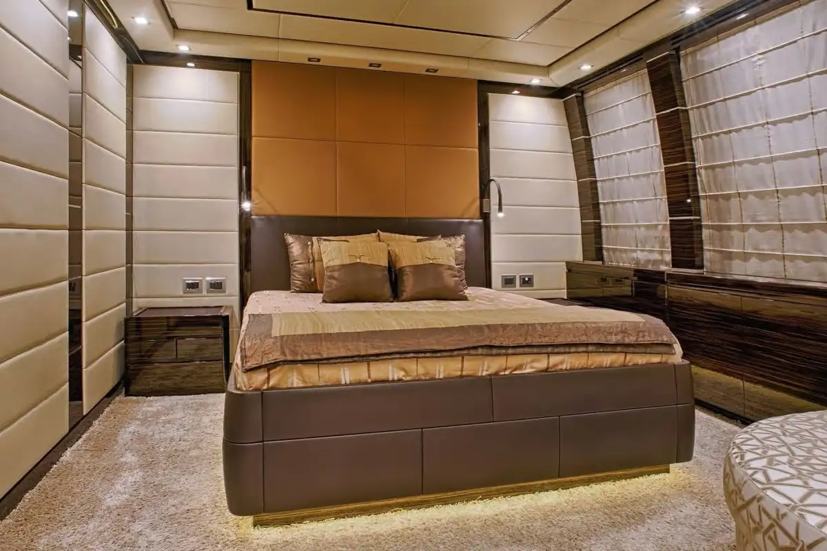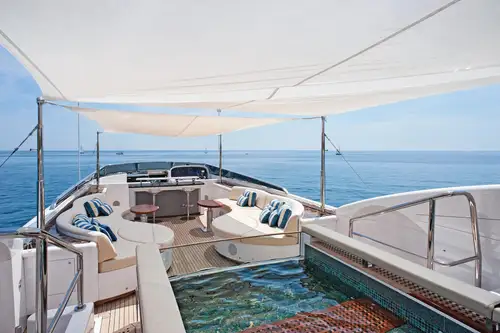 When play time is over, head to the large foredeck lounge, with a privacy sunshade and uninterrupted views. Others in your party are enjoying the jacuzzi on the sundeck. As the weather is calm, your captain suggests that you stay in the secluded anchorage overnight. Take the chance to head to the main deck owner's suite and relax in the en suite jacuzzi bath. Some of your party are in the cinema area watching a film, others are making the most of the last of the sun at the bar.