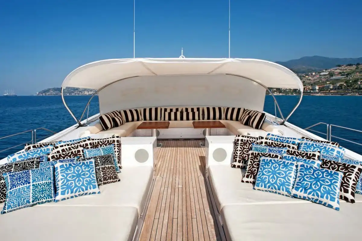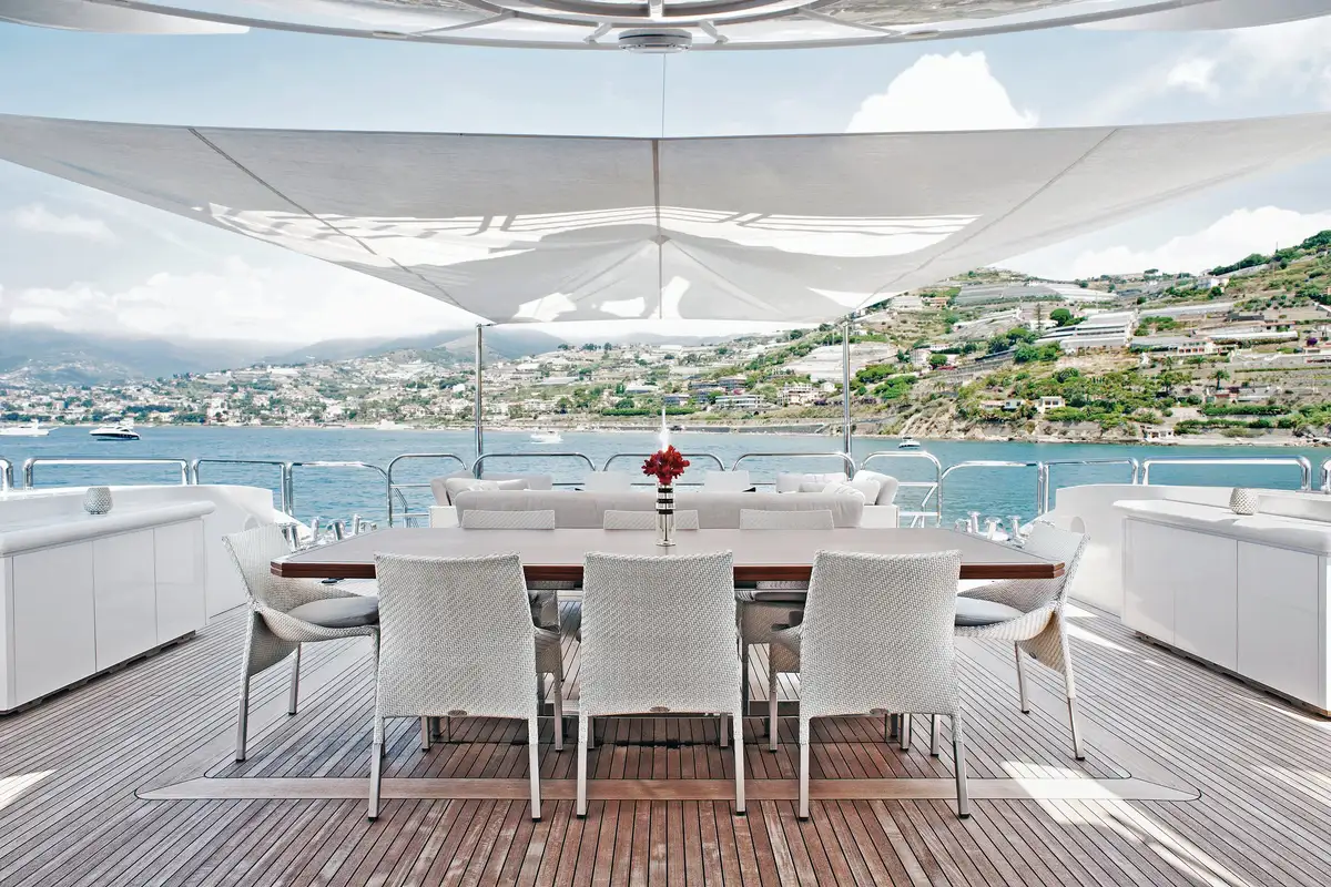 TUTTO LE MARRANE has two sumptuously appointed double VIP suites each with a spacious and stylish en suite bathroom with a walk-in shower space. There are two en suite twin cabins on the lower deck, again with a high standard of décor throughout. Your guests begin to assemble in the main lounge bar area for pre-dinner drinks. The yacht’s stabilisers dampen any motion. The crew notify you that dinner is about to be served, you leave the cool air-conditioned lounge into the warm evening outside. The al fresco table has been laid for you to dine under the stars tonight.