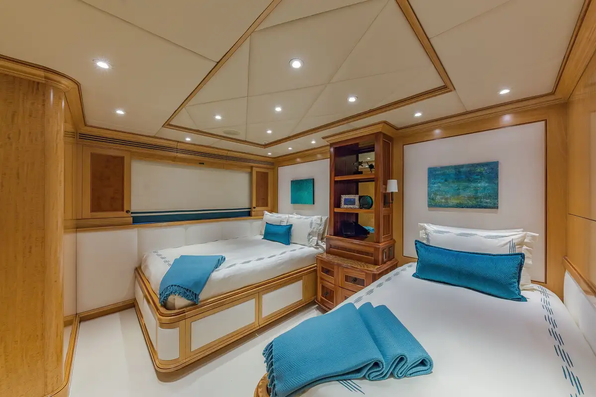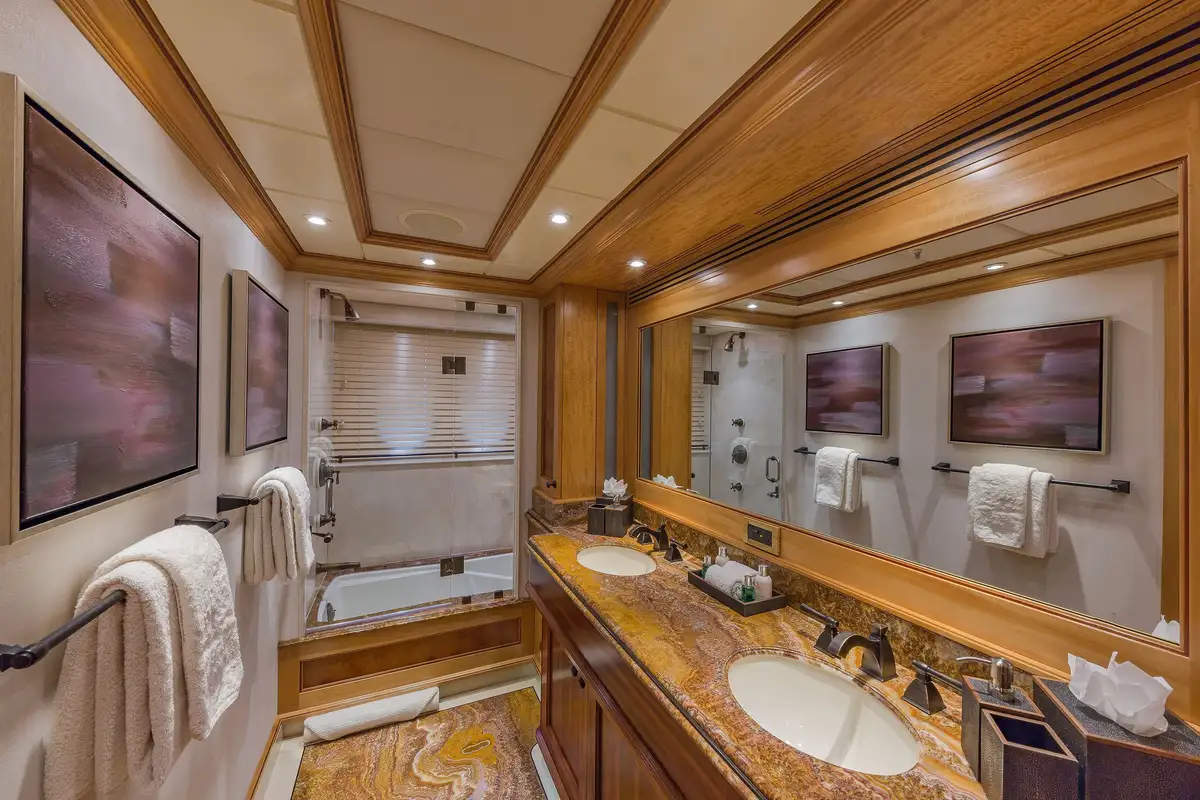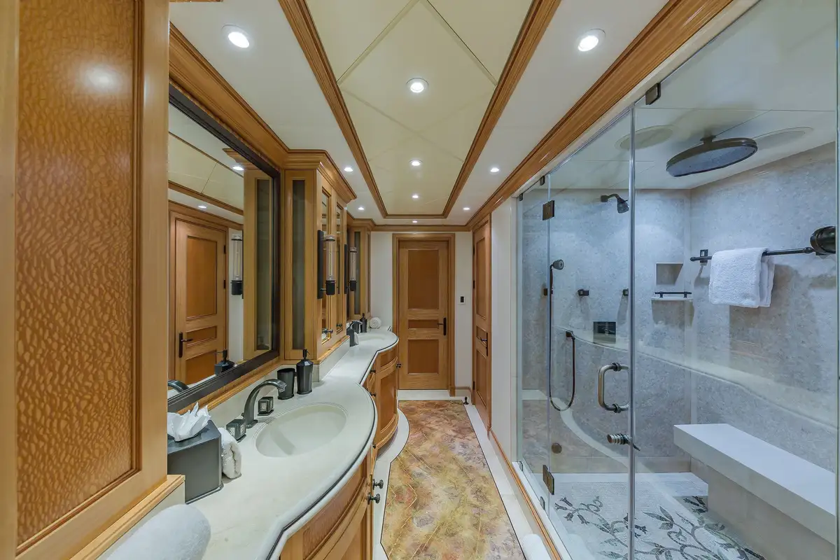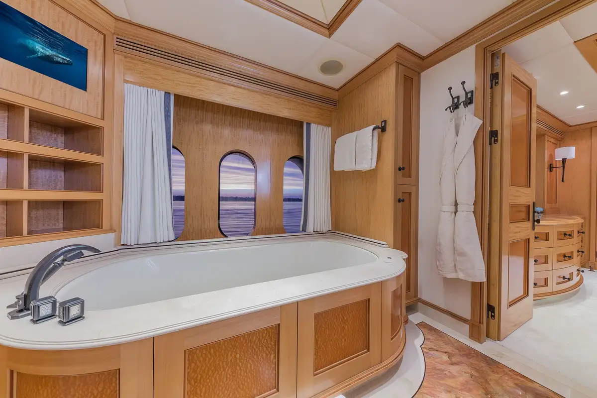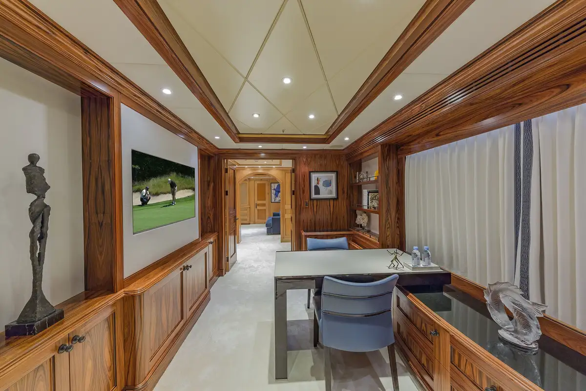 Many areas on board will improve your charter in ways other yachts cannot match. The master suite is one such space. As you’d expect, it has his and hers walk-in wardrobes and a large en suite bathroom (with a separate shower compartment, and a spa bath next to windows that give you a sense of place), there is a lounge space and a private office, but in addition there’s an adjoining nanny/family cabin with a separate en suite bathroom and you holiday with your young family close by, and not on a different deck.