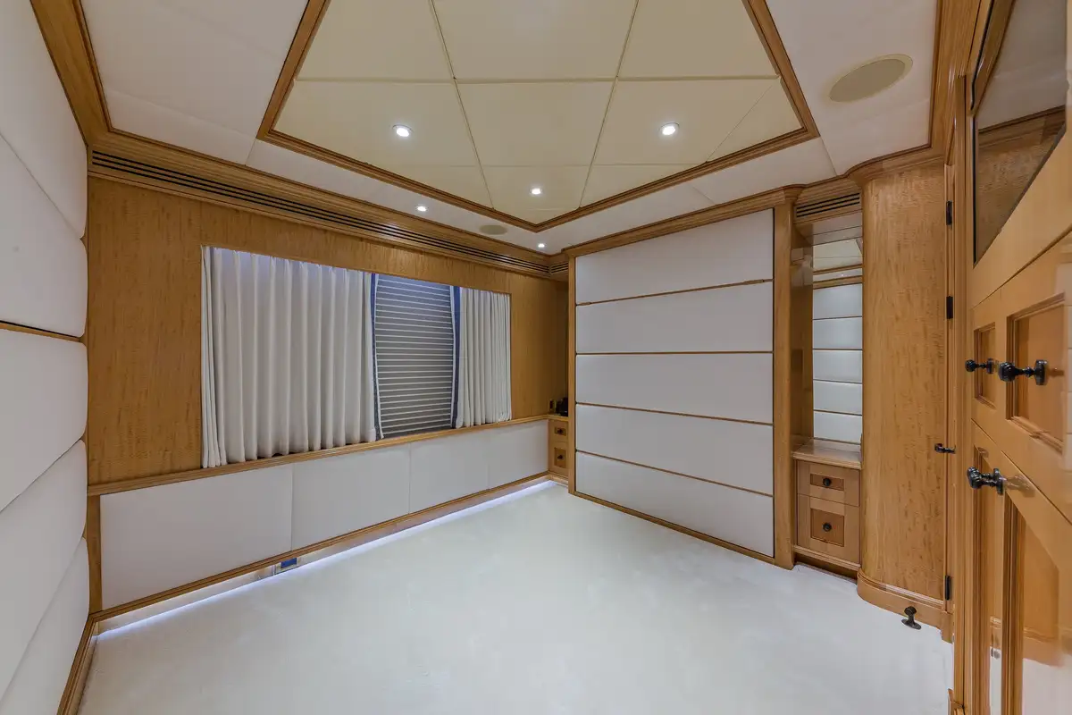 The guest suites are on the lower deck. There are two double VIP suites to the rear and two twin-berth cabins ahead, the both twin cabins offer a double and single berth as well as a pullman berth – again, increasing UNBRIDLED’s versatility. But we’re not finished. Invariably, there will be a guest who needs some office space, and rather than having to share the master suite’s facilities, there is a guest office on the lower deck.