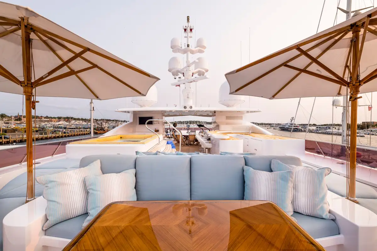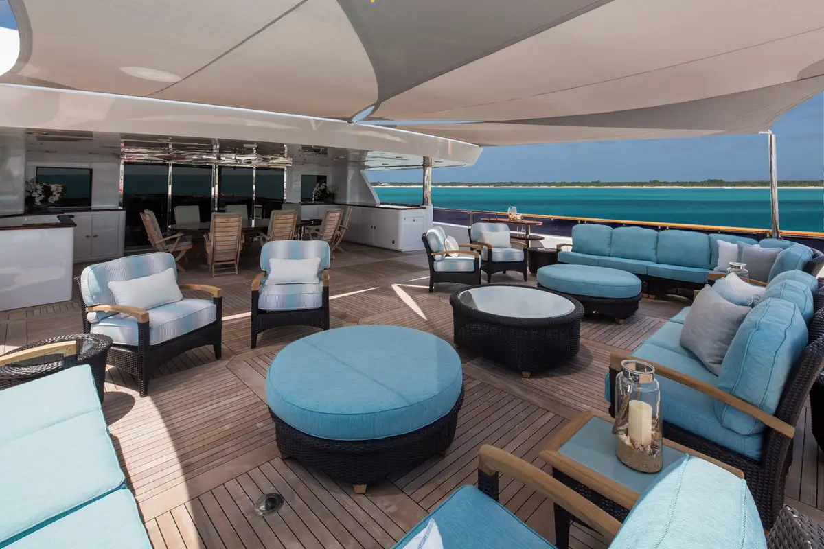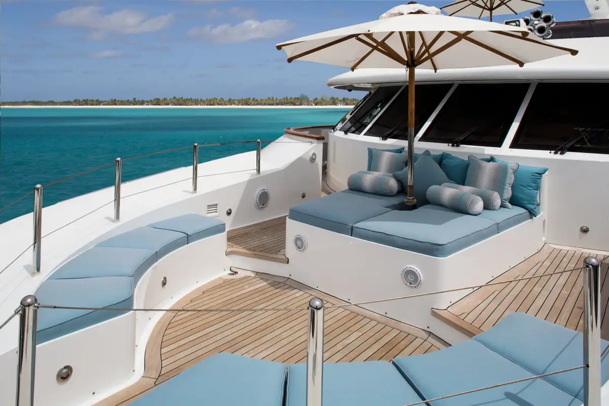 On the sun deck above UNBRIDLED’s features continue. You’ll emerge from the stairs to see a wet bar in front of you. Towards the bow are the jacuzzi and an expansive sunpad that’s big enough for everyone. There’s a shaded dining area amidships, and on the aft deck is a BBQ, exercise equipment and sun loungers.