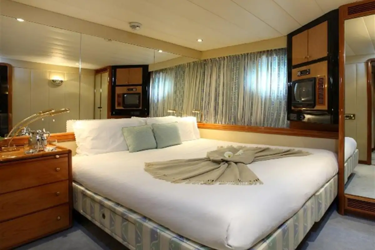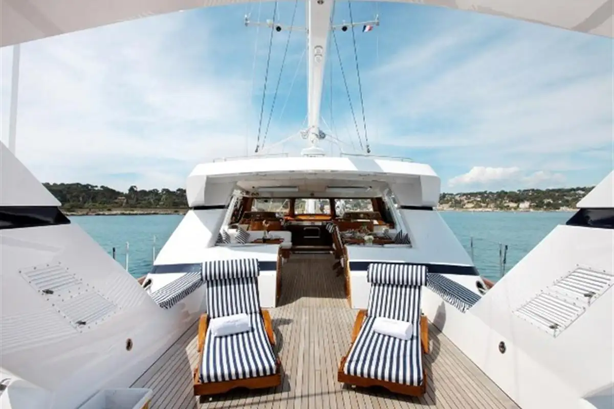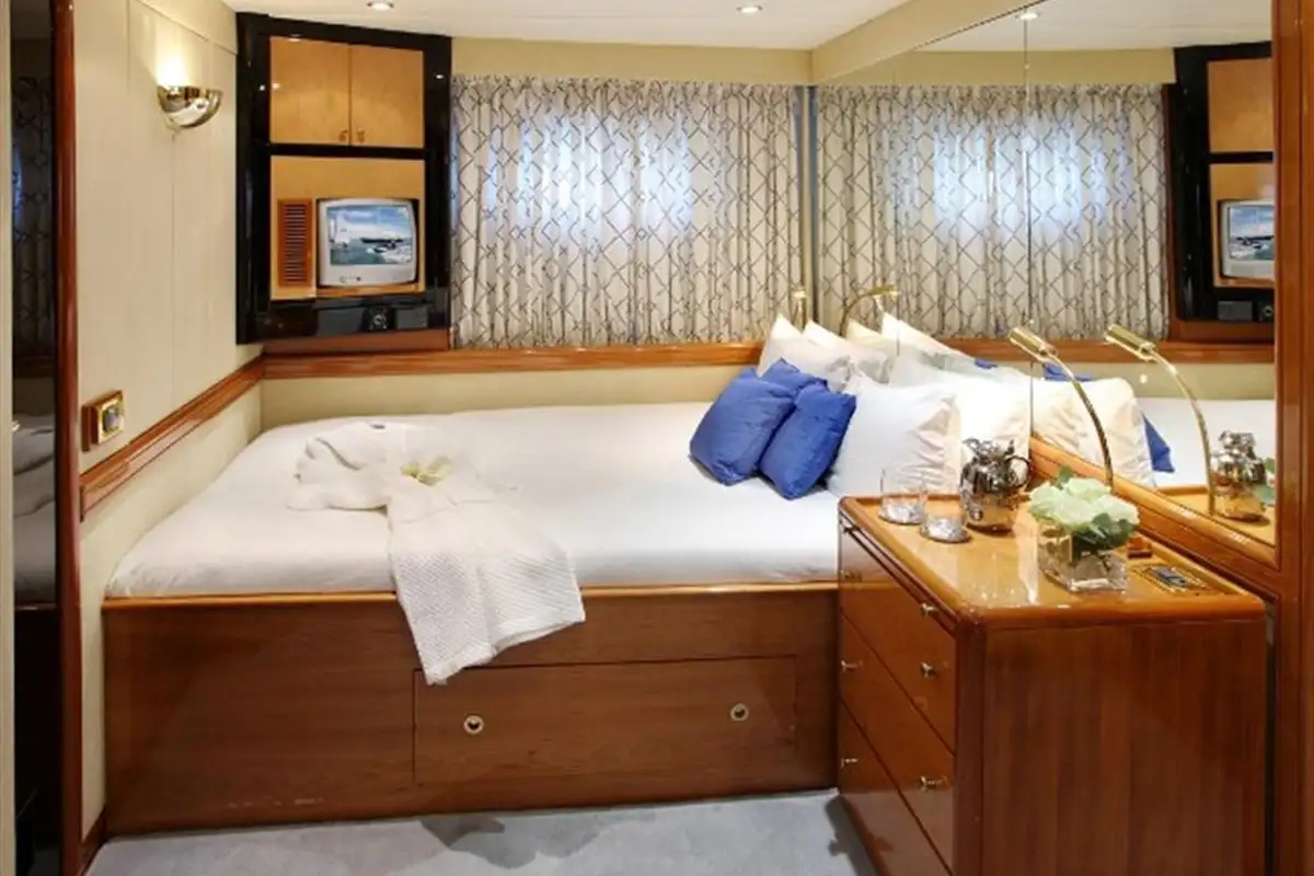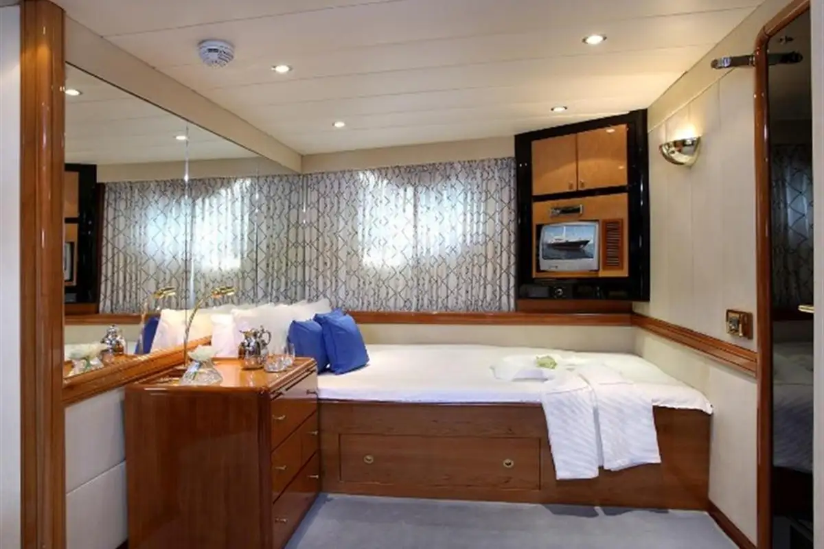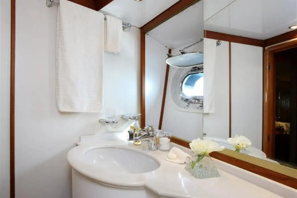 She can easily accommodate up to ten guests in five large, stylish cabins with attractive flexible arrangements. The configuration features a full-beam master cabin aft, as well as four twin cabins which can be converted into doubles.