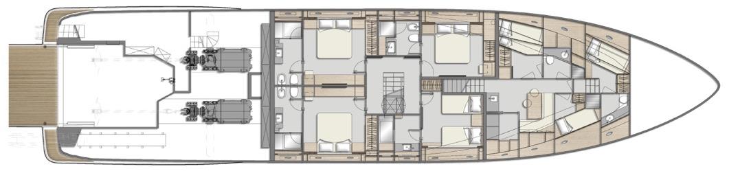 Accommodating up to 11 guests across five beautiful cabins, the master cabin can be found on the main deck, while the remaining accommodation is comprised of a VIP cabin, two doubles, and one twin. With a dedicated crew of six on board, every need will be met with service that goes above and beyond.
