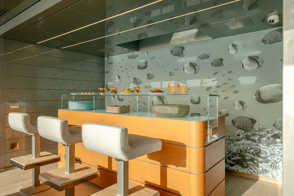 Get your morning workout in early on the yacht’s exercise equipment before joining everyone for a hearty, healthy breakfast in the main deck dining area. Then descend to the spectacular beach club where a morning of fun awaits. UTOPIA IV’s transom folds down to create a colossal swim platform of 70sqm alongside a stylish bar and lounging area, atmospherically illuminated by a glass-bottomed jacuzzi on the deck above. If you crave some action, UTOPIA offers a great selection of fun watertoys for all abilities.