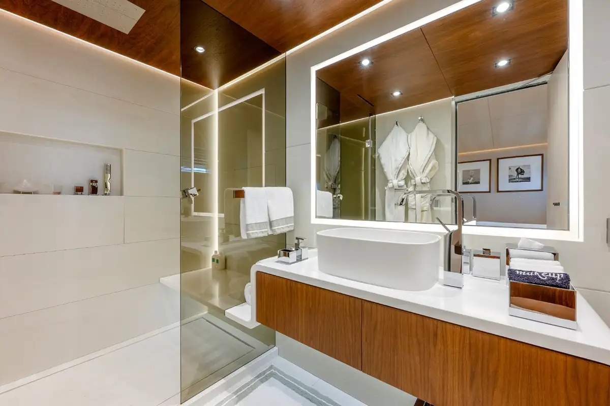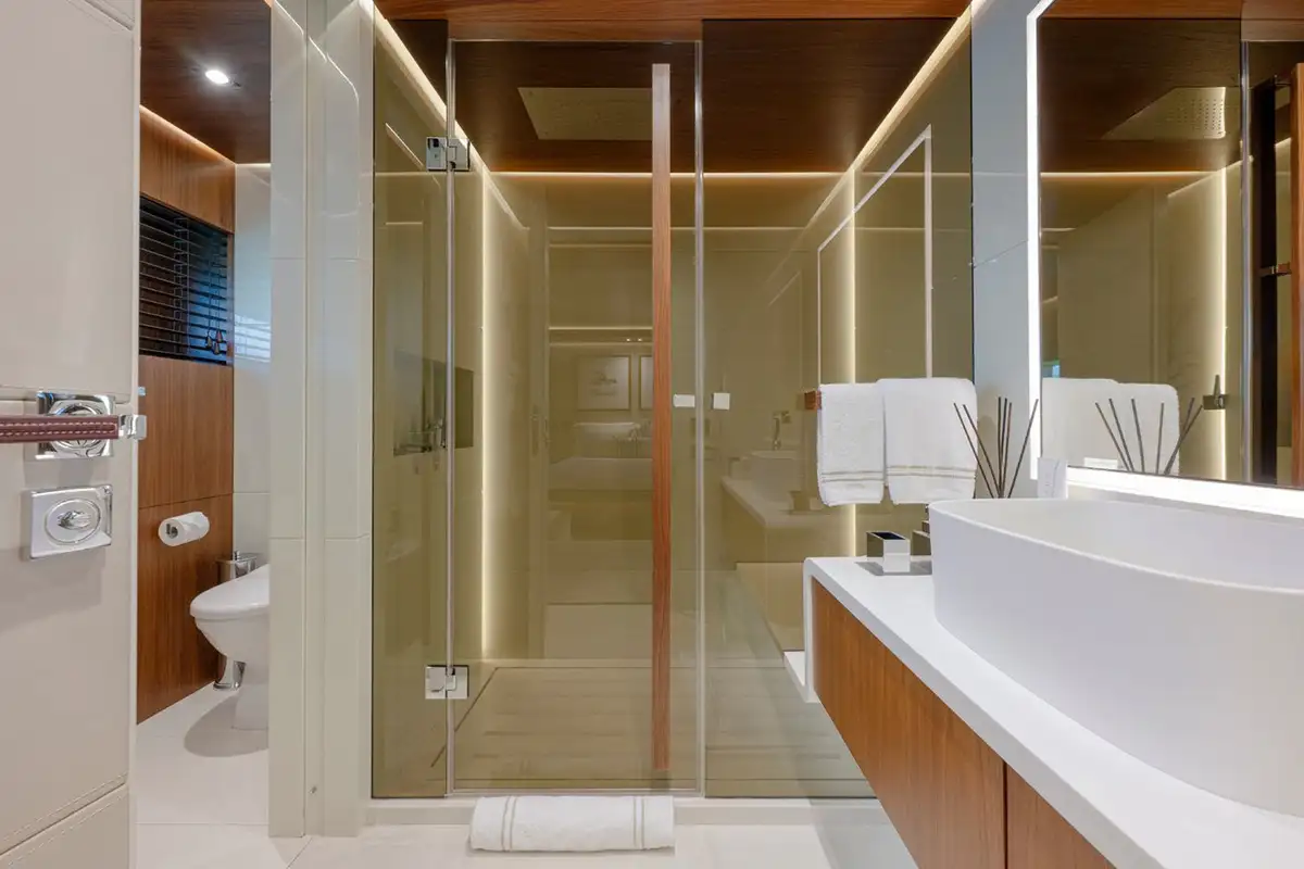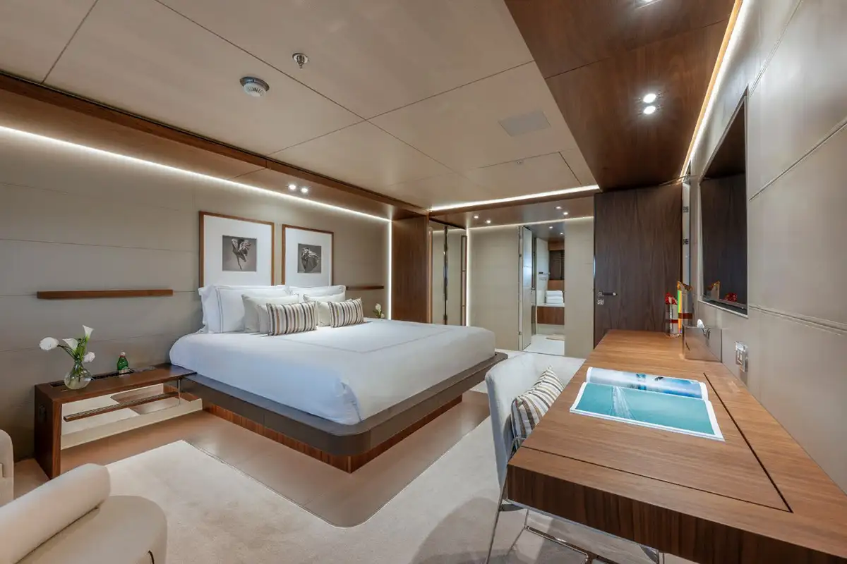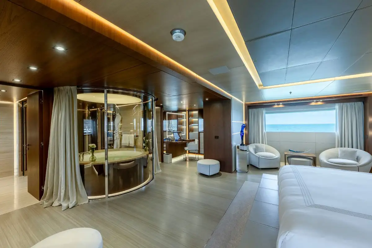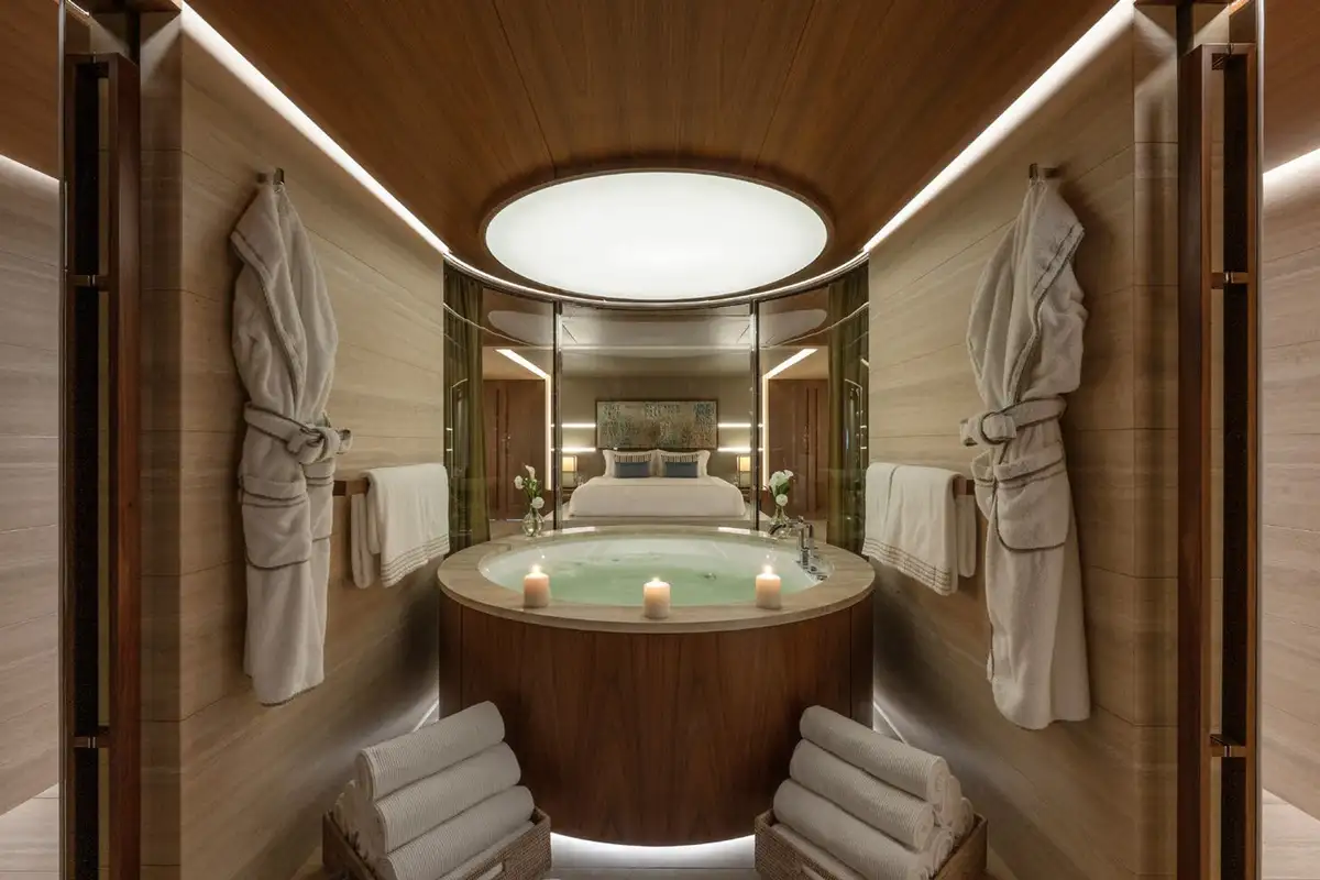 - Main deck master cabin with vanity suite, luxurious bathtub, and private balcony