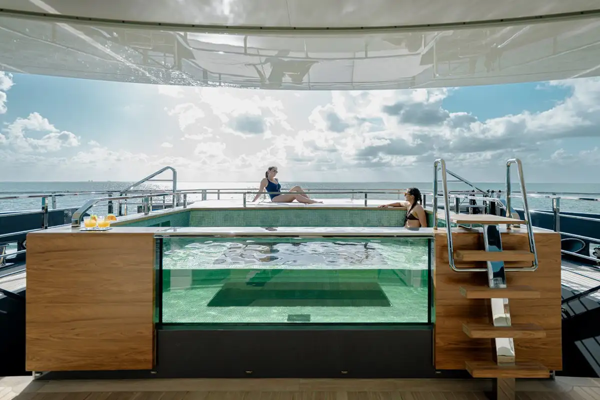 Enjoy a BBQ lunch with commanding views on the upper deck, then while away a few leisurely hours on the sun deck loungers or in one of the three pools on board, cocktail in hand. The seating and sun pads on the Portuguese bridge provide the best views on board as the captain moves UTOPIA IV to a new anchorage that is within easy reach of a glamorous port town. Thanks to her powerful engines, UTOPIA IV has an impressive cruising speed of 24 knots, so she makes light work of trips between the coastline’s hotspots.