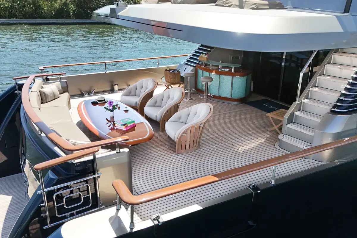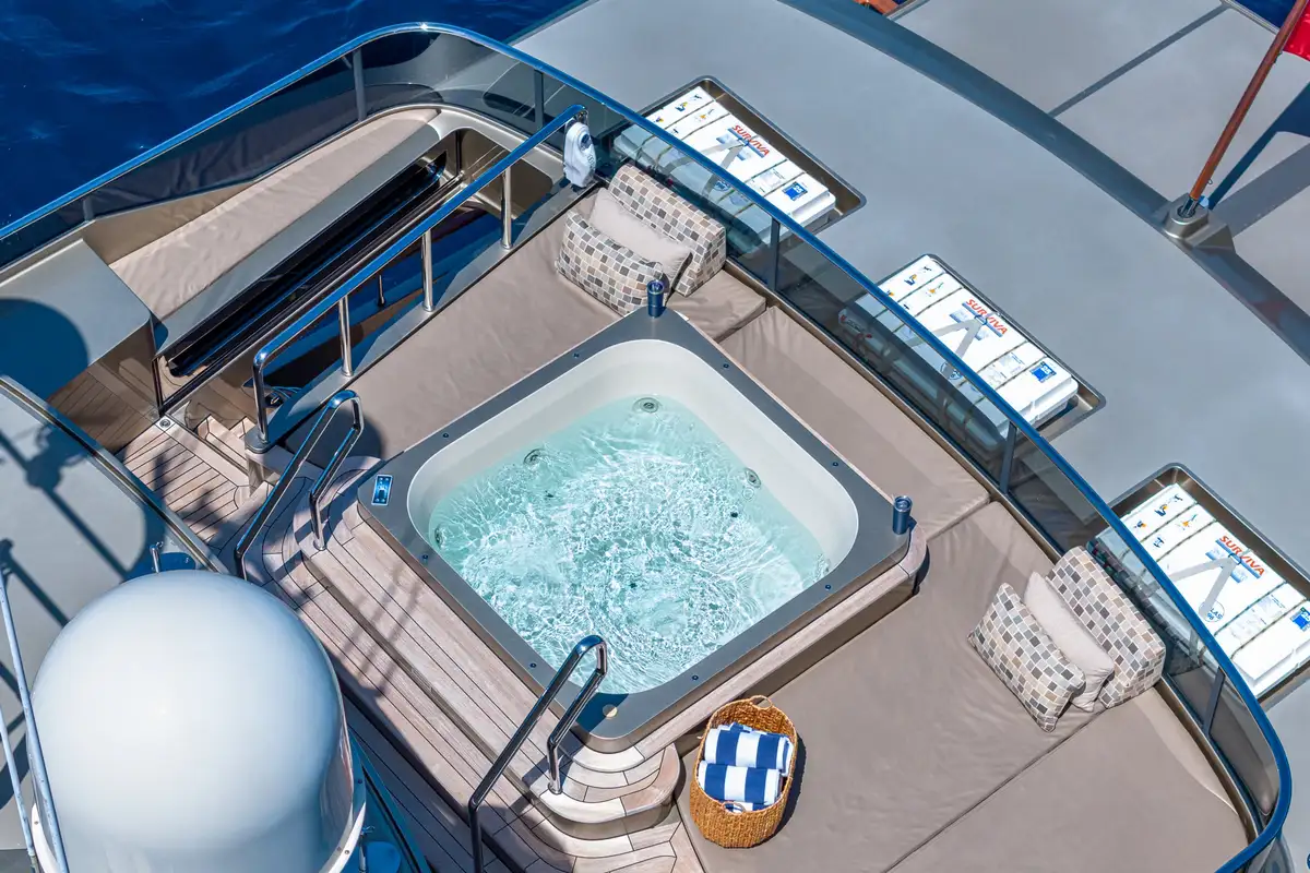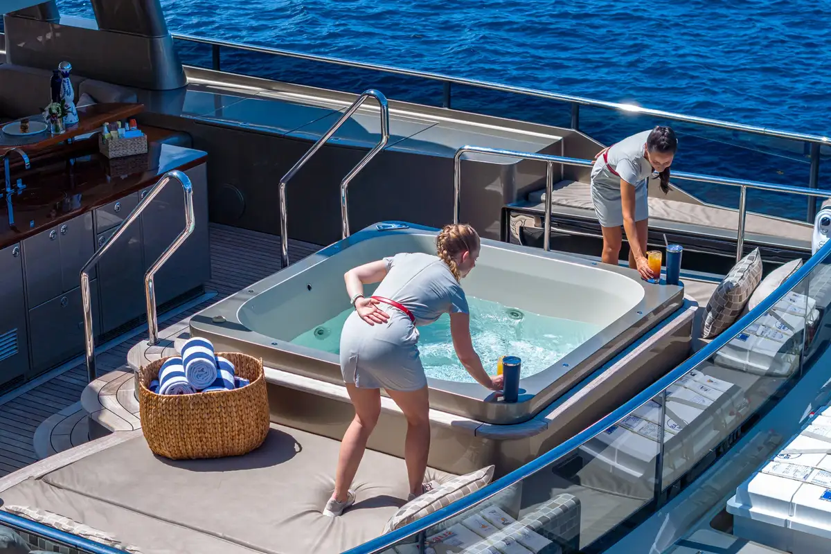 Head up to the flybridge and explore a variety of entertainment options. Whether rejuvenating in the warmth of the jacuzzi, enjoying sunset cocktails at the bar, or reclining in one of the abundant lounge areas, the sun deck is a sanctuary for leisure and revelry.