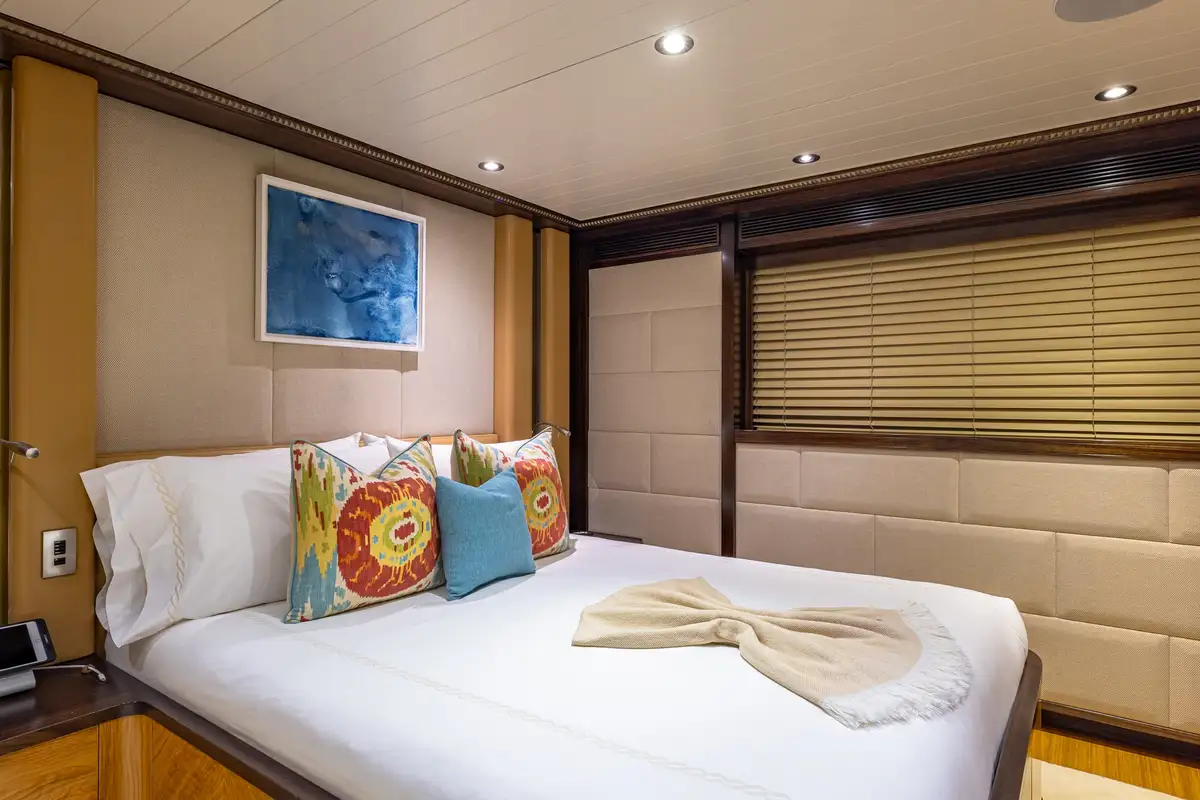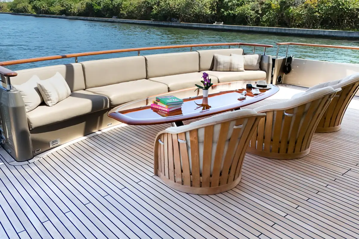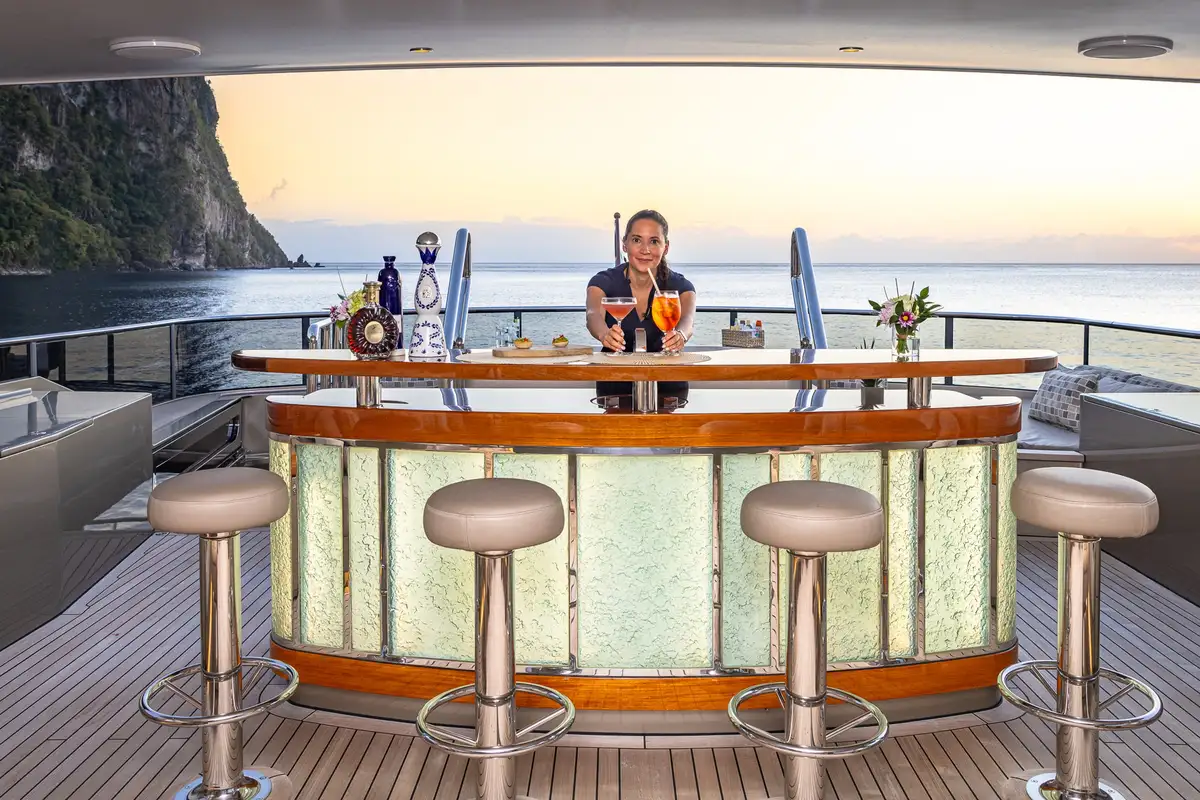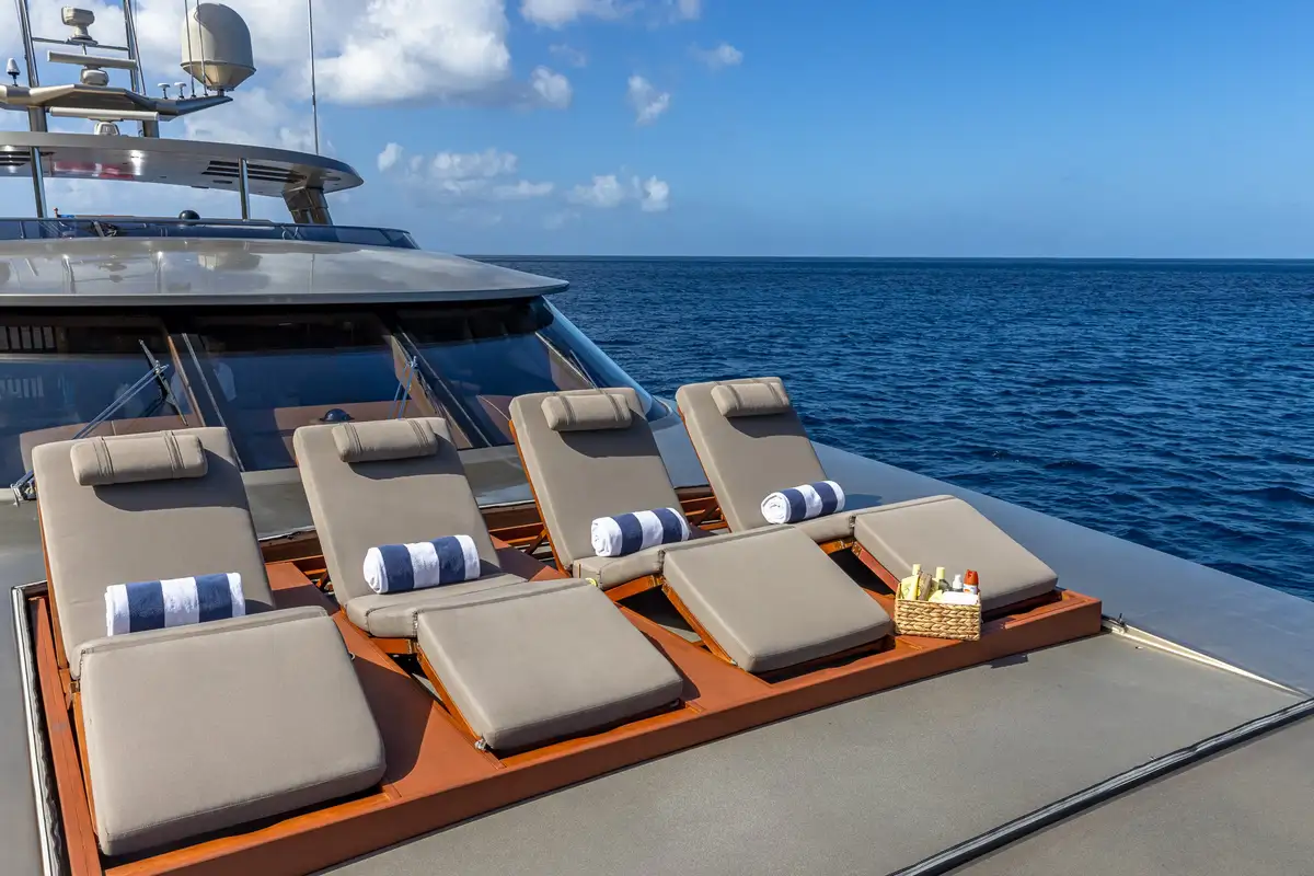 Head up to the flybridge and explore a variety of entertainment options. Whether rejuvenating in the warmth of the jacuzzi, enjoying sunset cocktails at the bar, or reclining in one of the abundant lounge areas, the sun deck is a sanctuary for leisure and revelry.