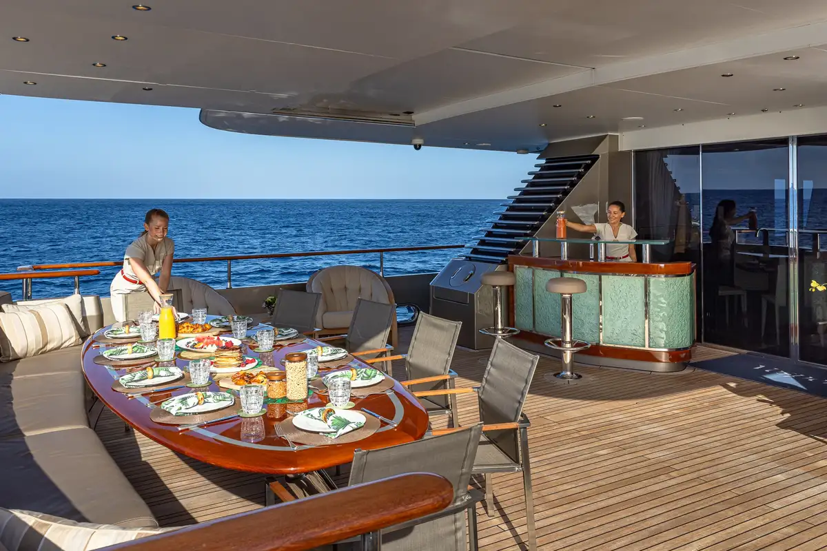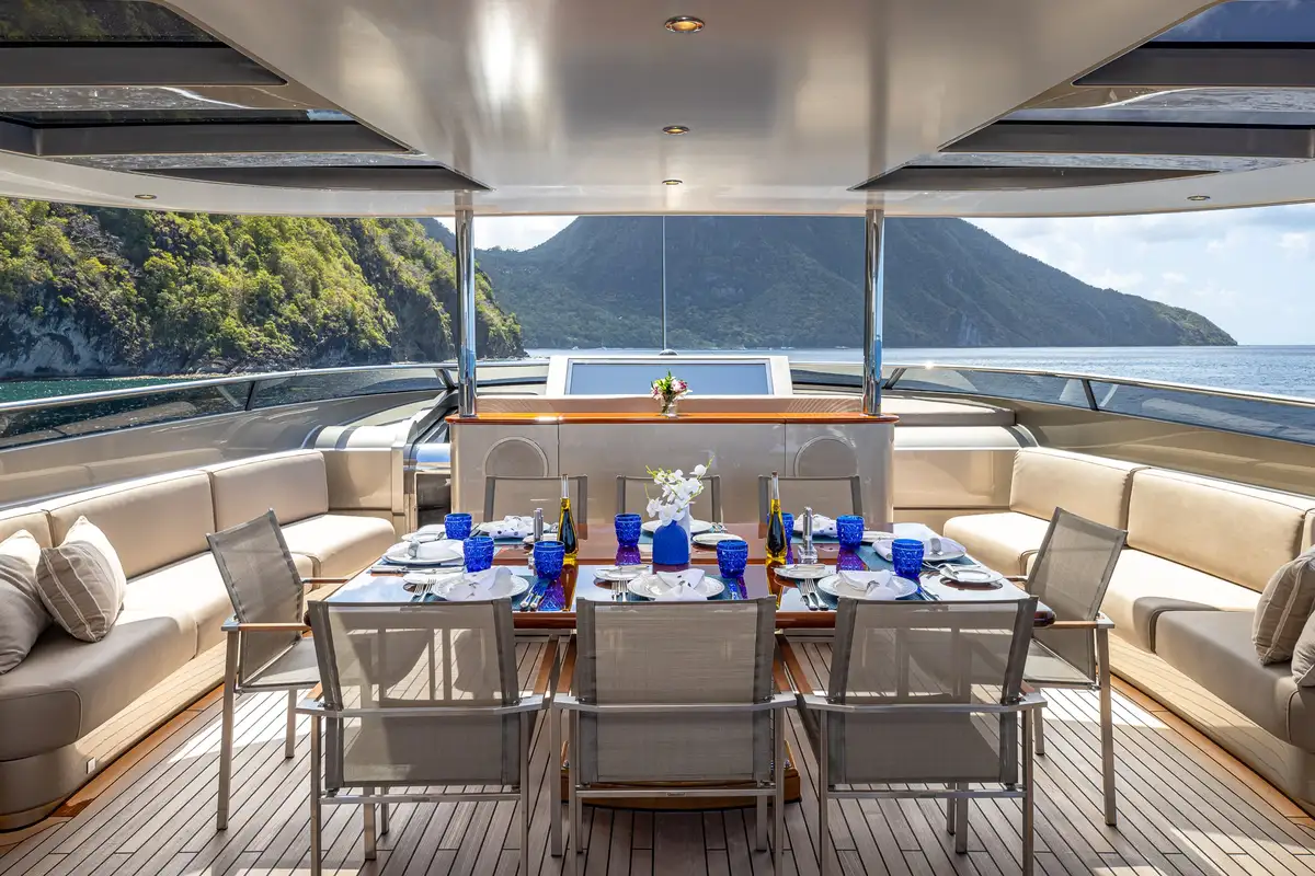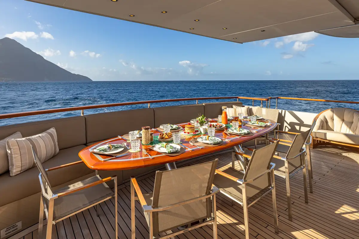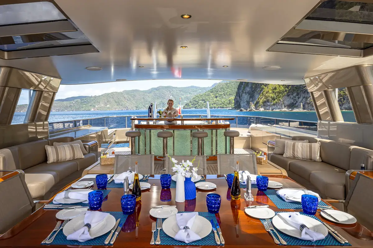 Savour exquisite culinary delights in three distinct dining areas, each hosting ten guests in refined elegance. Whether choosing to dine indoors or embrace the ocean breeze of the flybridge and main deck aft, each meal is bound to be remarkable.