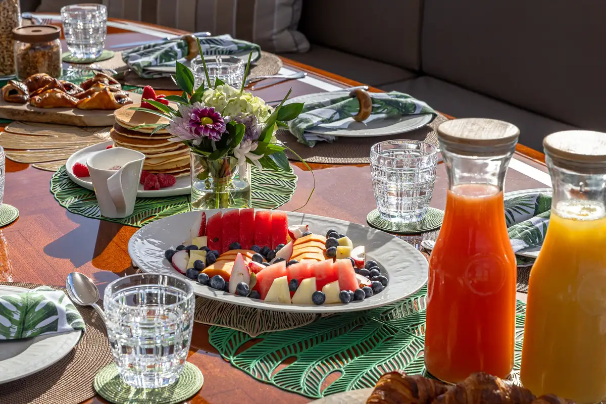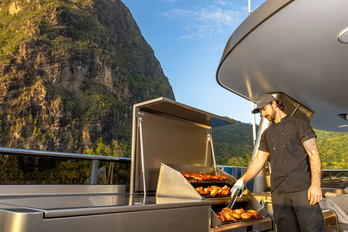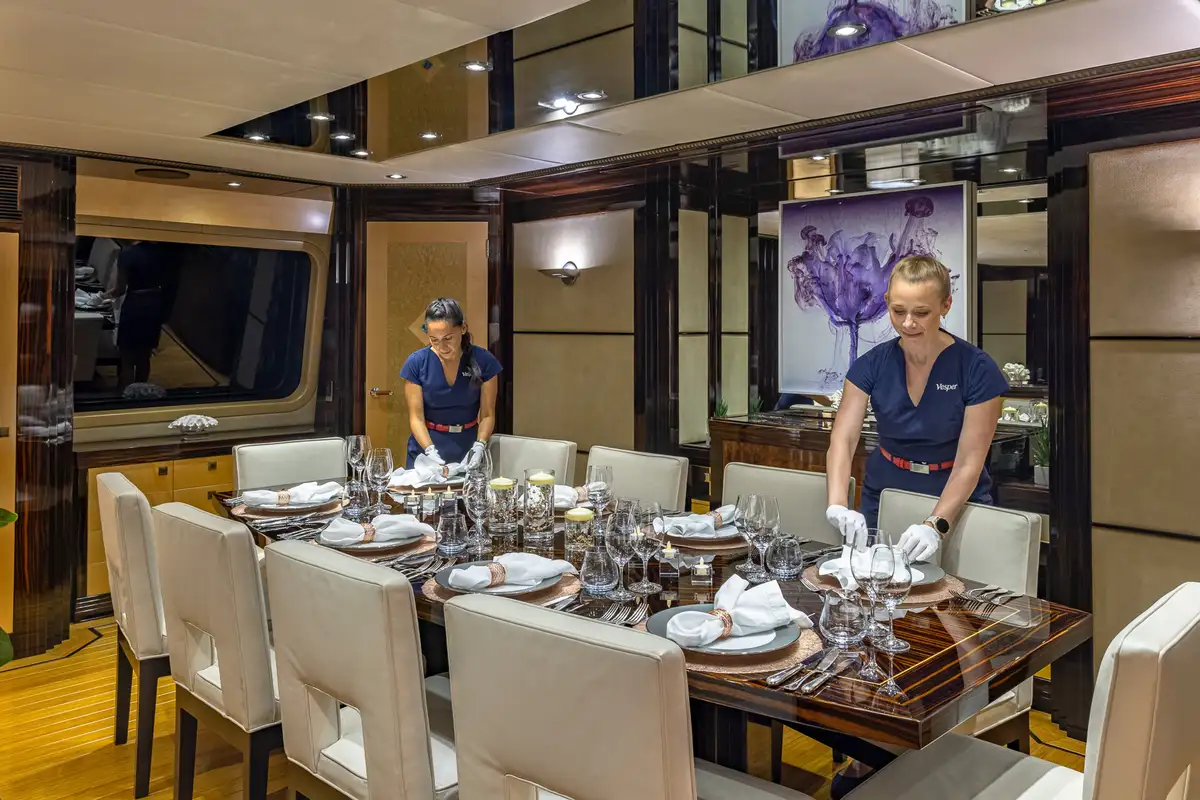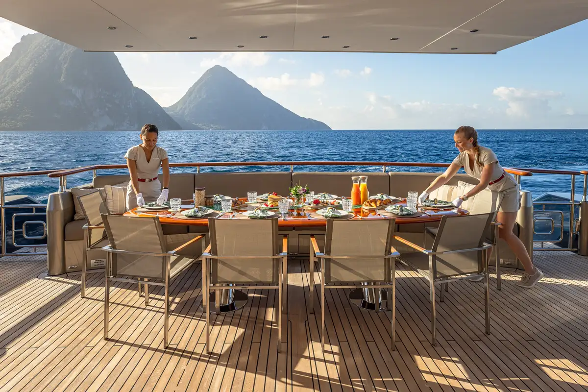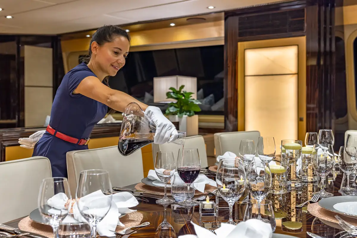 Savour exquisite culinary delights in three distinct dining areas, each hosting ten guests in refined elegance. Whether choosing to dine indoors or embrace the ocean breeze of the flybridge and main deck aft, each meal is bound to be remarkable.