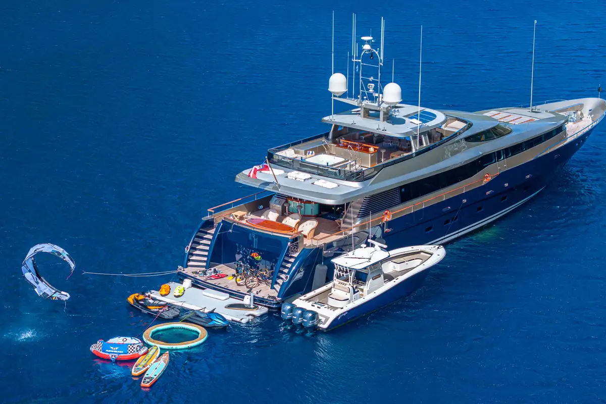 The swim platform is equipped with a convenient shower for rinsing off after a day of fun, complemented by a spacious full-beam inflatable platform. This expansive area provides ample space for sunbathing, water activities, and easy access to the sea for swimming. Moreover, a side-opening garage ensures a quick deployment of toys for instant guest amusement.