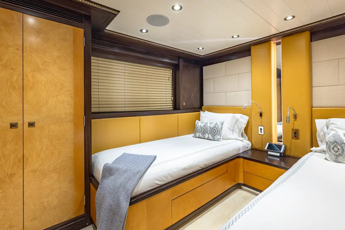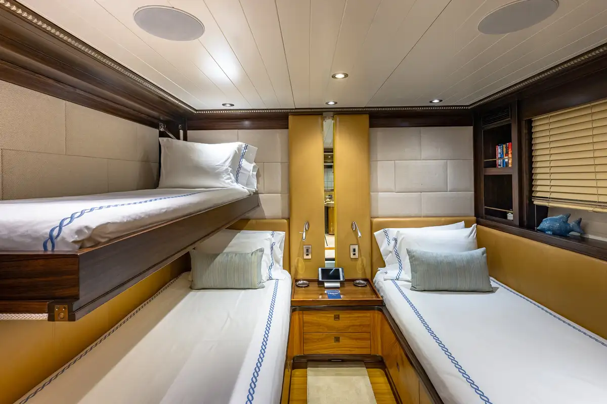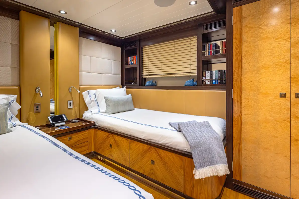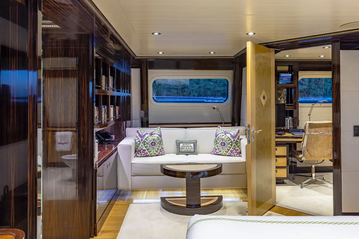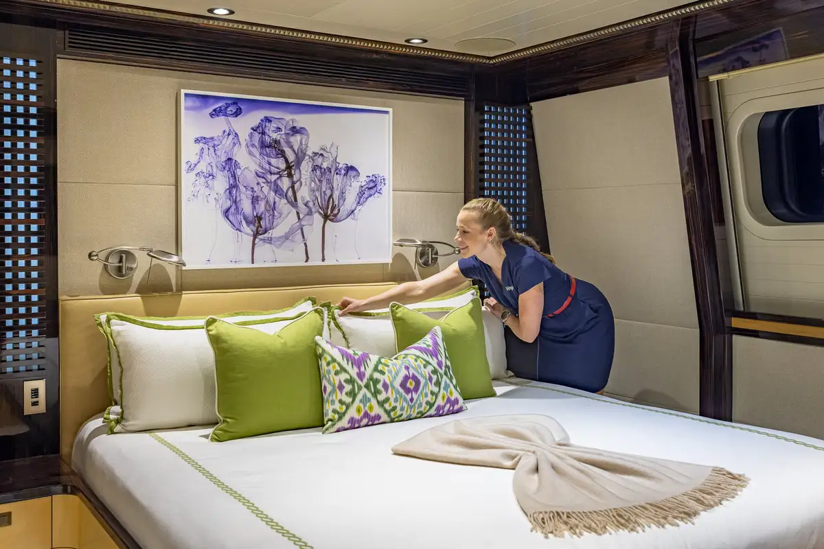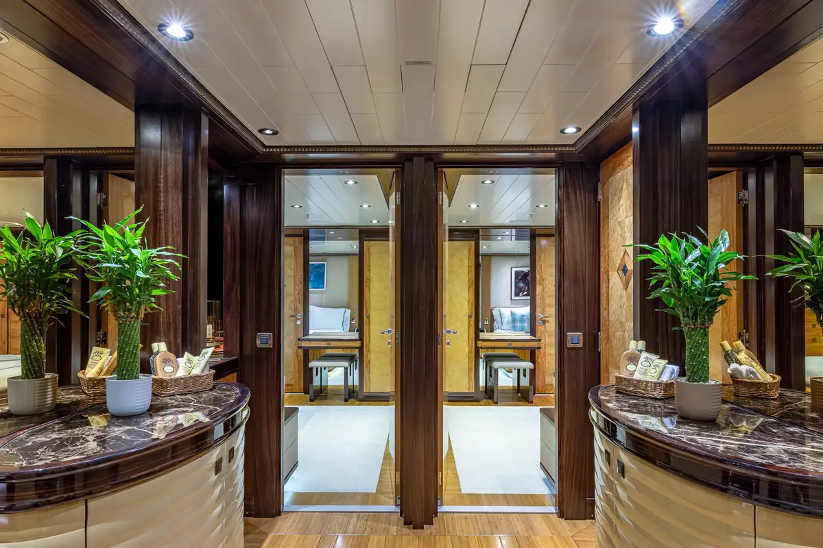 Unwind in the spacious accommodations, where up to 10 guests may find reprieve. The main deck master suite exudes grandeur, featuring a private office, lounge, separate his & hers en suite bathrooms, and a spacious walk-in wardrobe. Below deck, four beautifully appointed cabins offer a haven of tranquility, while two pullman berths ensure ample space for additional guests.