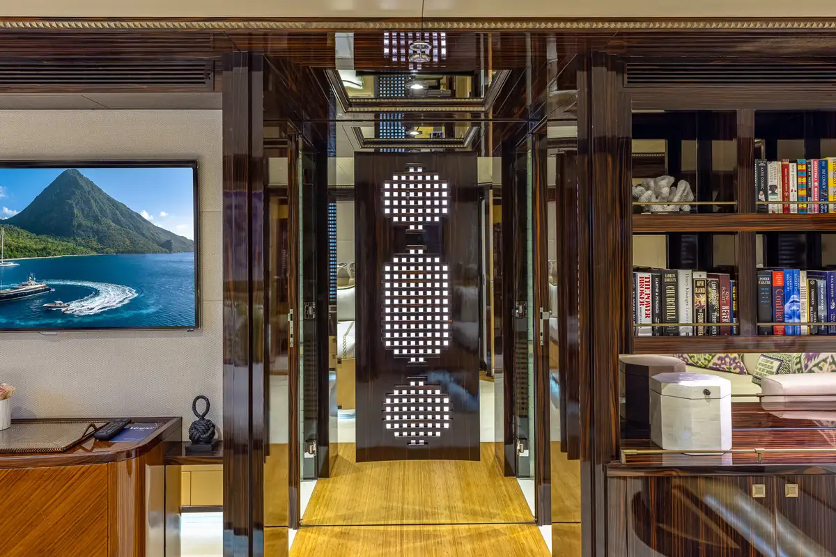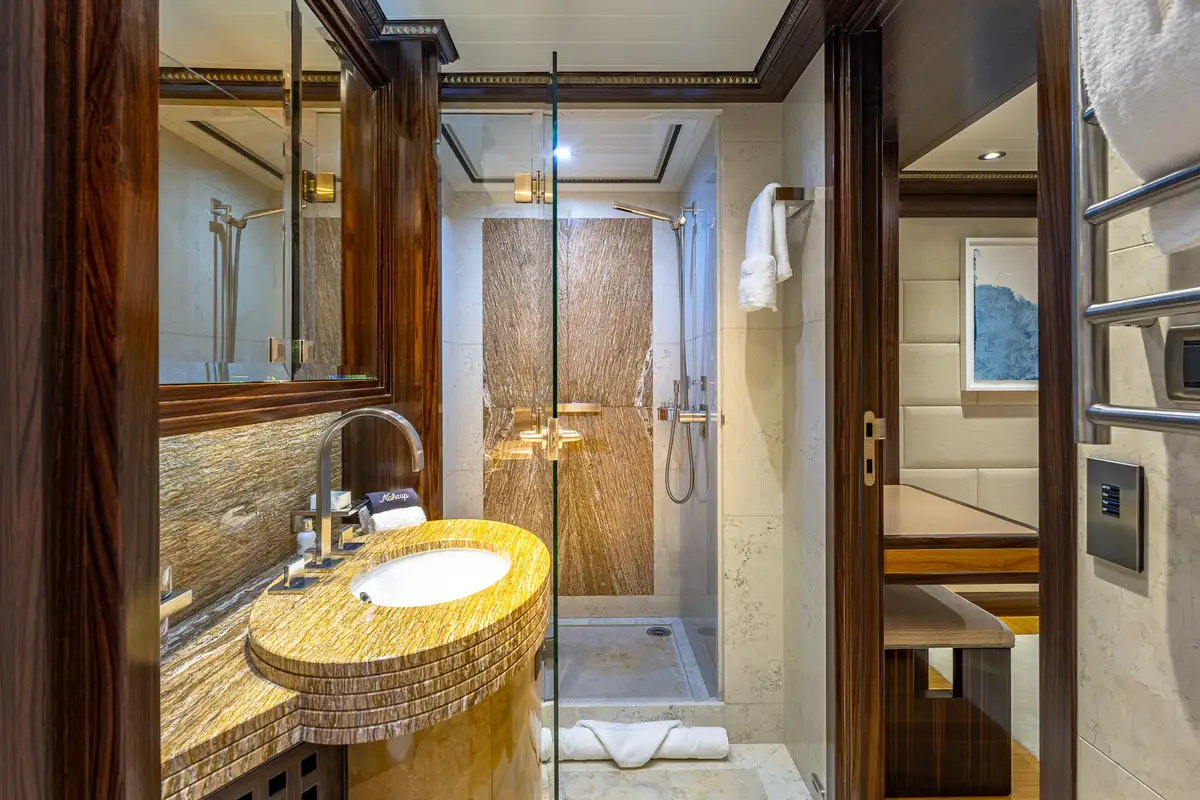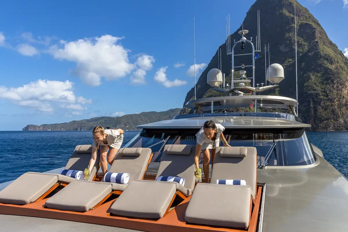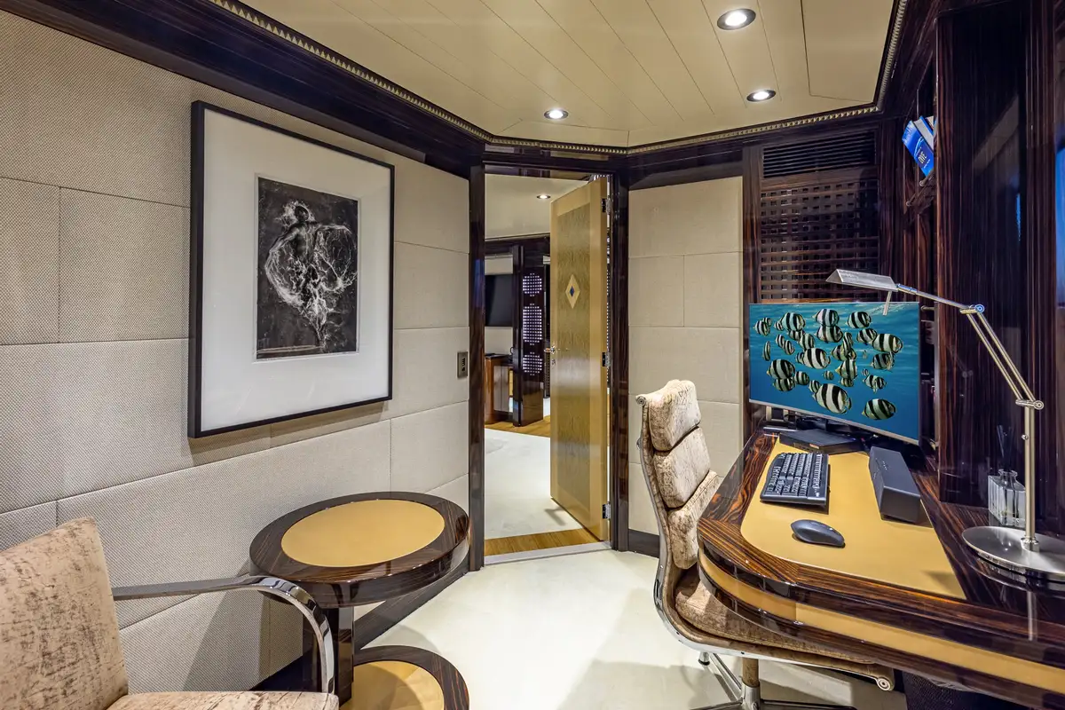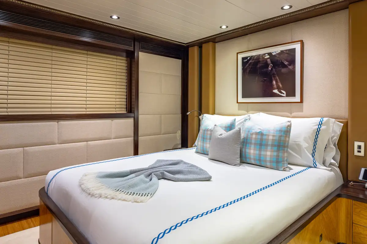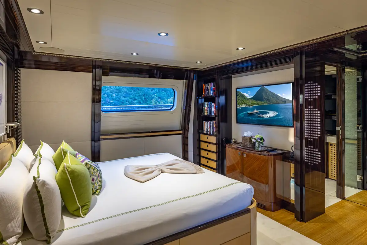 Unwind in the spacious accommodations, where up to 10 guests may find reprieve. The main deck master suite exudes grandeur, featuring a private office, lounge, separate his & hers en suite bathrooms, and a spacious walk-in wardrobe. Below deck, four beautifully appointed cabins offer a haven of tranquility, while two pullman berths ensure ample space for additional guests.