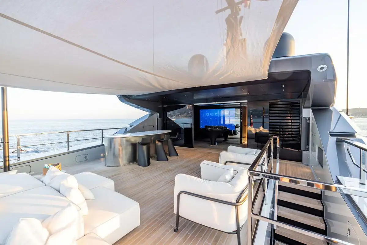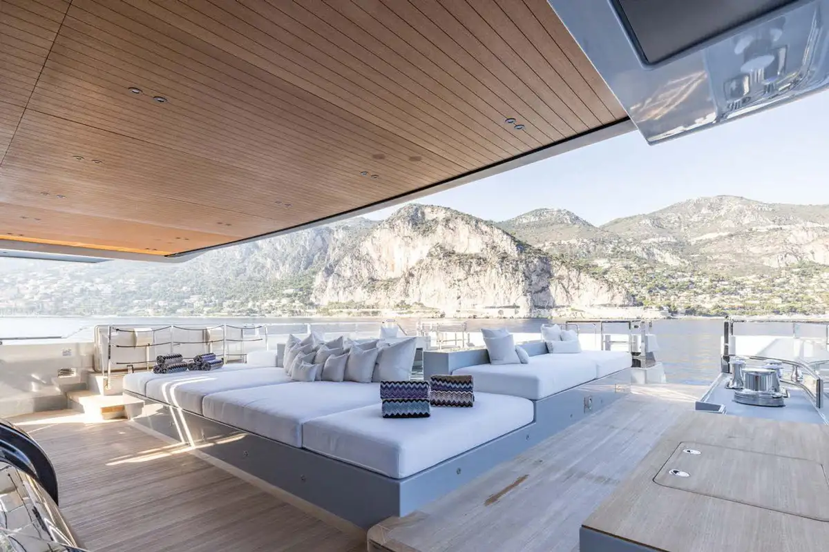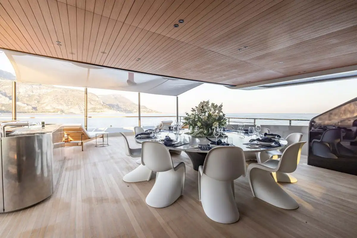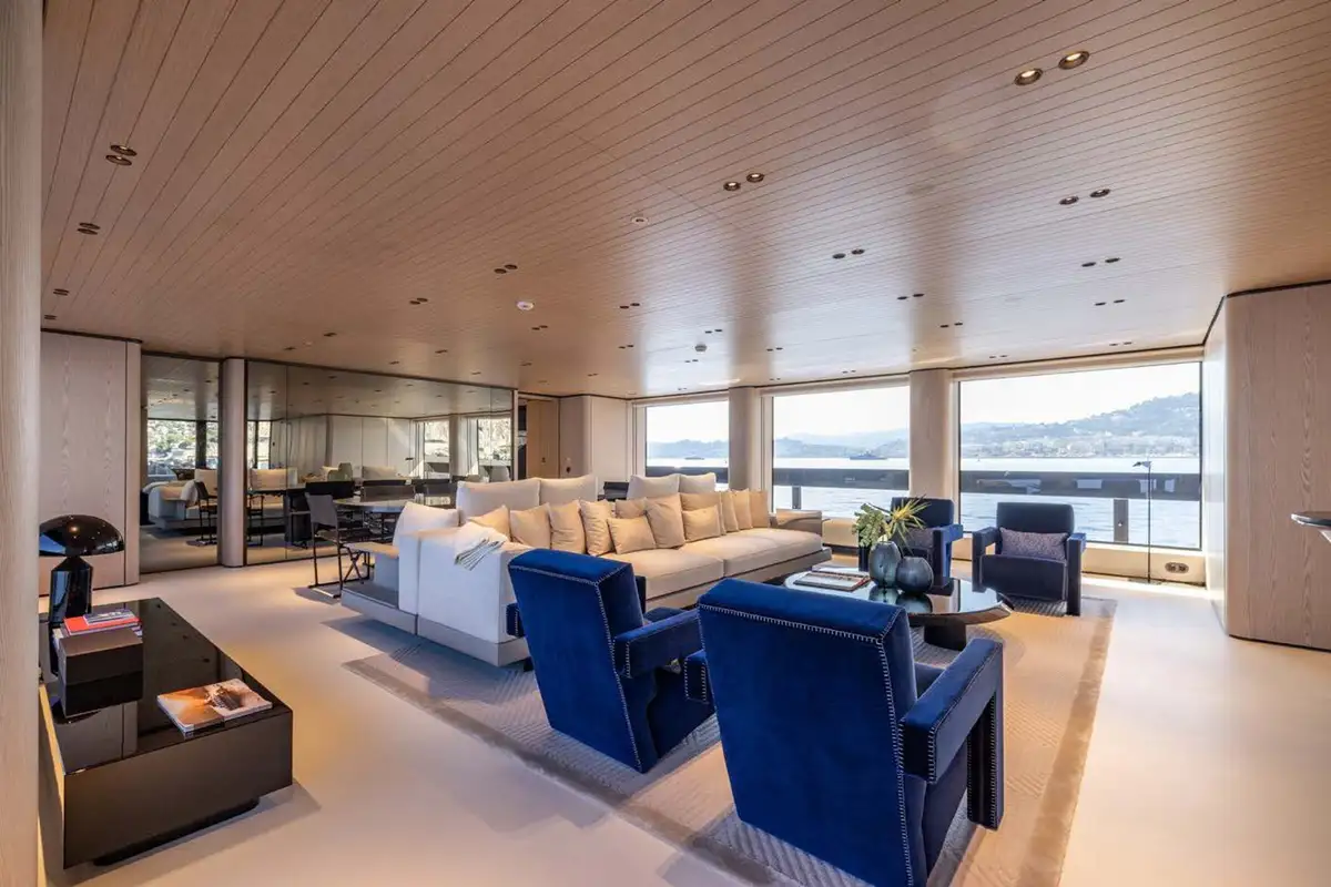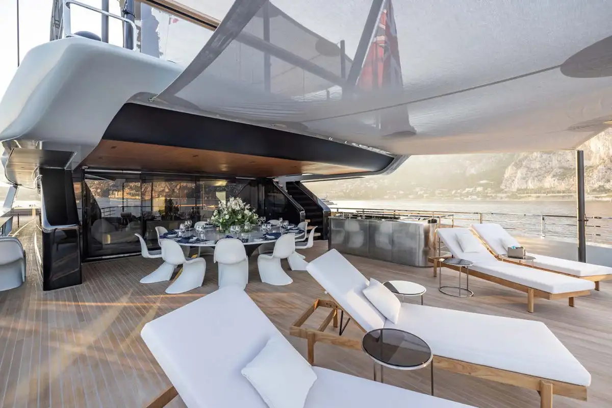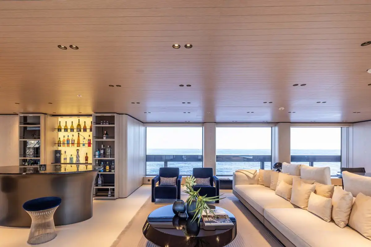 There are three large lounges. The upper deck saloon is effectively the master suite’s living room; then there’s the expansive main deck saloon – ideal for entertaining – with its lounge, dining area and cocktail bar. The beach club lounge, meanwhile, is the perfect place to hang out and unwind while the yacht is anchored for the afternoon, with fold-out terraces on three sides and an almost endless choice of watersports just a few steps away. The beach club also includes a gym, a hammam and a wellness centre.